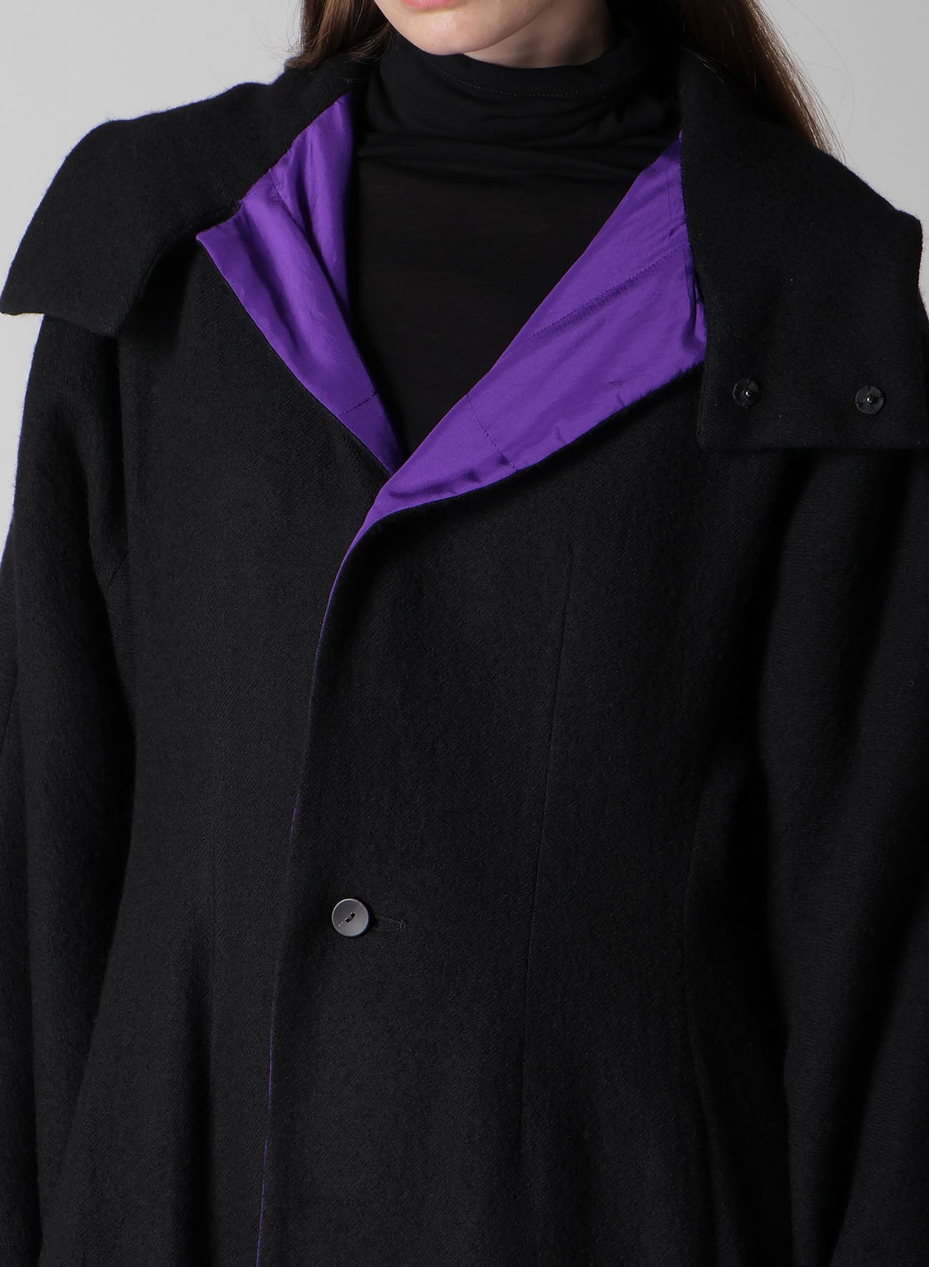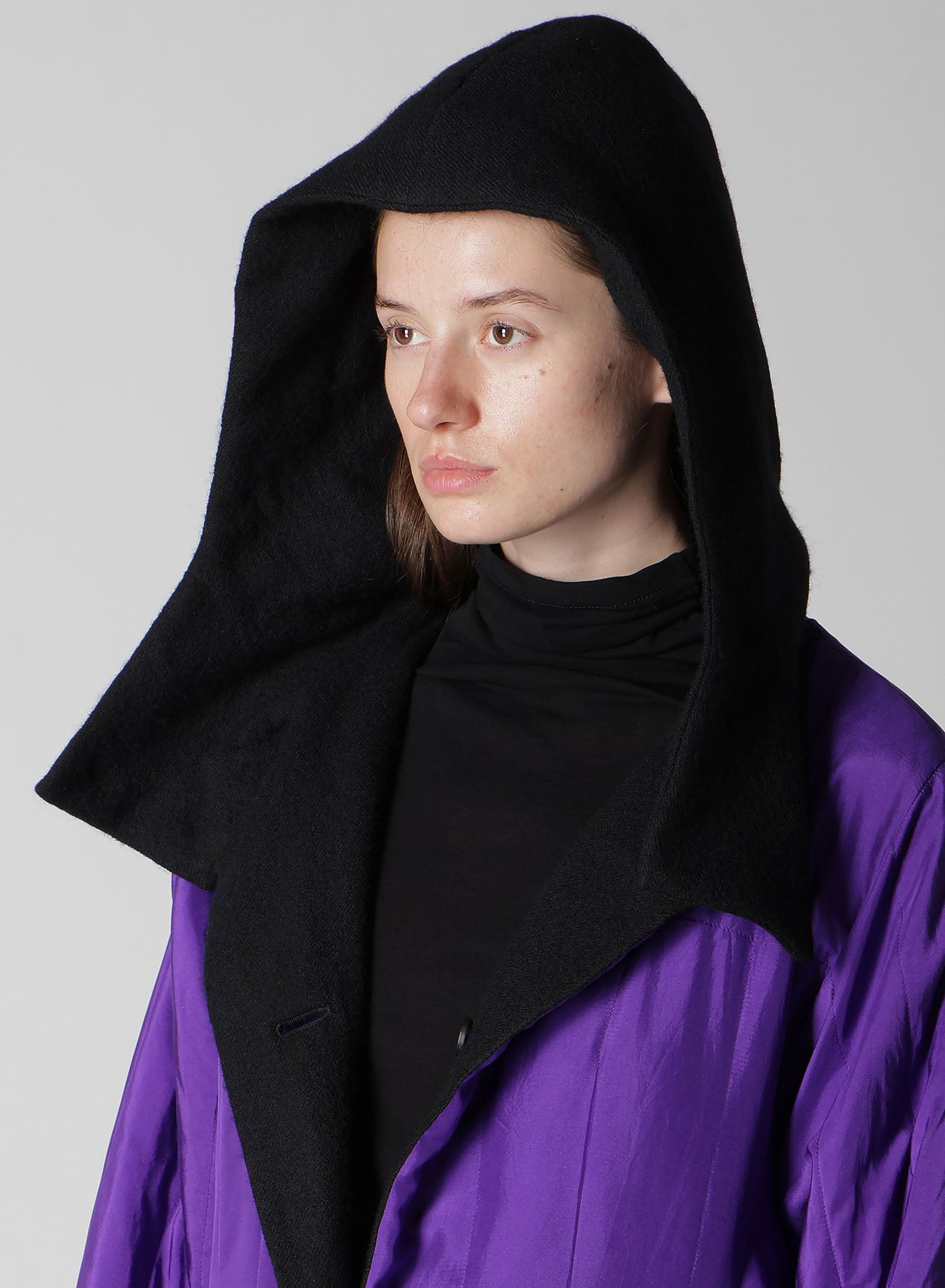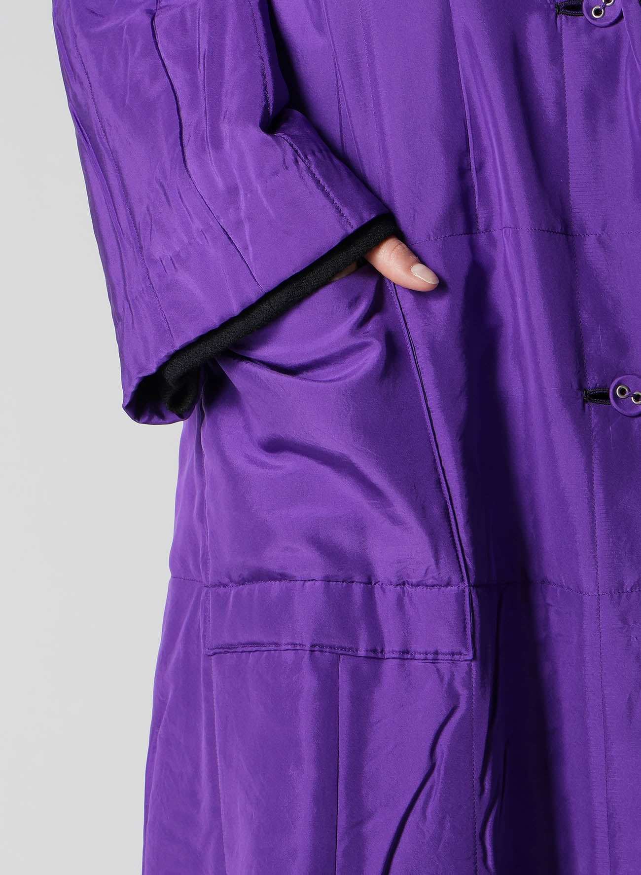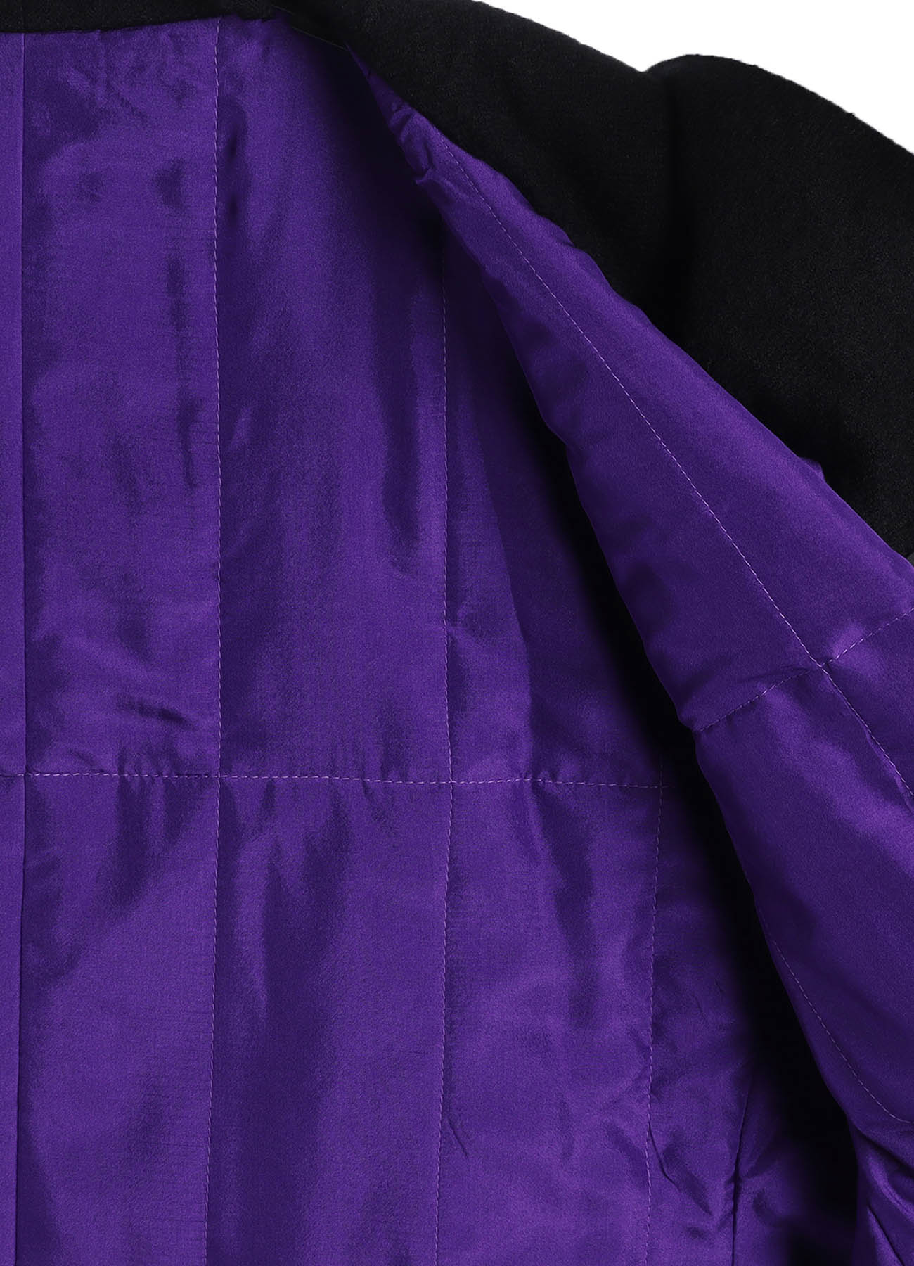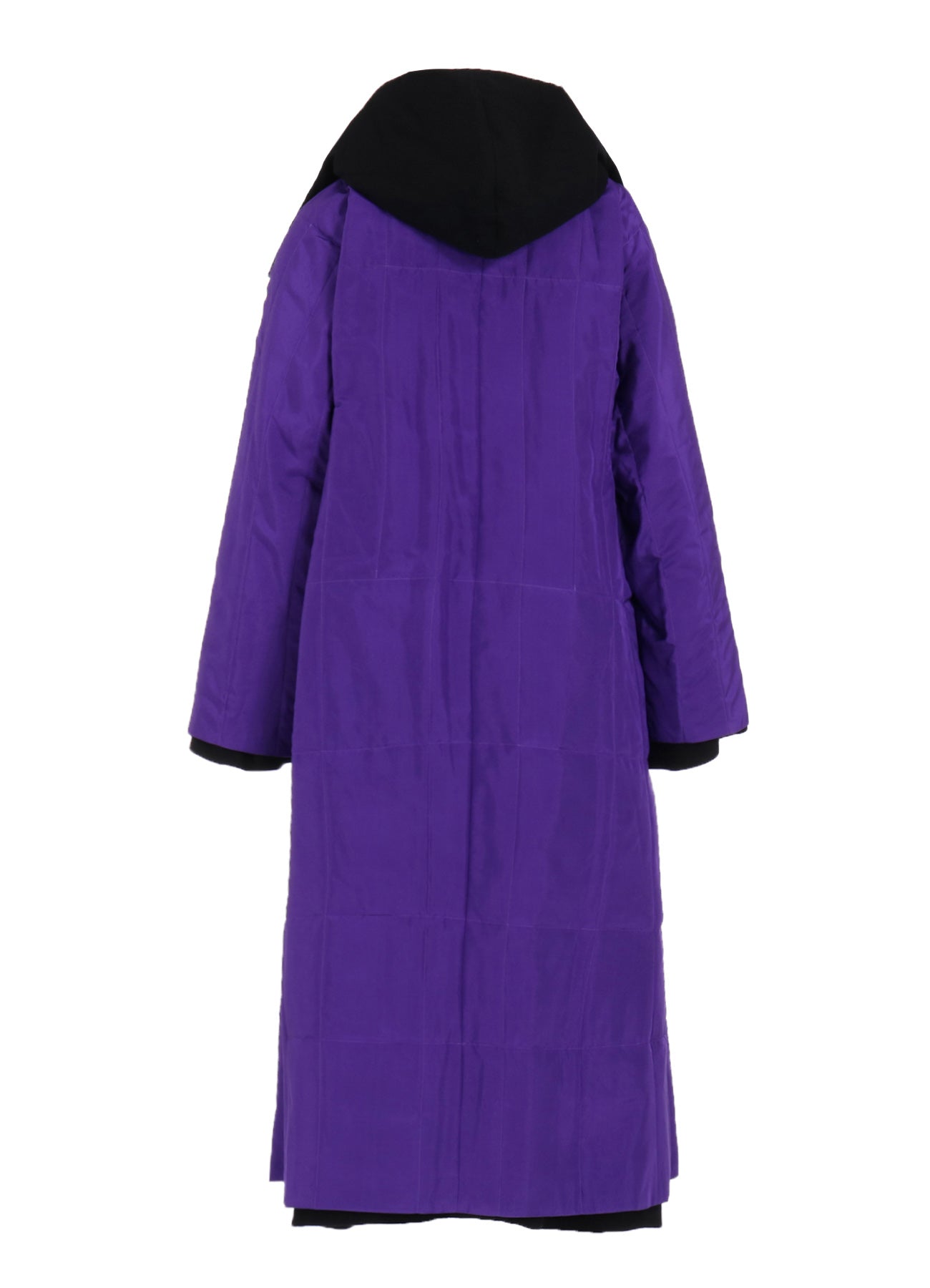 Dieser elegante und lebendige Kapuzenmantel, der im Finale der Paris Collection präsentiert wurde, hat ein wendbares Design und leichte Baumwollpolsterung. Das Seidenmaterial in Violett verleiht Eleganz und verbessert das Gesamtbild. Trotz seiner voluminösen Silhouette sorgt der Stoff dafür, dass er leicht getragen werden kann.