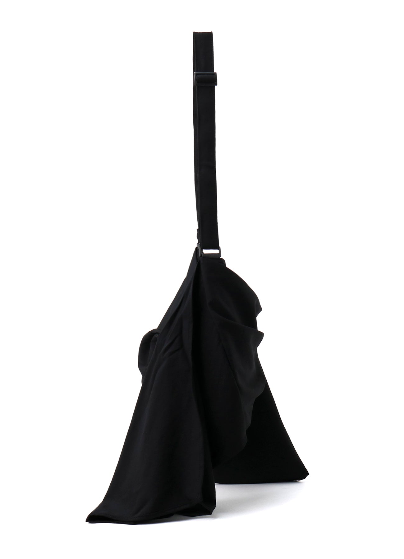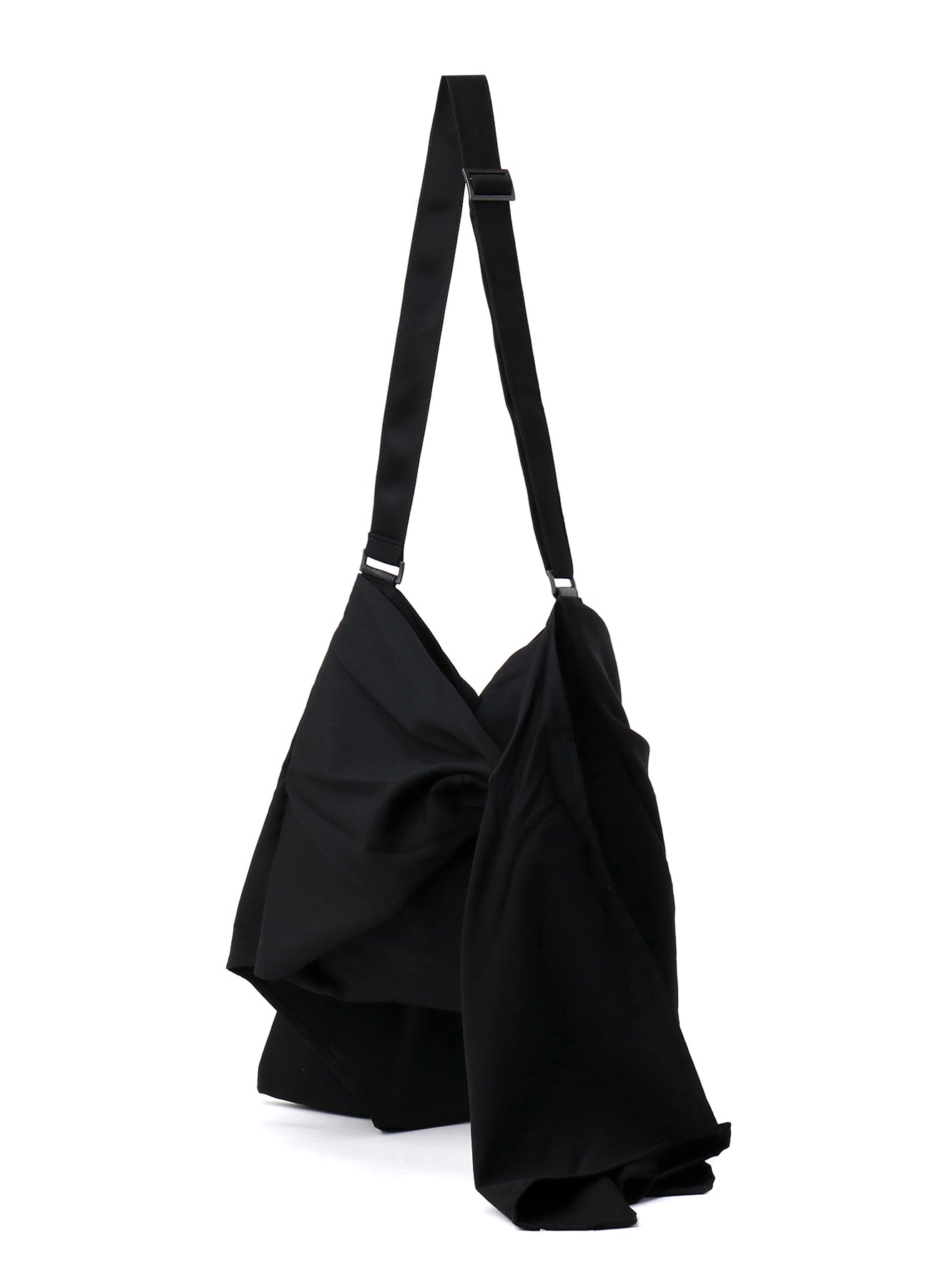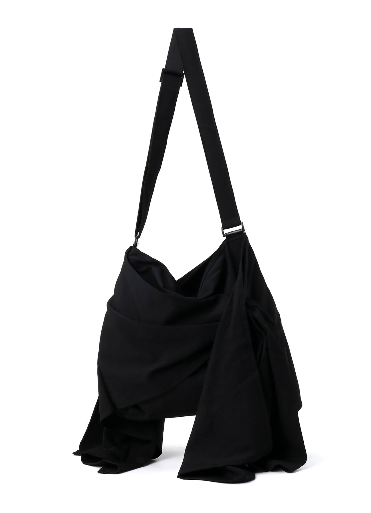 Diese Tasche mit drapierten Schultern verwendet das charakteristische Material, zerknittertes Gabardine, von Yohji Yamamoto. Die Länge des Gurtes ist verstellbar, und das Design beinhaltet einen Gurt, der durch einen Schlitz am Körper geführt wird, um einen Knoten zu binden. Der Reiz der Tasche liegt im voluminösen Stoff.