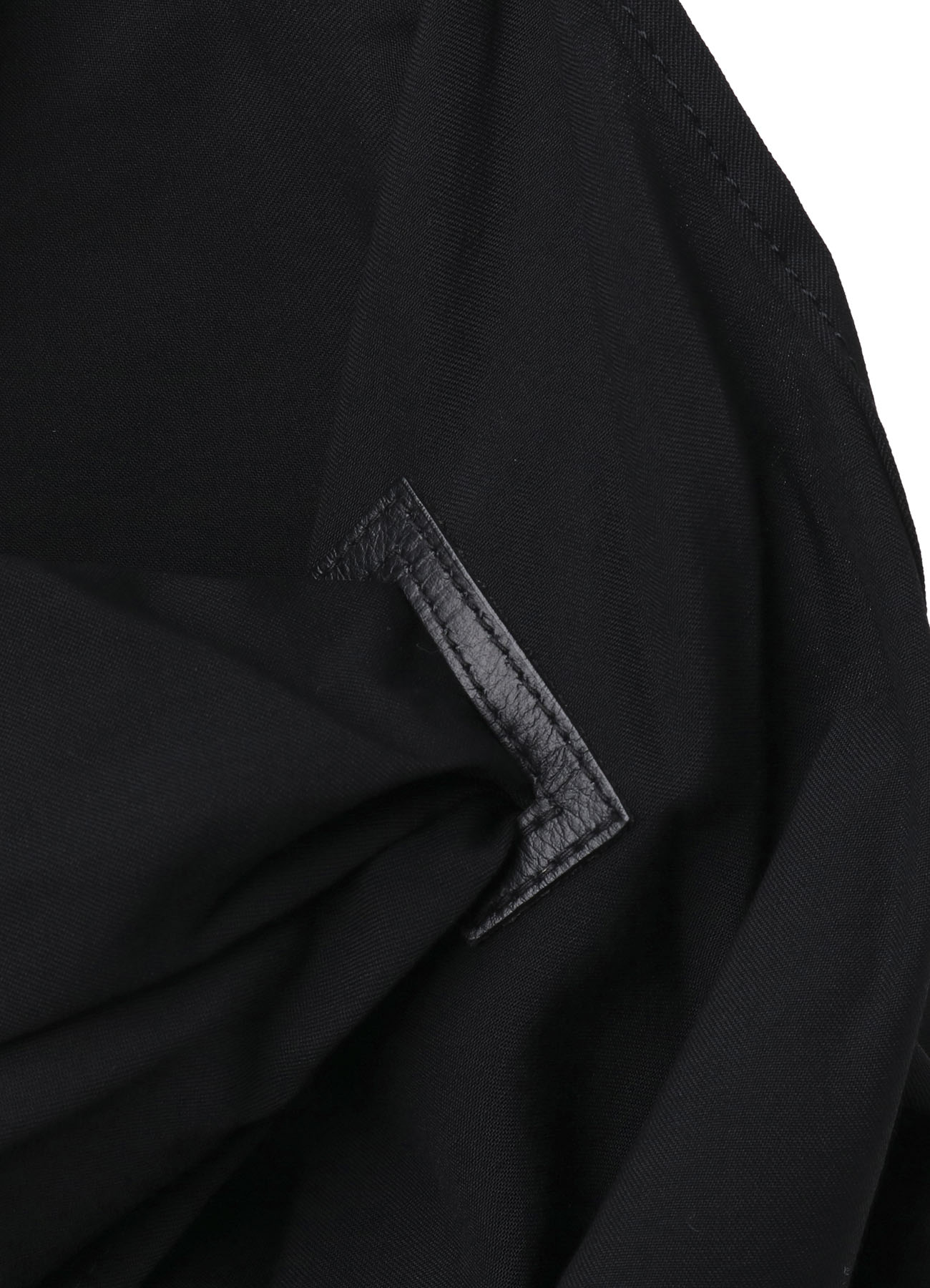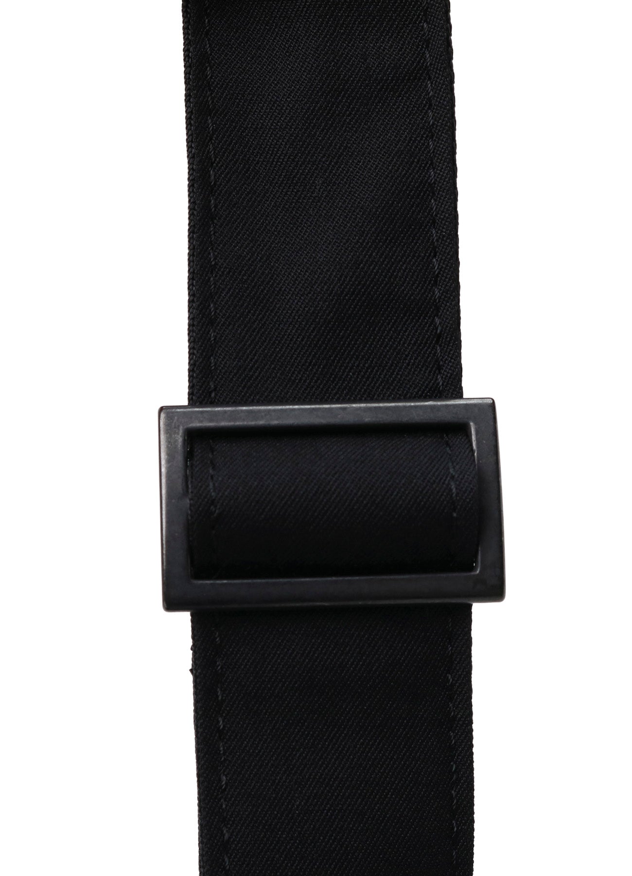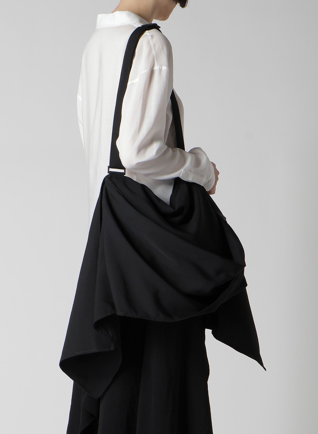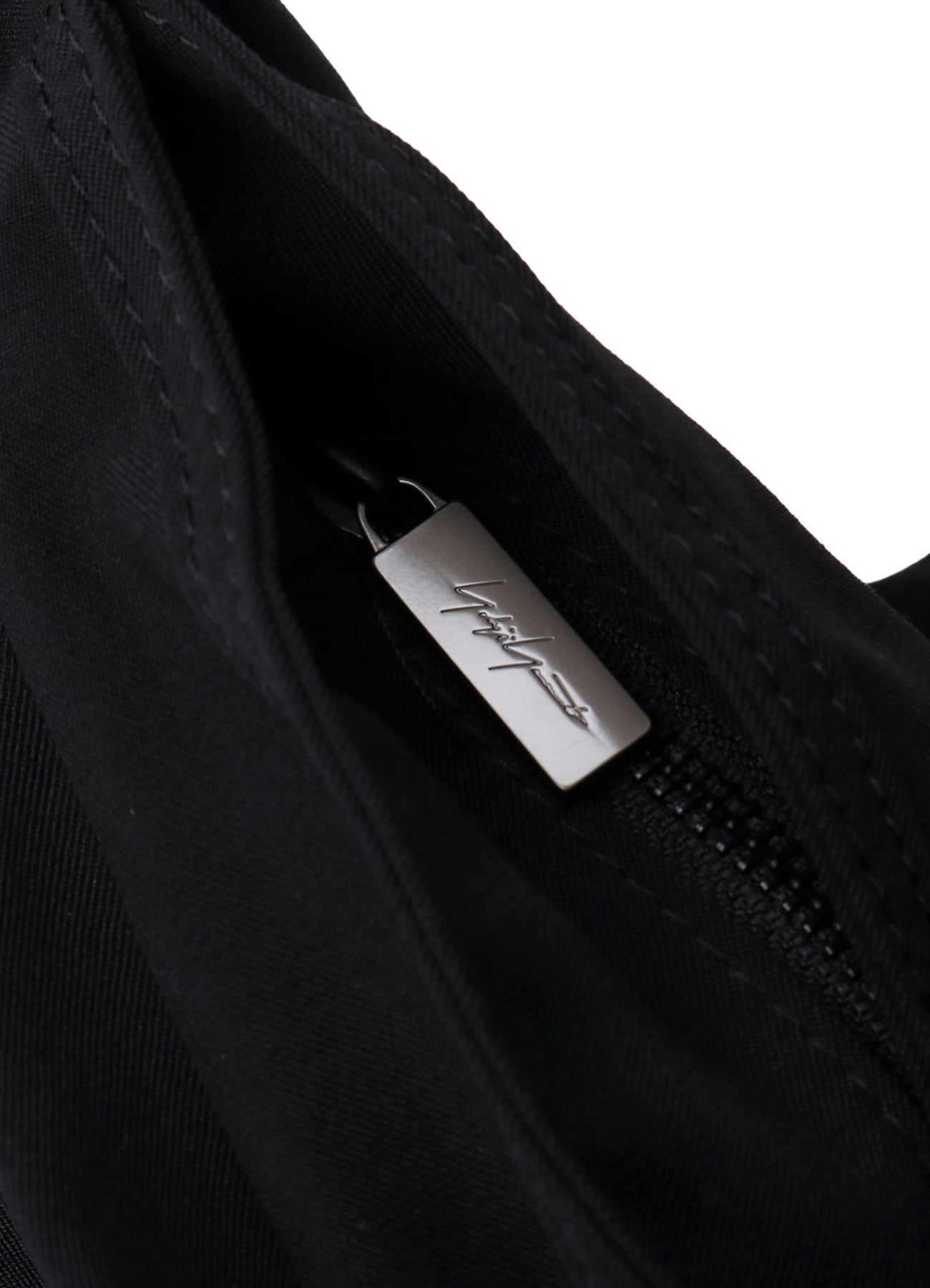 Diese Tasche mit drapierten Schultern verwendet das charakteristische Material, zerknittertes Gabardine, von Yohji Yamamoto. Die Länge des Gurtes ist verstellbar, und das Design beinhaltet einen Gurt, der durch einen Schlitz am Körper geführt wird, um einen Knoten zu binden. Der Reiz der Tasche liegt im voluminösen Stoff.