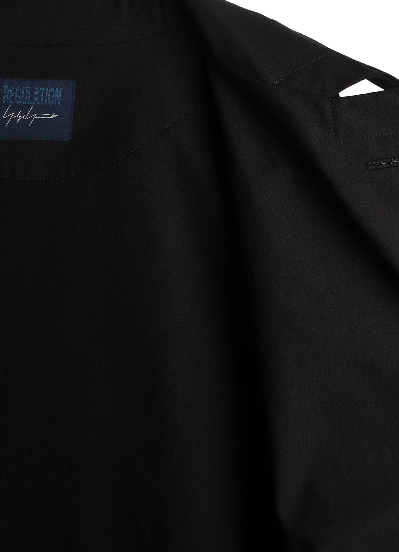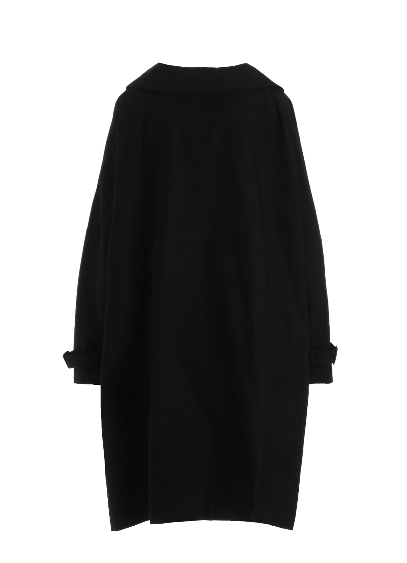 This coat, created from military back satin, features a silhouette reminiscent of a mantle, giving it a commanding and rich appearance. The dyeing process yields a deeper black for an impressive look. Crafted from high-density back satin, it offers a natural feel, enhanced by sun and tumbler finishing.
