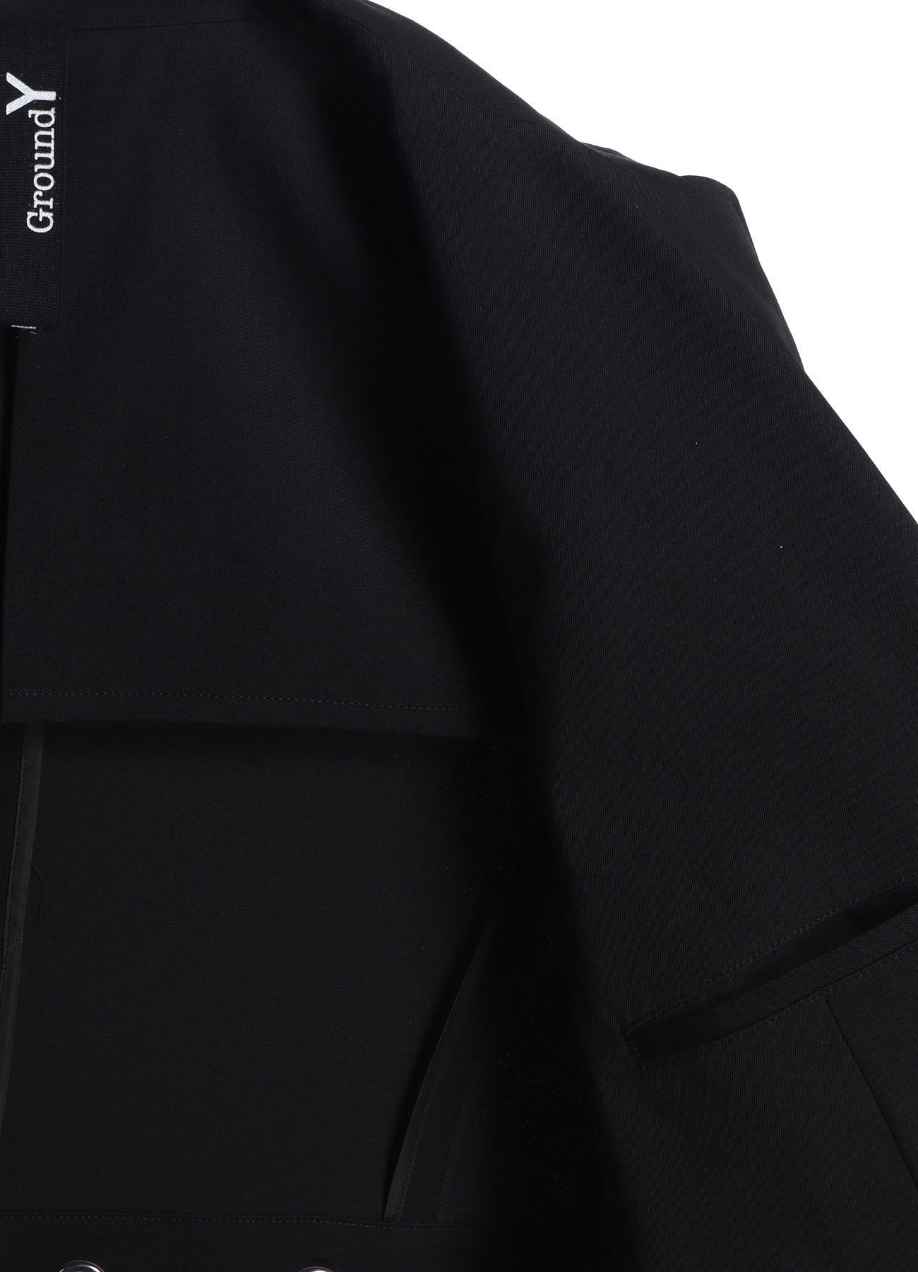 This tailored jacket by Ground Y features a playful backbelt and metal eyelets as design accents. While maintaining a classic two-button front, it showcases intricate detailing with a mesh-inspired design at the back and ventilation features. Made from signature wool gabardine, it offers durability and a sophisticated texture.