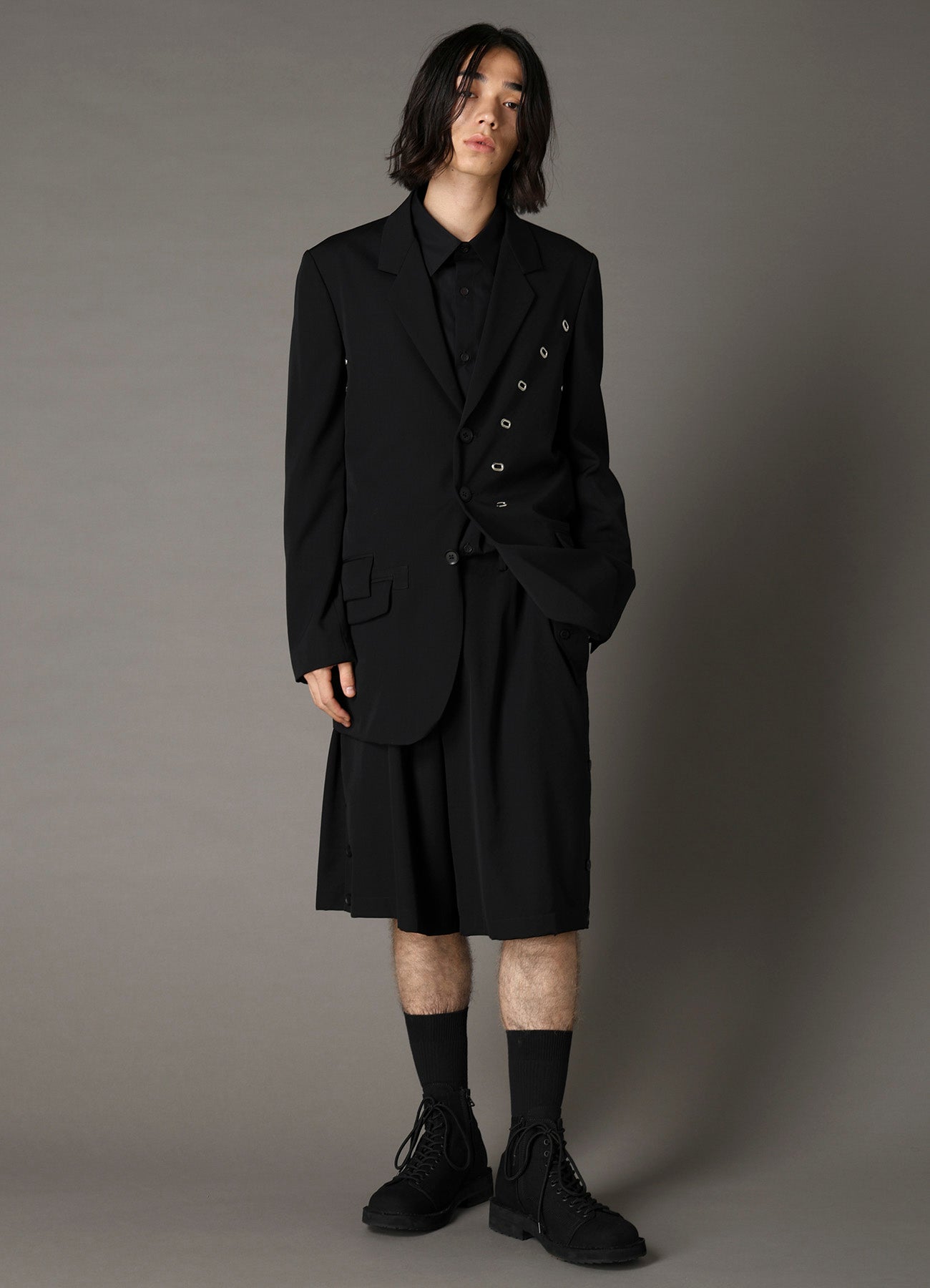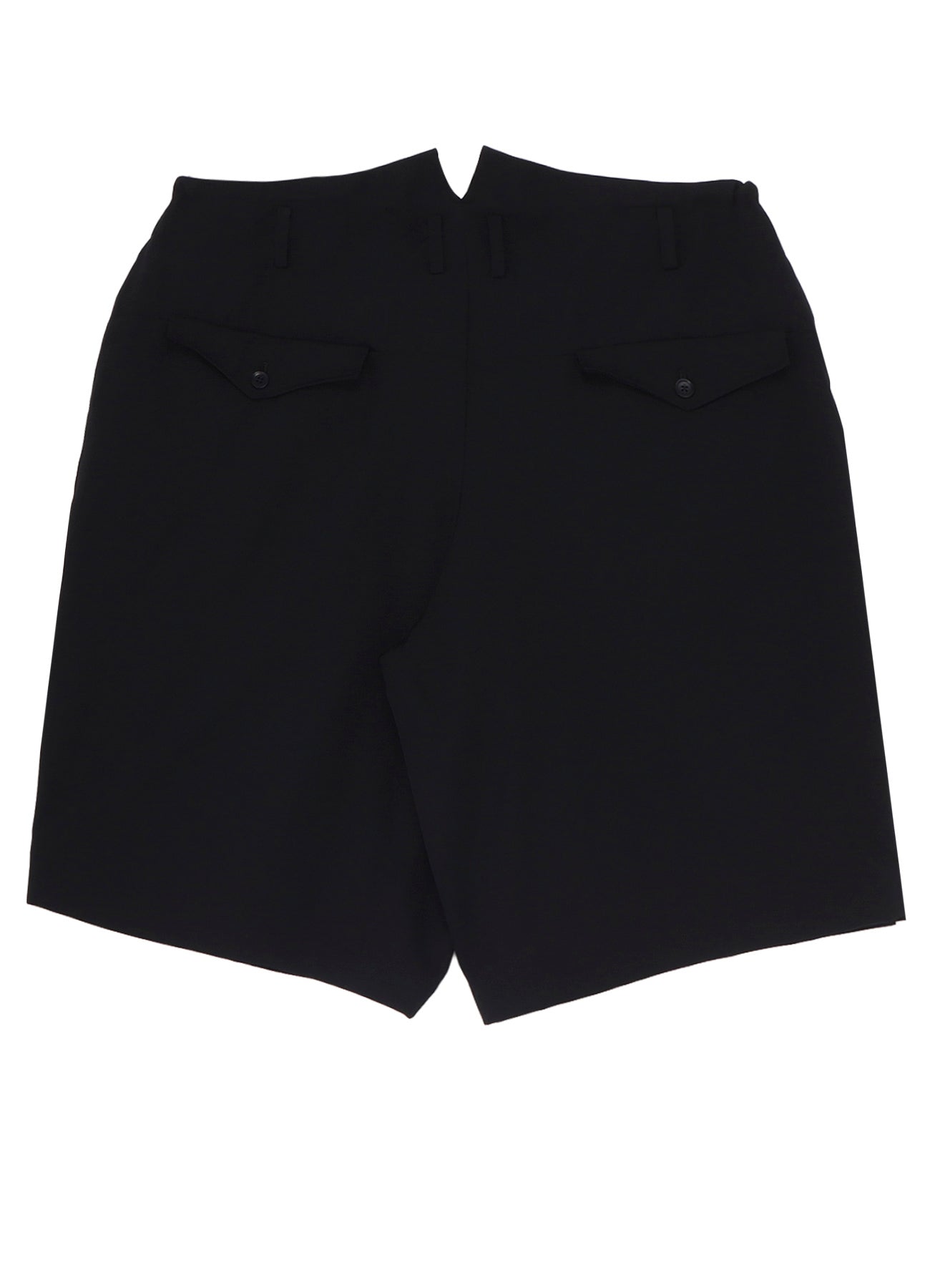 Wide shorts feature a side-opening design with strategically placed pockets along the combination. They include inner waist buttons for suspender-style options. Made with Yohji Yamamoto's signature material, gabardine wool, they exhibit a refined finish from high-density, strong-twist wool and are characterized by a wrinkled gabardine effect.