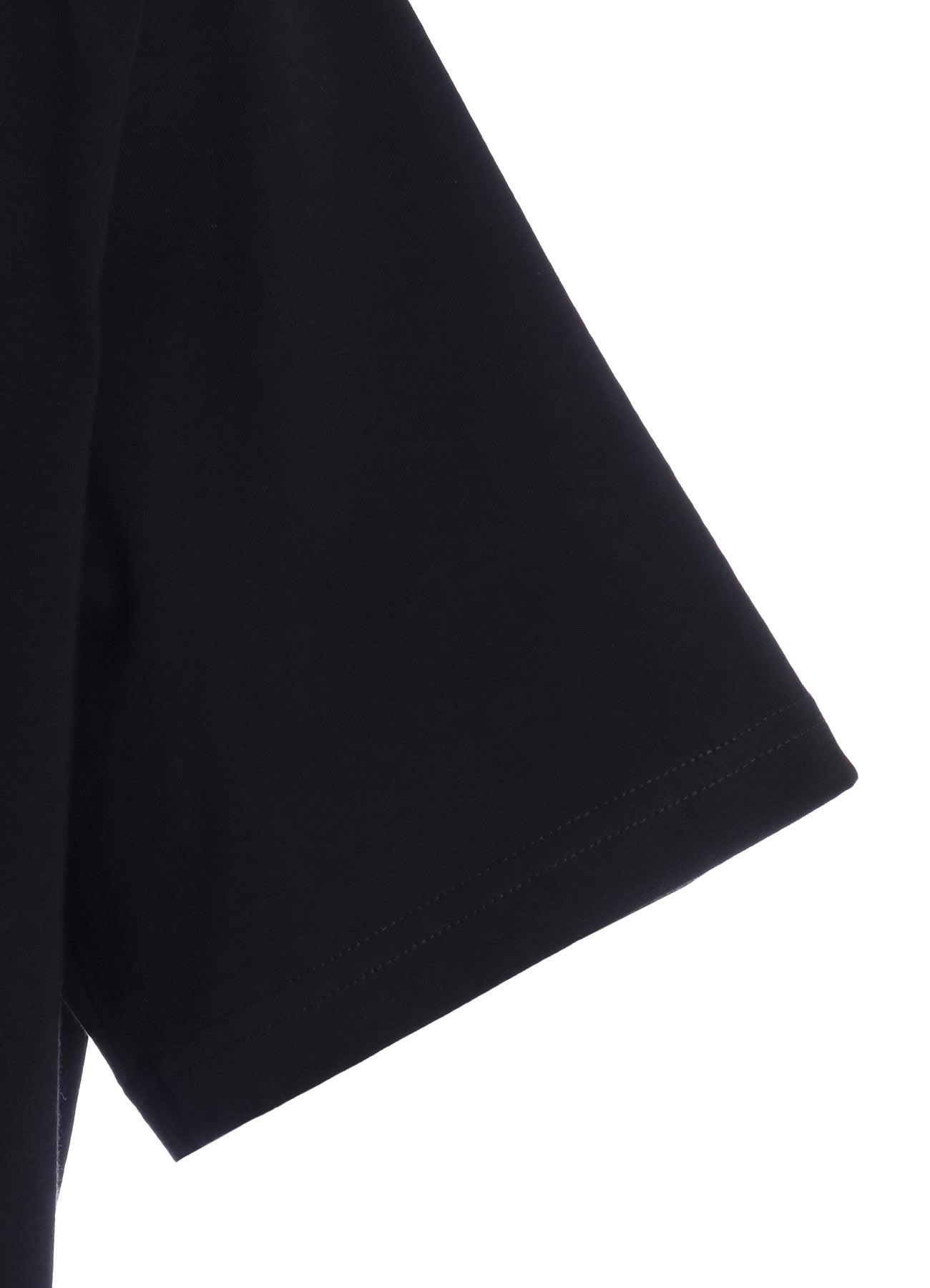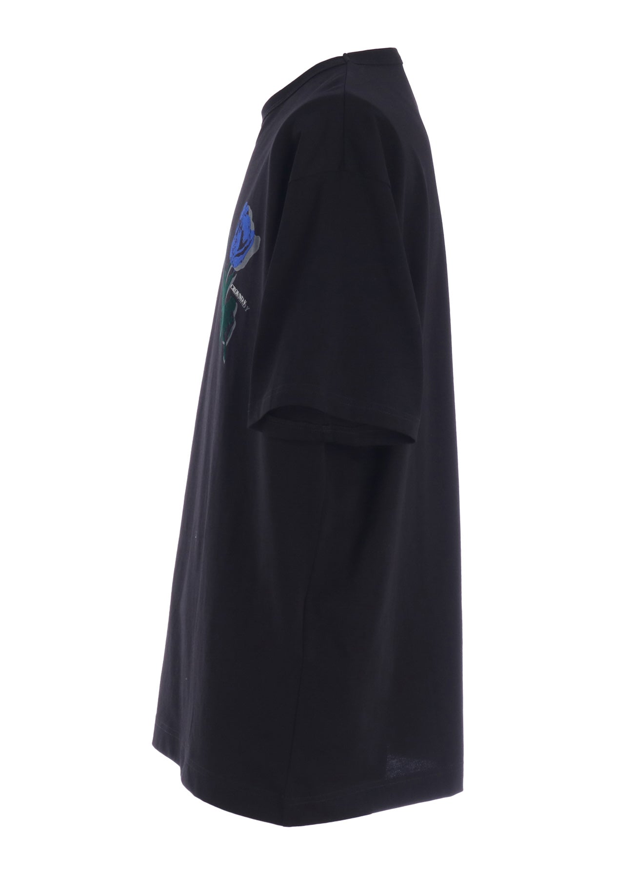 The Ground Y BEYOND BORDERS T-shirt features a 100% cotton plain stitch fabric. The black body is elegantly accentuated by a blue tulip at the left chest, adding a subtle yet distinct presence. This simple design is elevated by a sophisticated blue flower print, infusing it with individuality and elegance.