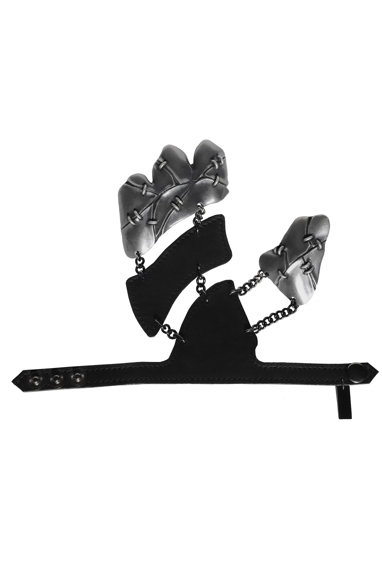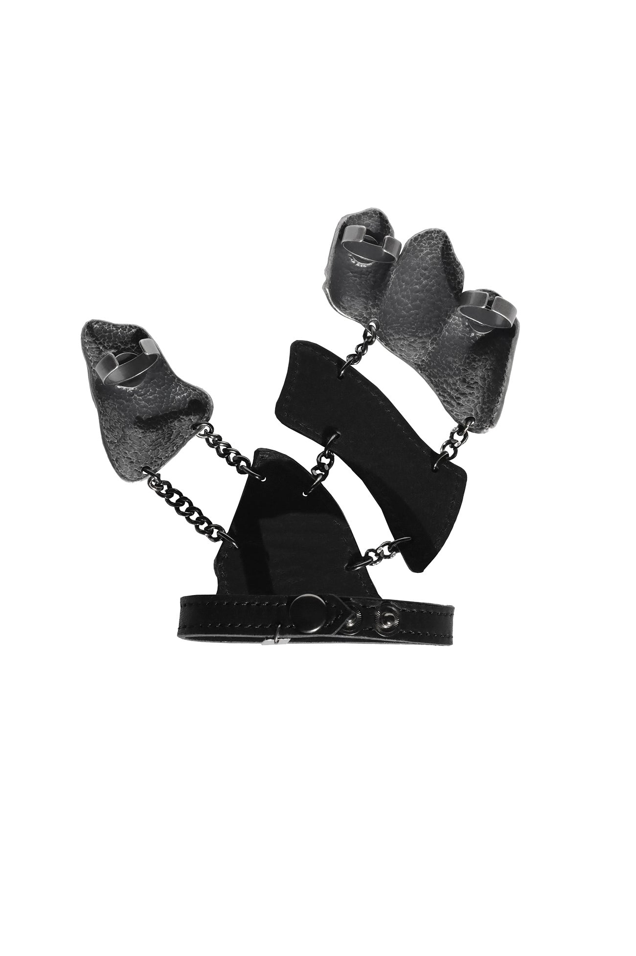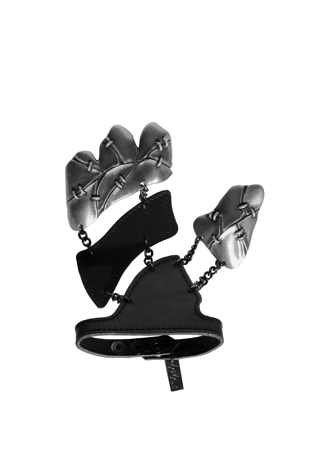 Das bemerkenswerte Finger Accessoire der Yohji Yamamoto POUR HOMME S/S 2025 Collection, Look 19, zeichnet sich durch Leder aus, das den Handrücken der linken Hand bedeckt. Es bietet ein einzigartiges und auffälliges Erscheinungsbild. Durch seine Integration und Naht wird dieses Accessoire zu einem Beweis für anspruchsvolles Design und Eleganz.