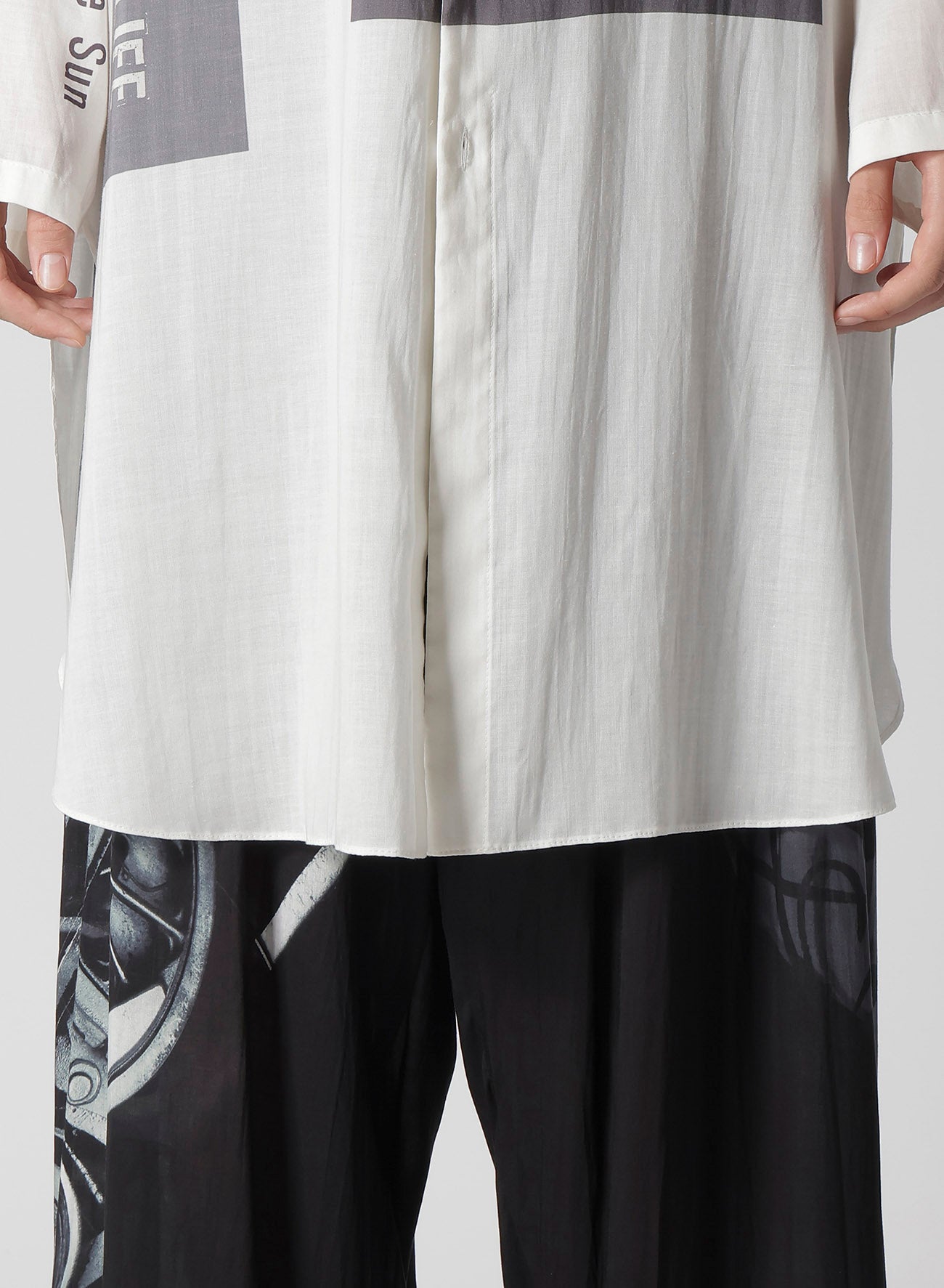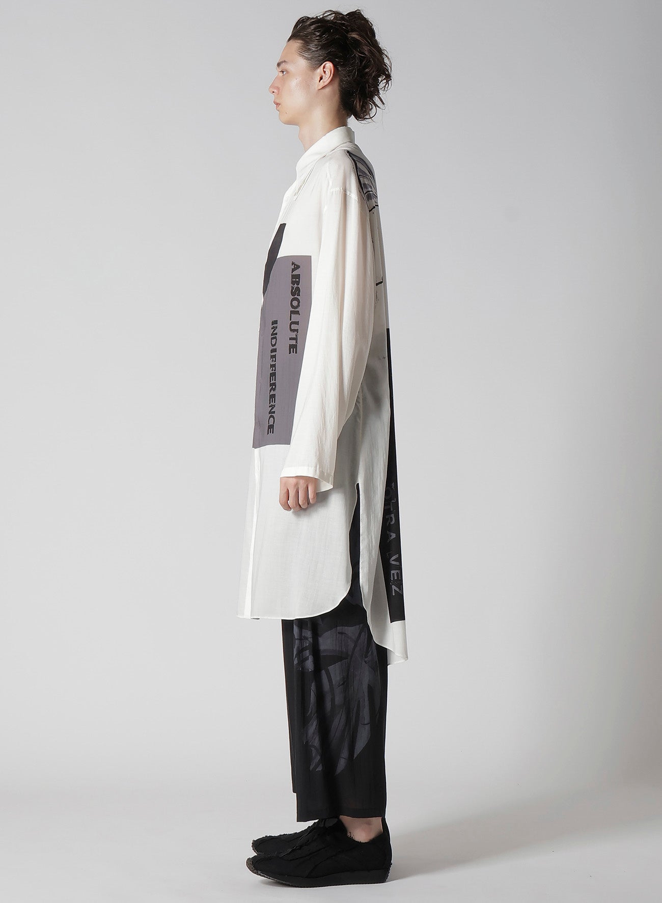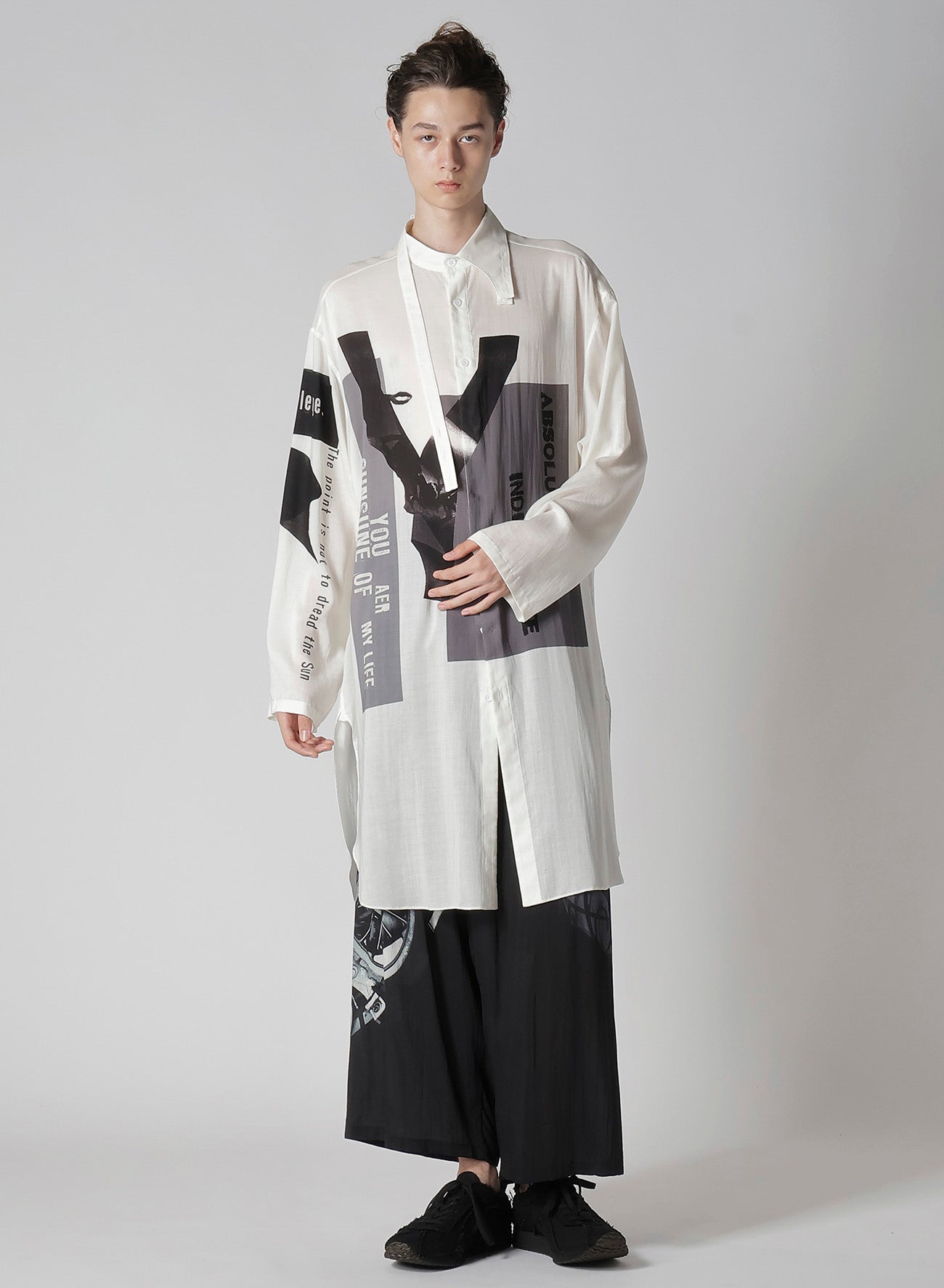 Ein Standkragen-Bluse aus der Yohji Yamamoto POUR HOMME S/S 2025 Kollektion Look 6 besticht durch Drapierung aus Tencel-Garn Lawn. Originaldesigns werden in einer Kyoter Fabrik inkjetgedruckt, was handwerkliches Geschick und moderne Ästhetik unterstreicht. - Draperie mit Tencel-Garn Lawn. - Standkragen. - Inkjet-Druck in Kyoto. - Vereint traditionelles Handwerk mit moderner Mode.