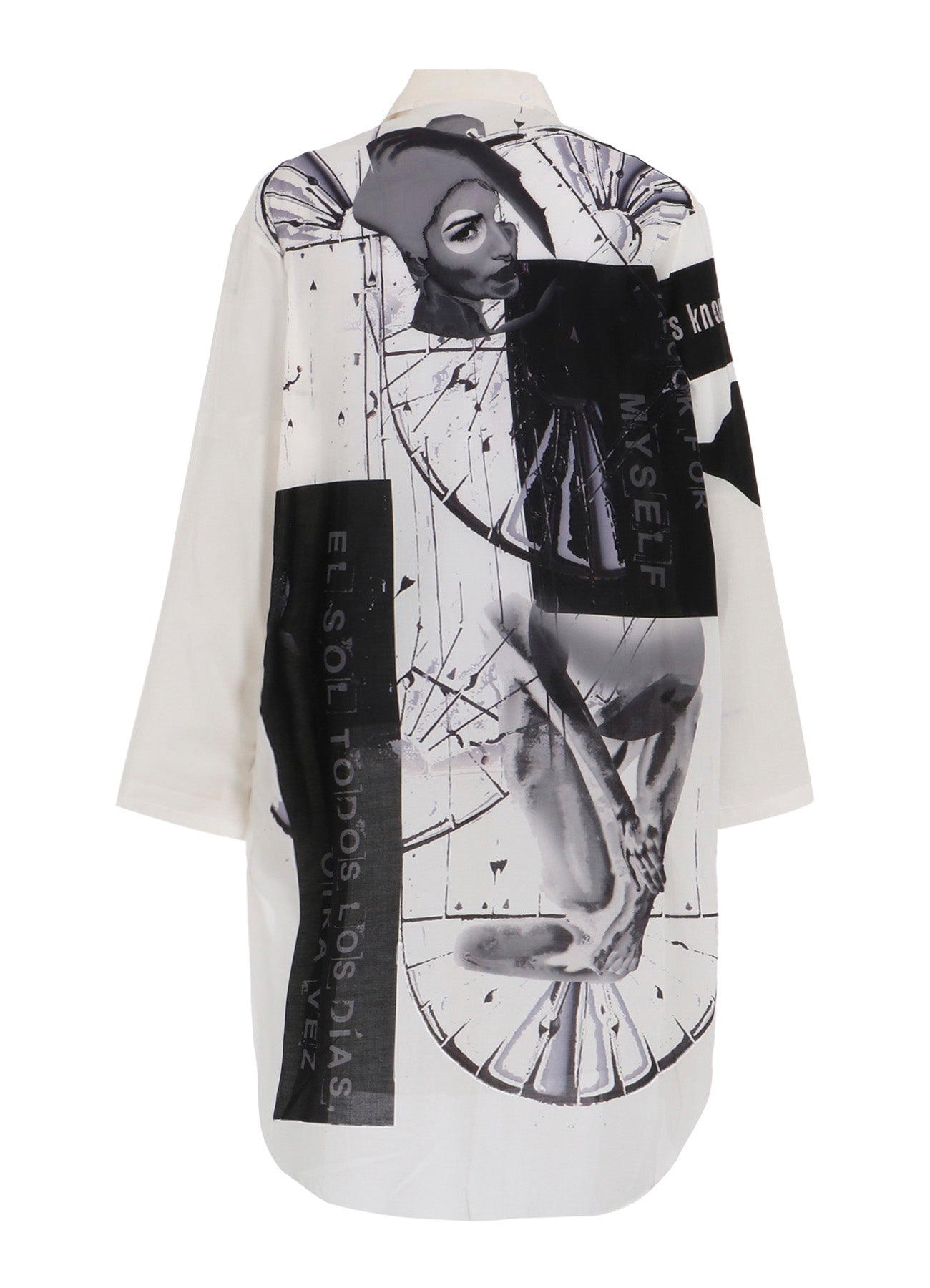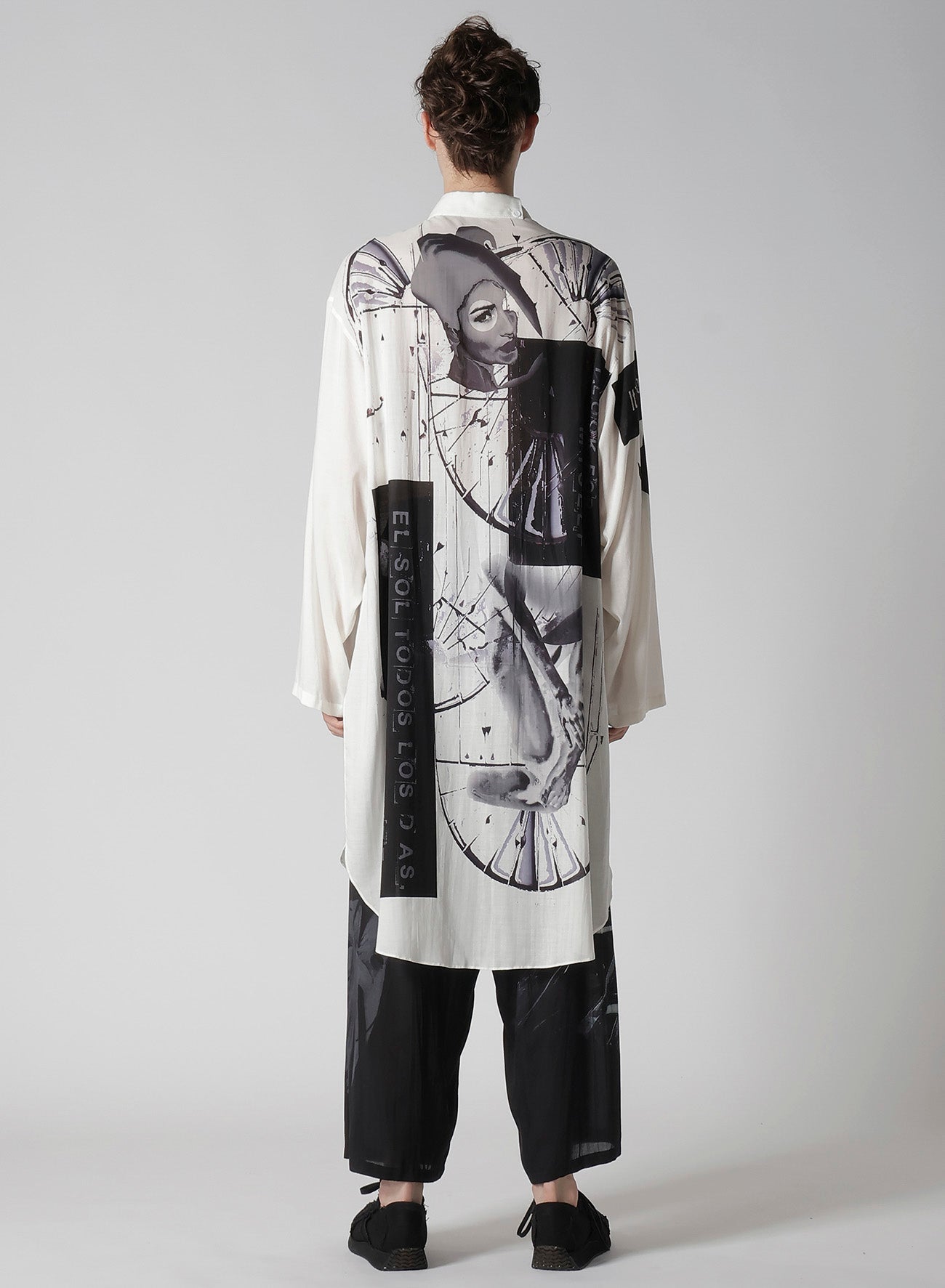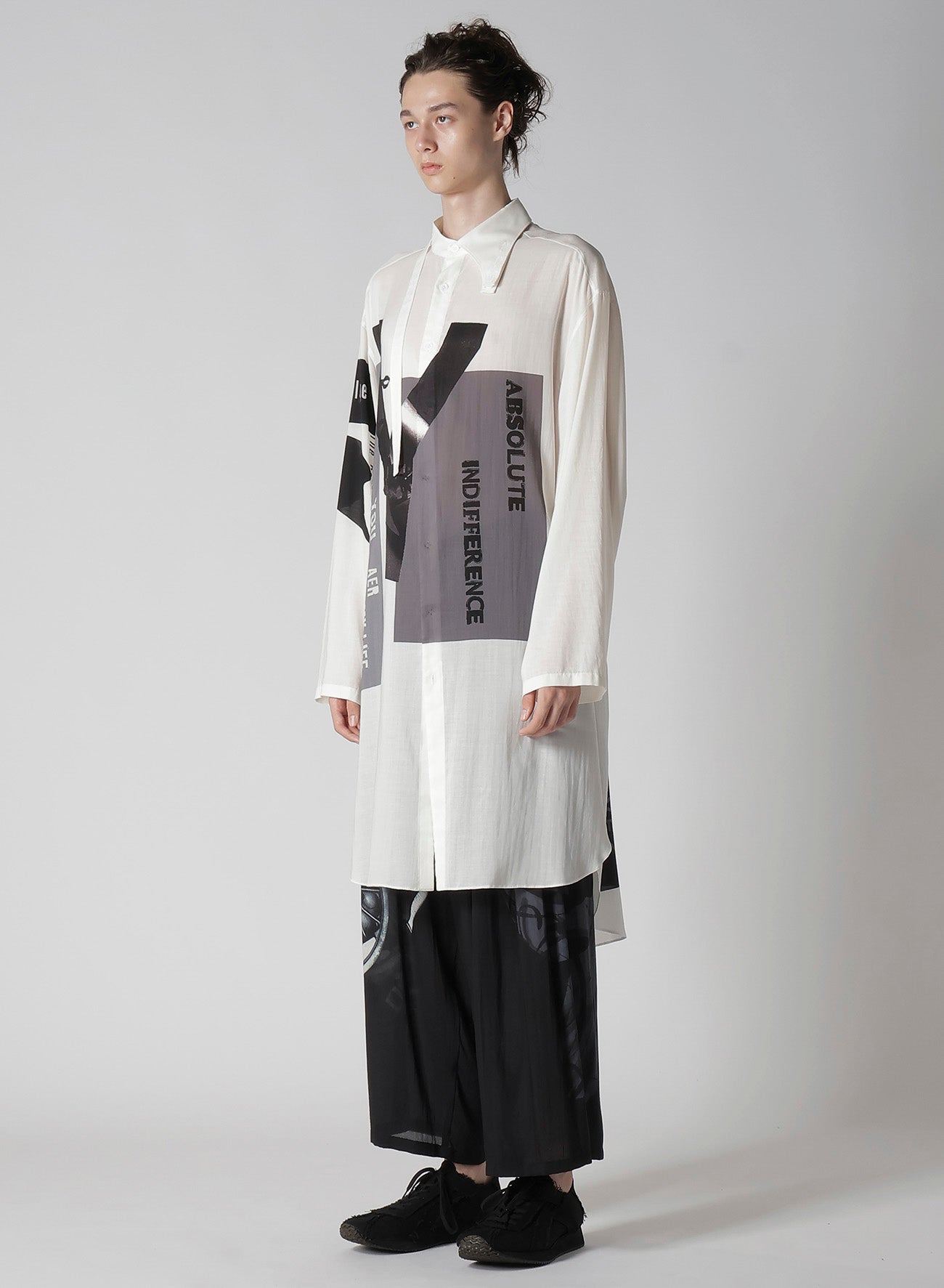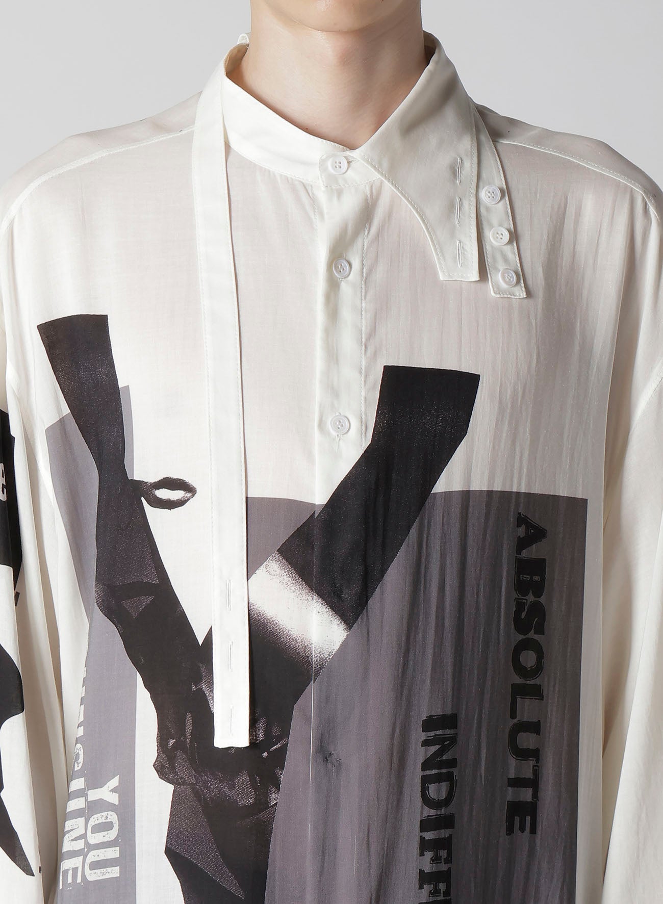Ein Standkragen-Bluse aus der Yohji Yamamoto POUR HOMME S/S 2025 Kollektion Look 6 besticht durch Drapierung aus Tencel-Garn Lawn. Originaldesigns werden in einer Kyoter Fabrik inkjetgedruckt, was handwerkliches Geschick und moderne Ästhetik unterstreicht. - Draperie mit Tencel-Garn Lawn. - Standkragen. - Inkjet-Druck in Kyoto. - Vereint traditionelles Handwerk mit moderner Mode.