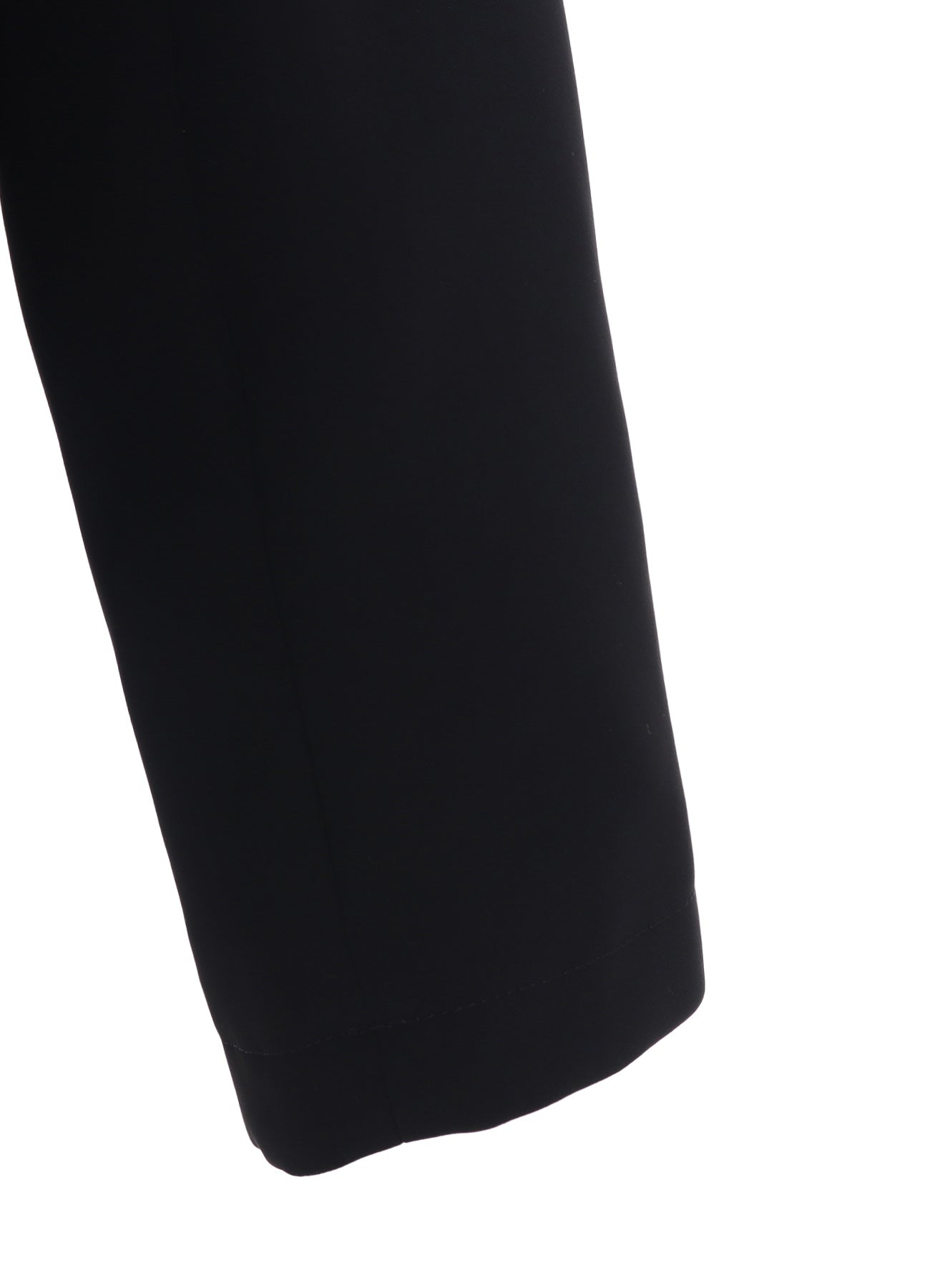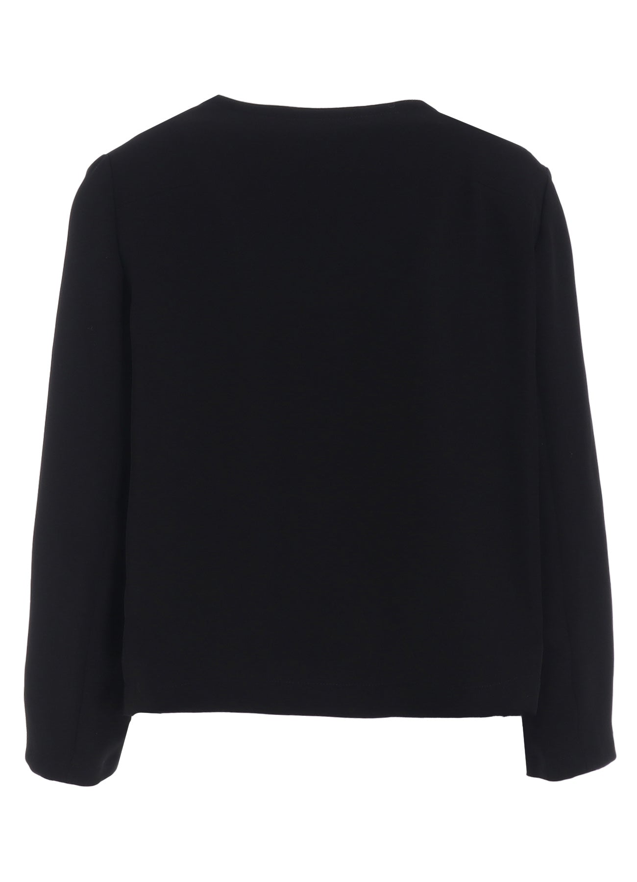This mid-weight double satin, made of polyester, is firm yet stretchy with a springy and light feel. The fabric is smooth with a good drape due to its back satin finish, and has a deep black hue thanks to special dyeing. The jacket features a clean, collarless design with a one-button closure and rounded hemline for a soft look.