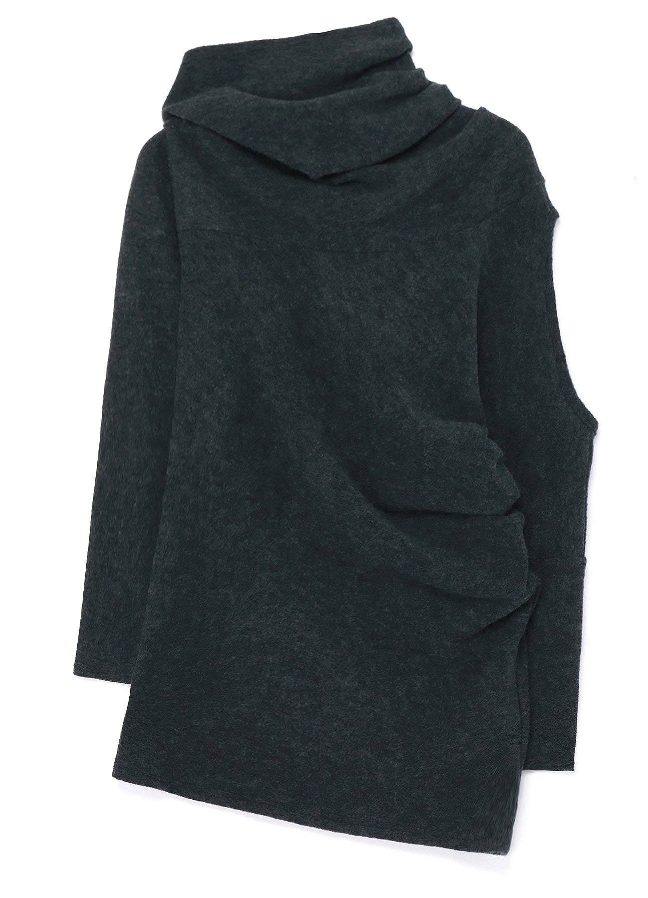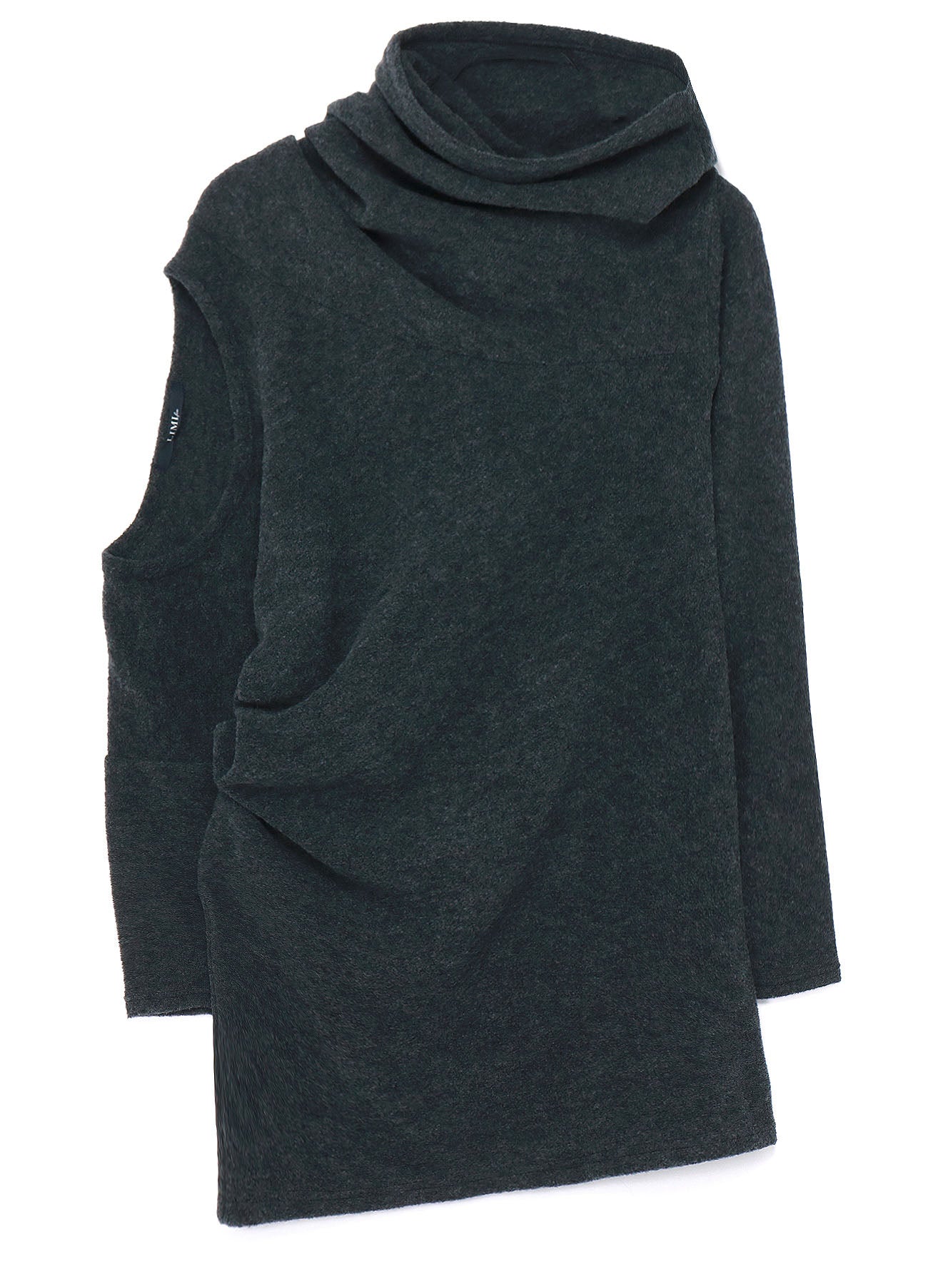 Genießen Sie den voluminösen, weichen und warmen Stoff dieses Tops. Mit einer wolligen Textur, die sich ideal für lässige Styles eignet, bietet es zwei einzigartige Tragevarianten. Das Rundhalsdesign verfügt über weite Ärmel mit drapiertem Stoff, oder Sie können sich für einen Stehkragen mit offenem rechten Schulter entscheiden.