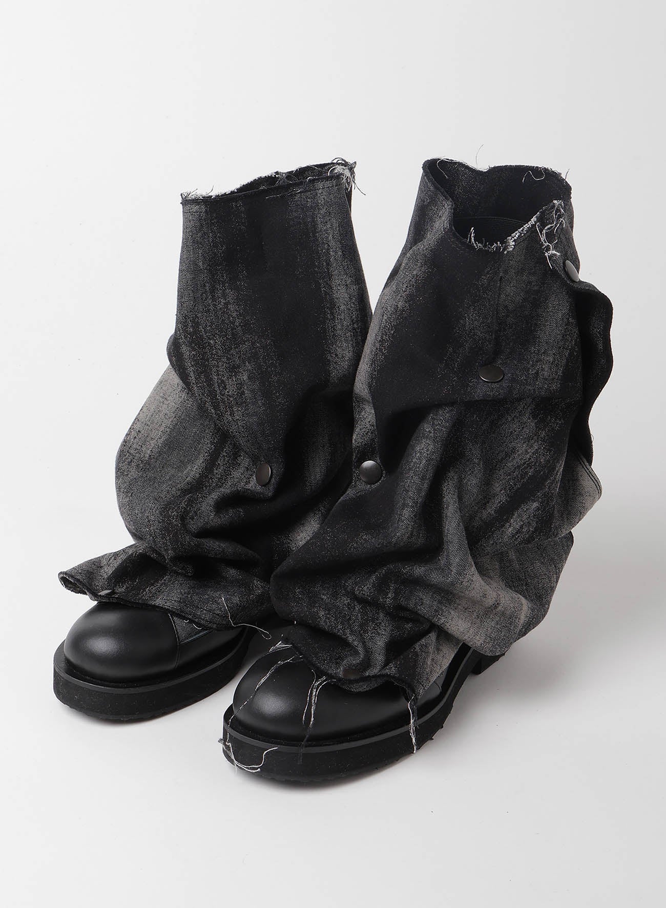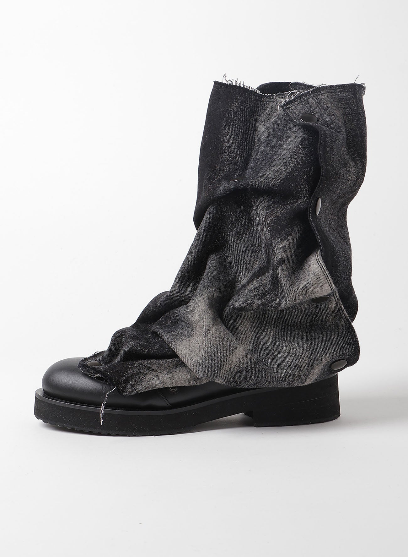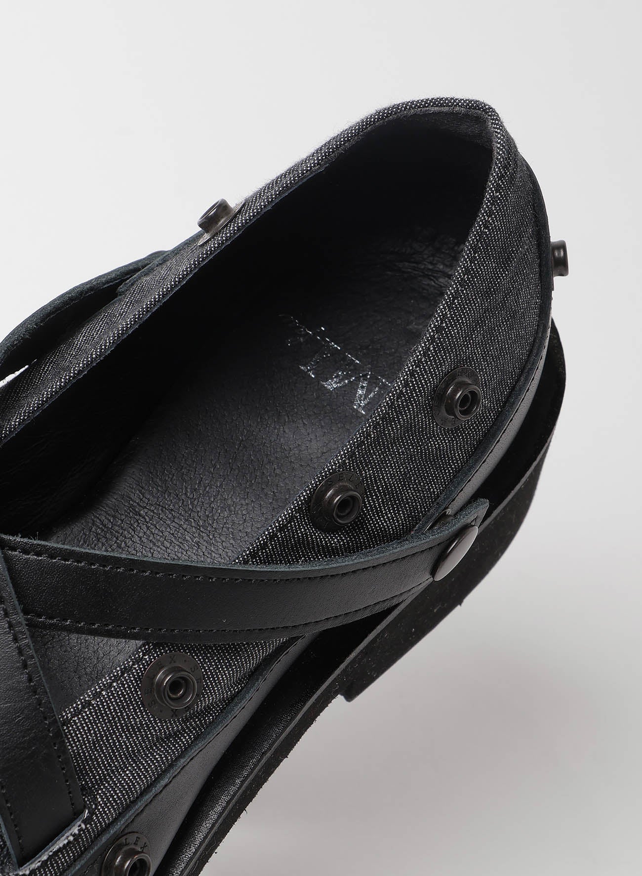 Dieses Modell kombiniert mattes Chromleder mit leichtem Denim und zeigt einen markanten, abgenutzten Grunge-Stil durch den Discharge-Print. Jedes Stück weist einzigartige Farb- und Musterabweichungen auf. Das Schuhwerk, bekannt durch die schrägen Zehenkombinationen und Kreuzgurte, enthält abnehmbare Stoffteile, die mit Clipknöpfen angebracht werden können.