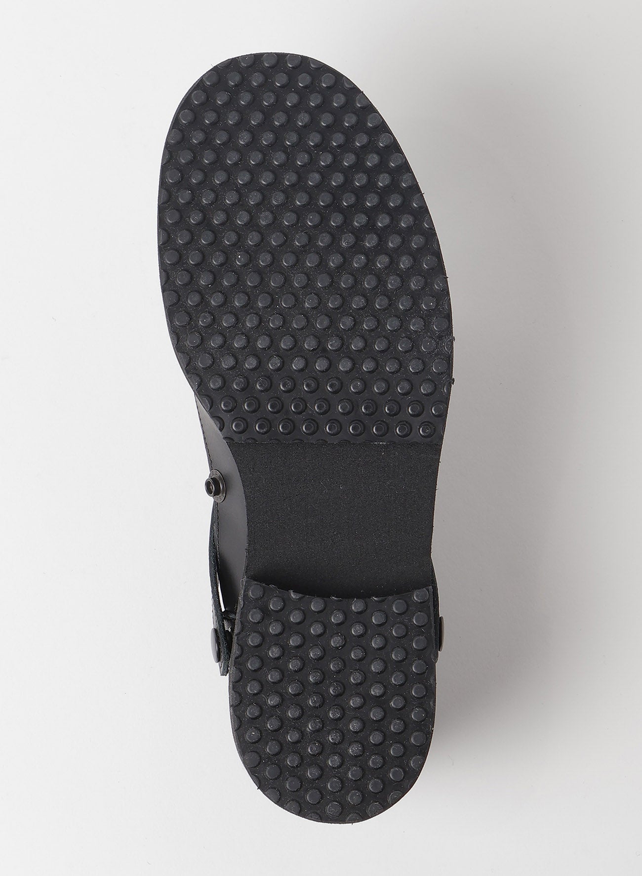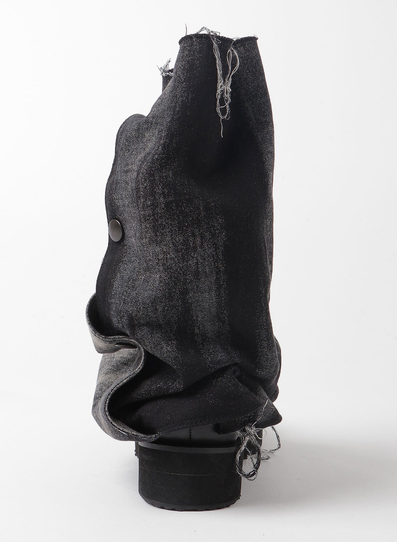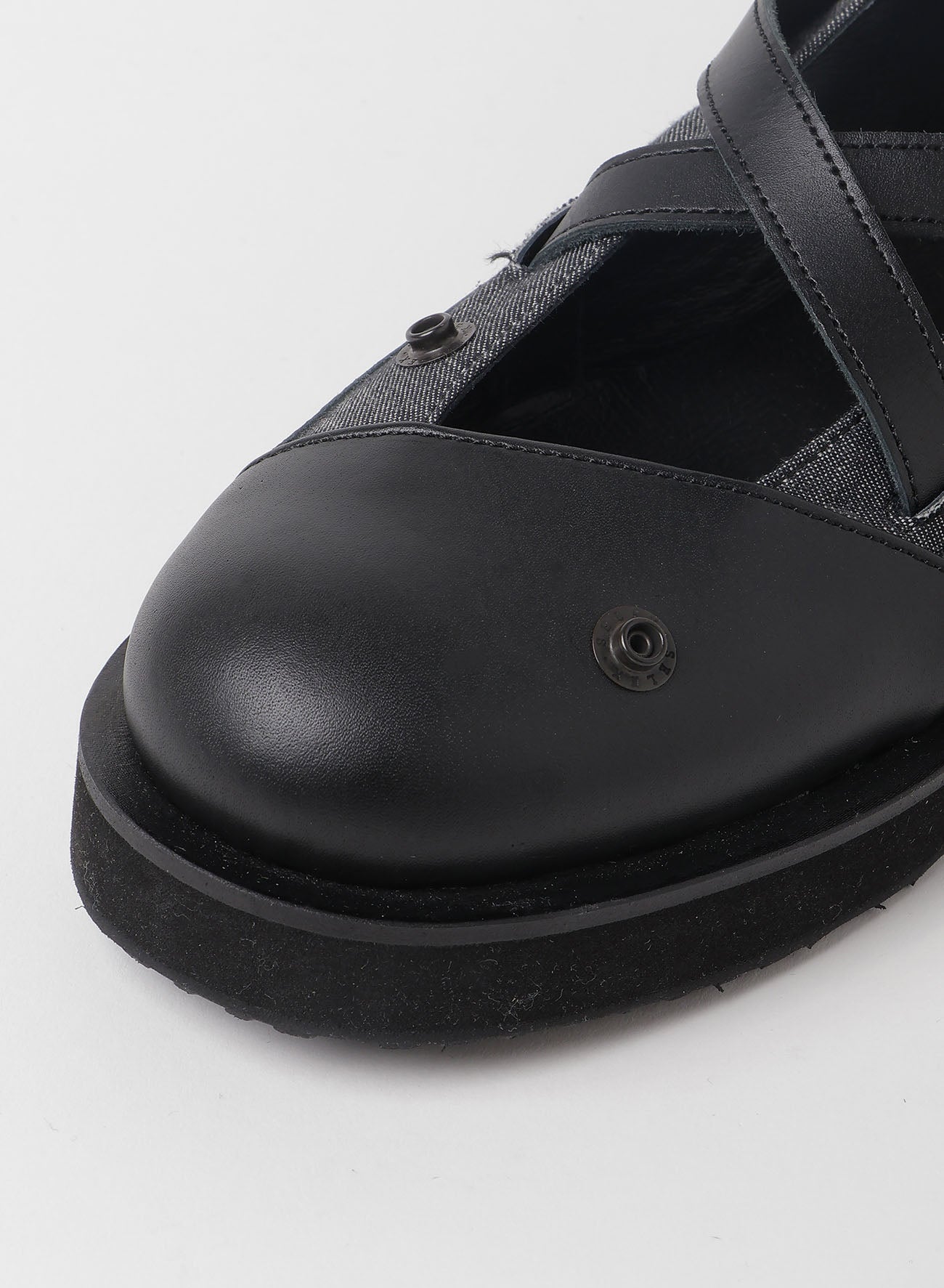 Dieses Modell kombiniert mattes Chromleder mit leichtem Denim und zeigt einen markanten, abgenutzten Grunge-Stil durch den Discharge-Print. Jedes Stück weist einzigartige Farb- und Musterabweichungen auf. Das Schuhwerk, bekannt durch die schrägen Zehenkombinationen und Kreuzgurte, enthält abnehmbare Stoffteile, die mit Clipknöpfen angebracht werden können.