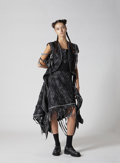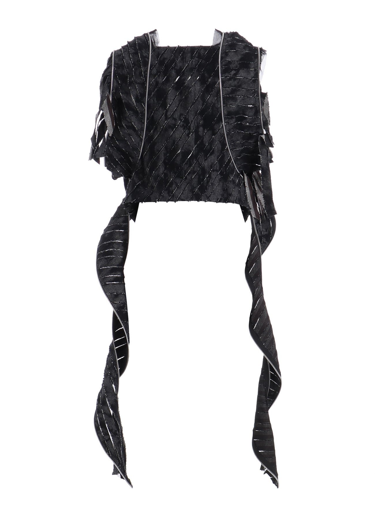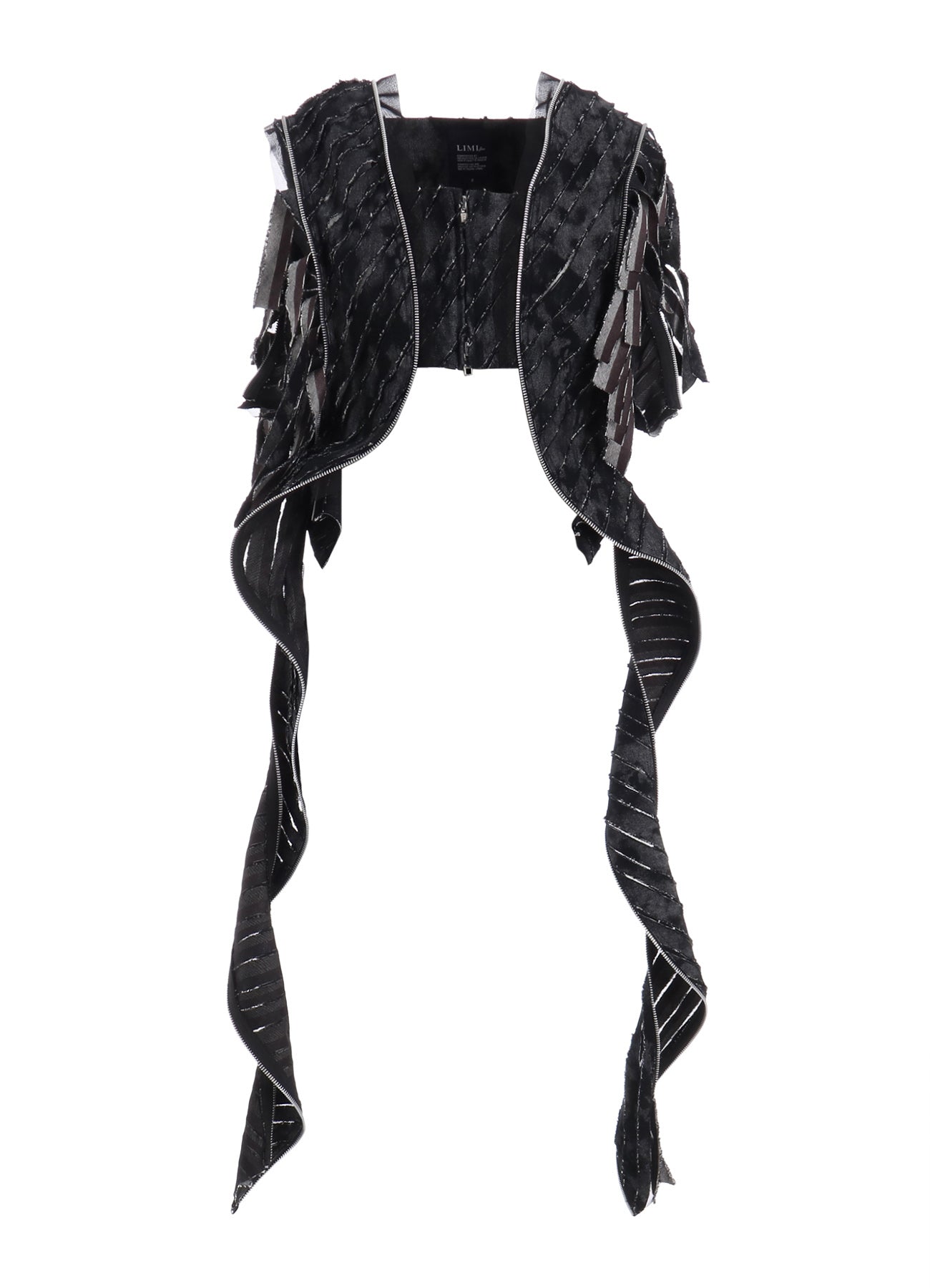 Diese auffällige Jacke kombiniert schweren schwarzen Denim mit einem einzigartigen Druck und Tüll, was einen charakteristischen, geschichteten und abgenutzten Look ergibt. Jedes Teil ist durch die Platzierung des Drucks, Fransen und teilweise abgelösten Bereiche einzigartig. Mit der Zeit kann durch weitere Fransen und Ablösung der Charme zunehmen.