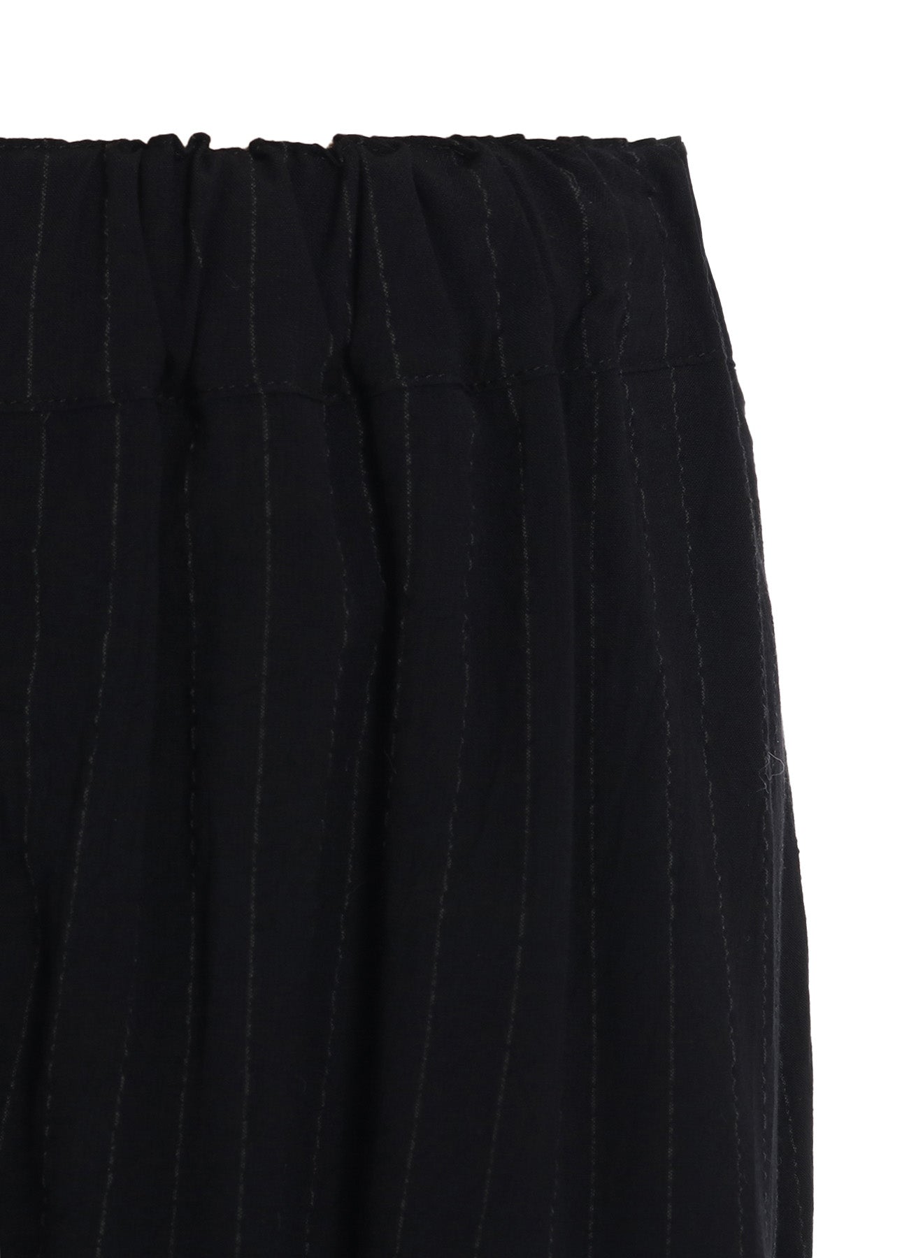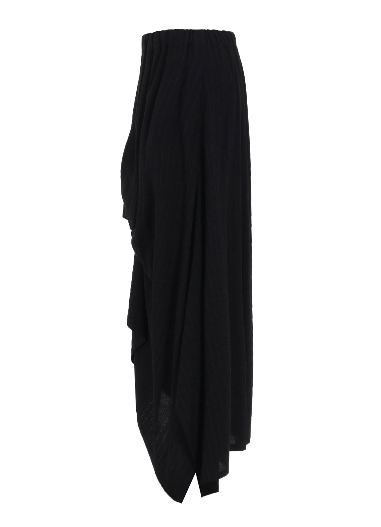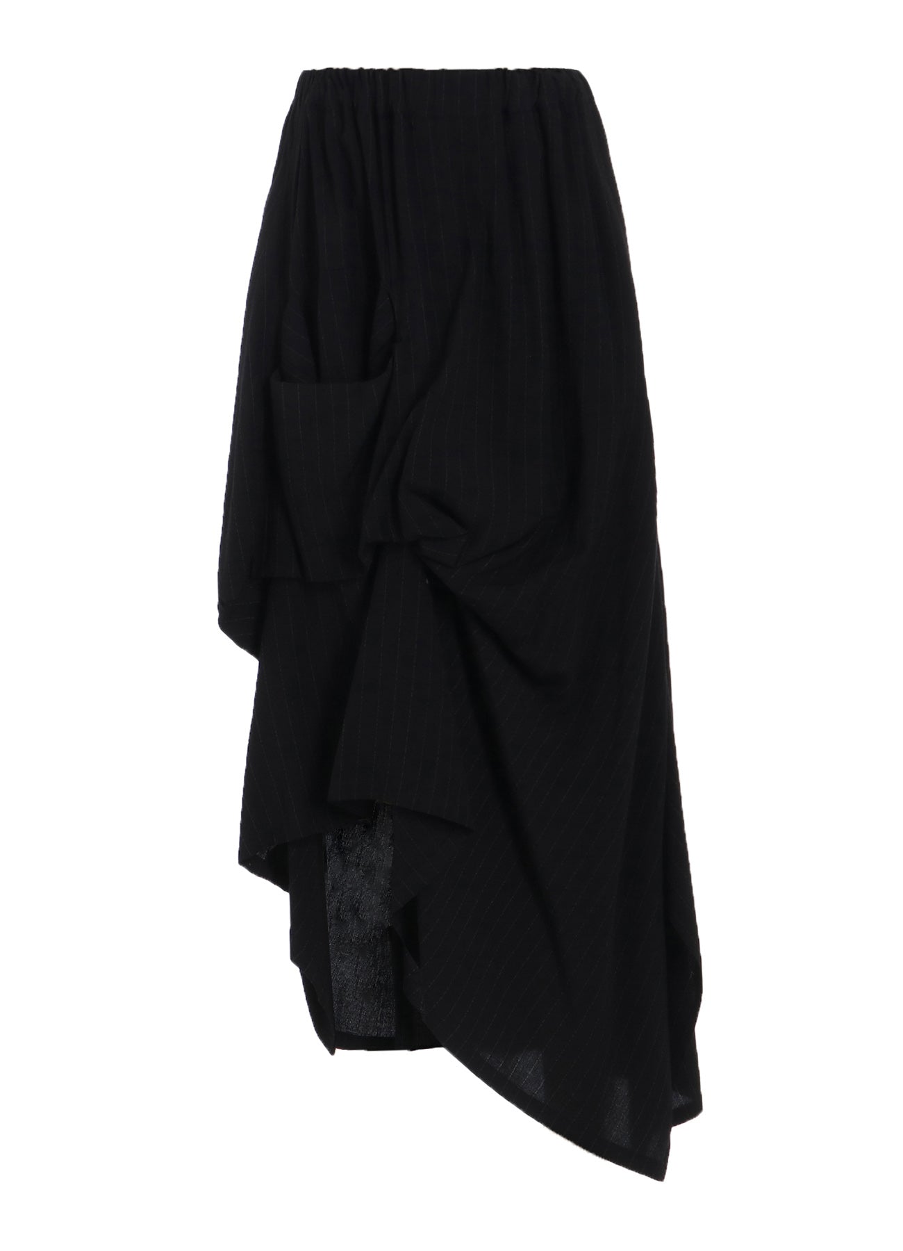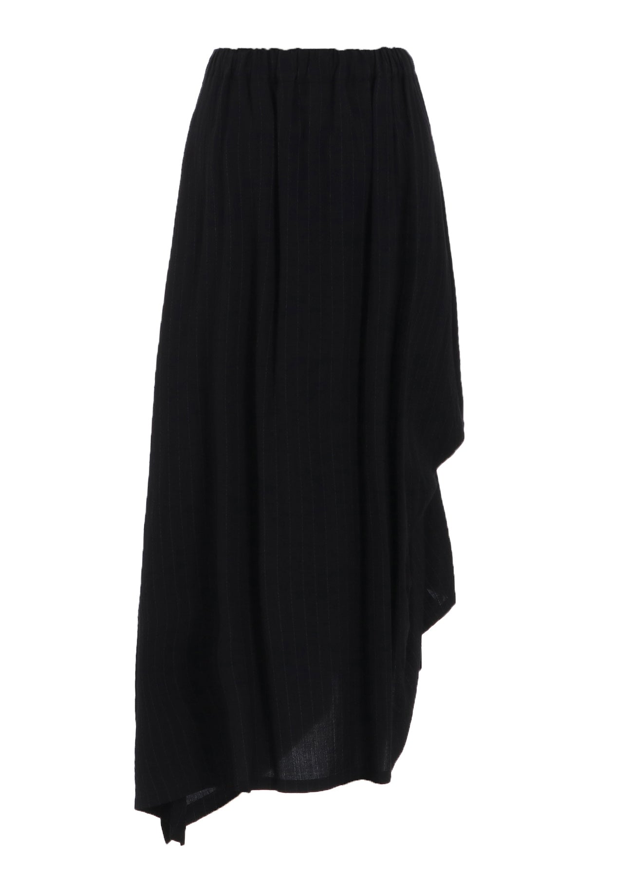 Dieser herren-inspirierte Rock besticht durch ein schönes Streifenmuster mit sanftem Fall und weichem Griff. Die Polyesterfäden erzeugen durch Waschen einen strukturierten Look, indem der Schrumpfungsunterschied zwischen Rayon und Polyester genutzt wird. Das Design umfasst asymmetrische Taschen, einen elastischen Bund und Schlitze für einfaches Tragen.