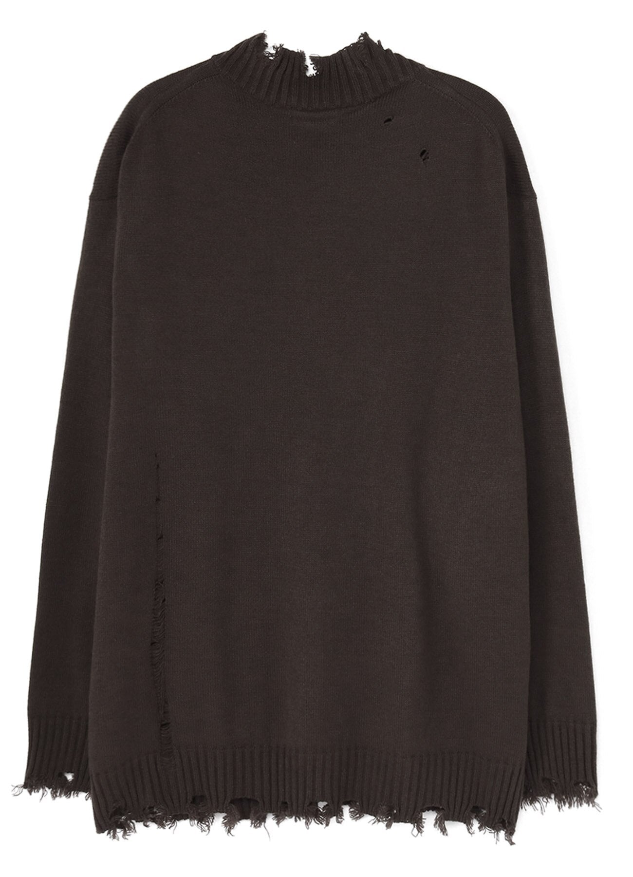Dieses 7-Gauge Chunky-Strick bietet ein flauschiges und leichtes Gefühl und sorgt für unerwarteten Komfort. Die Cut-off-Stil-Schadenverarbeitung am Saum, an den Ärmeln und am V-Ausschnitt-Ripp sorgt für einen punkigen Look bei jeder Innenschicht wie einem Shirt. Subtile Schäden am lockeren Körper sorgen für Balance, und die durchscheinenden beschädigten Rippungen verbessern den Look der Oberbekleidung. Die anti-pilling Acrylwolle widersteht Pilling und Schädlingen, was die Pflege erleichtert.