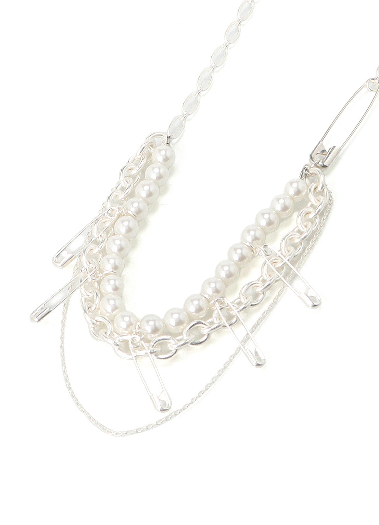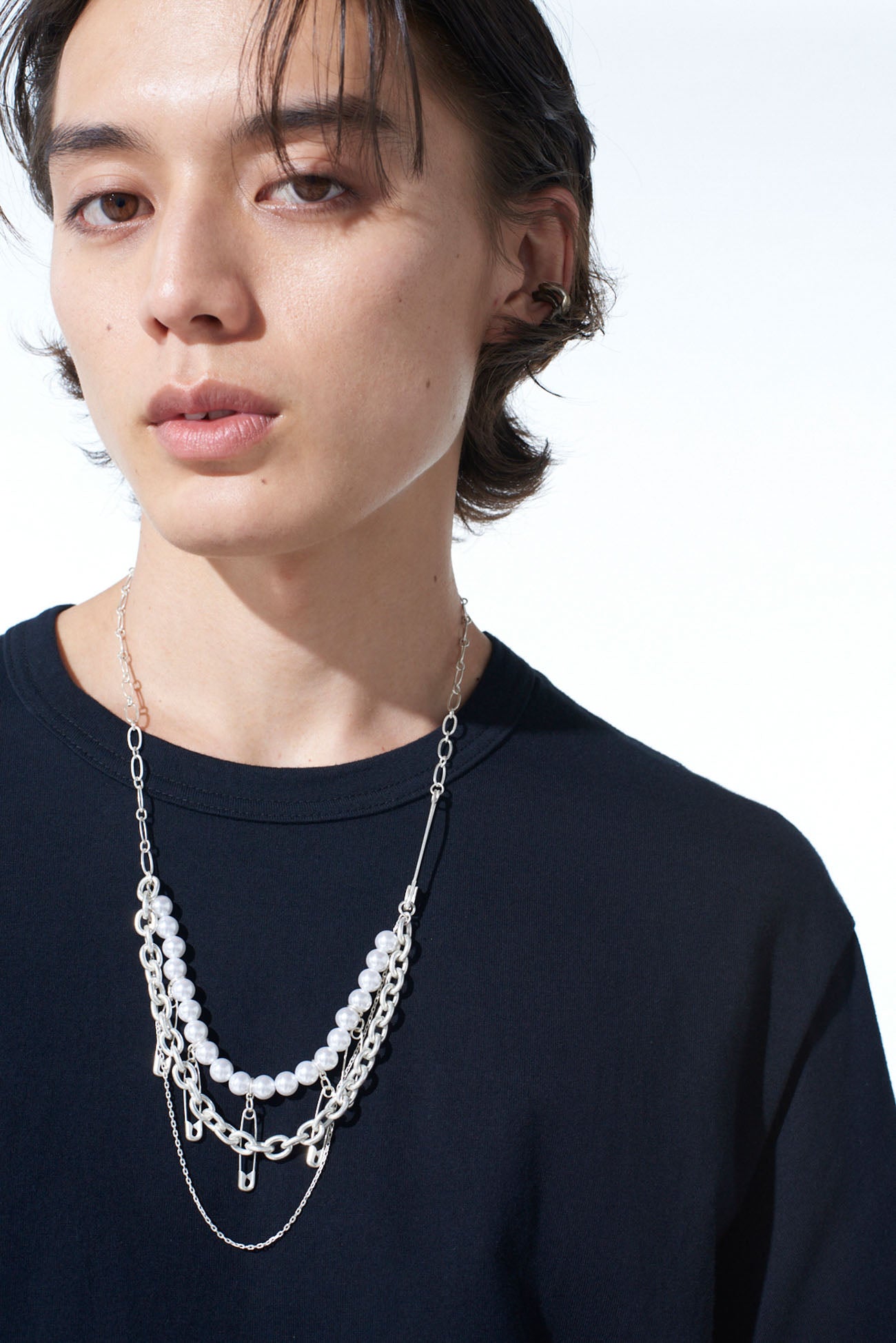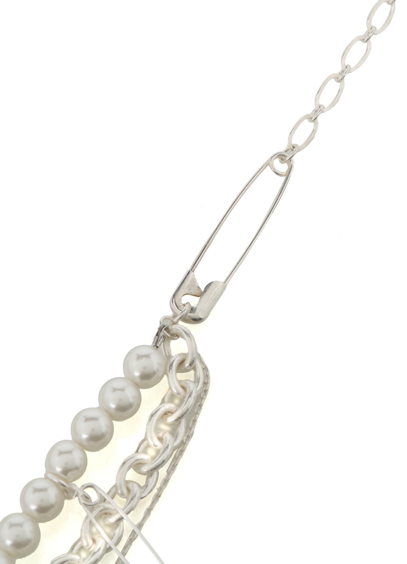 Diese Halskette kombiniert Ketten, Sicherheitsnadeln und Kunstperlen zu einem anspruchsvollen Punk-Design. Die Mischung aus Metall und Perlen erzeugt einen auffälligen Look, der aus verschiedenen Blickwinkeln anders erscheint. Mit der Zeit entwickelt das Material eine antike Patina. Ergänzen Sie sie mit dem passenden Armband.