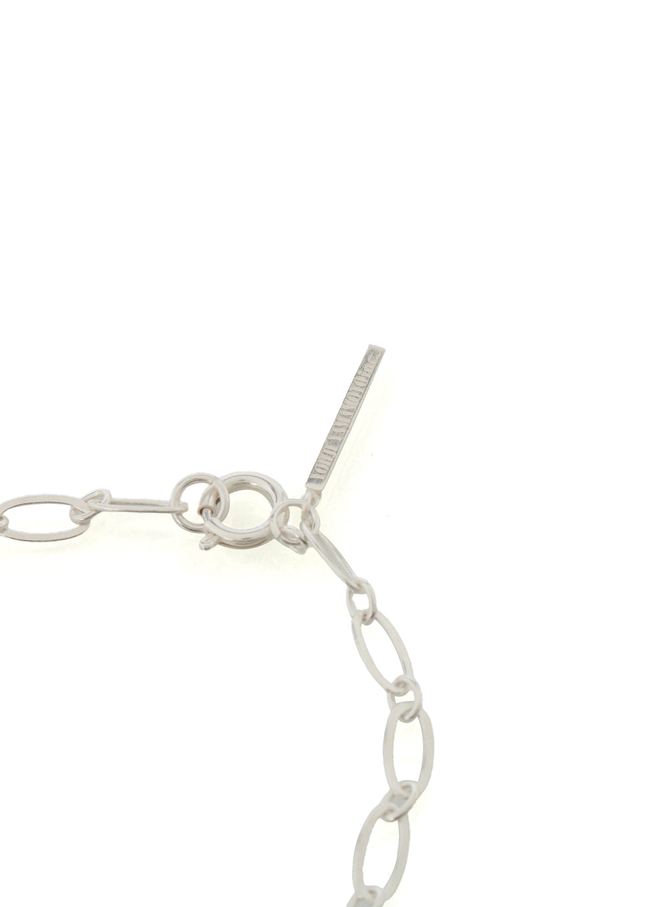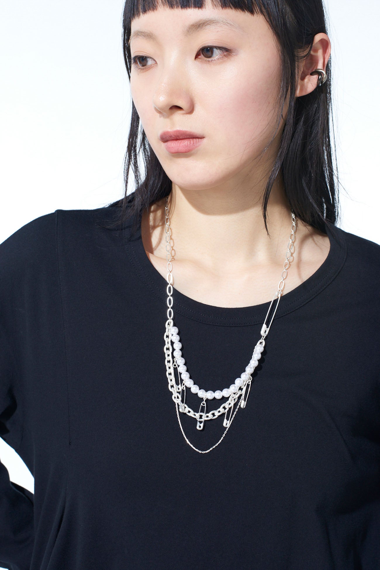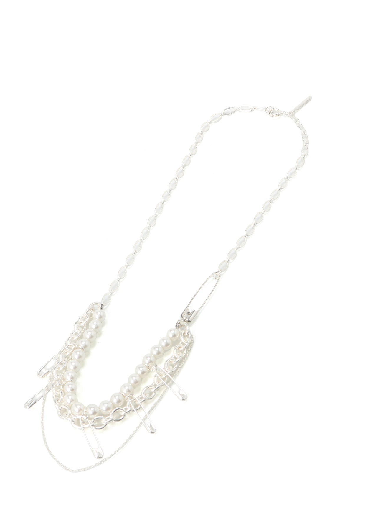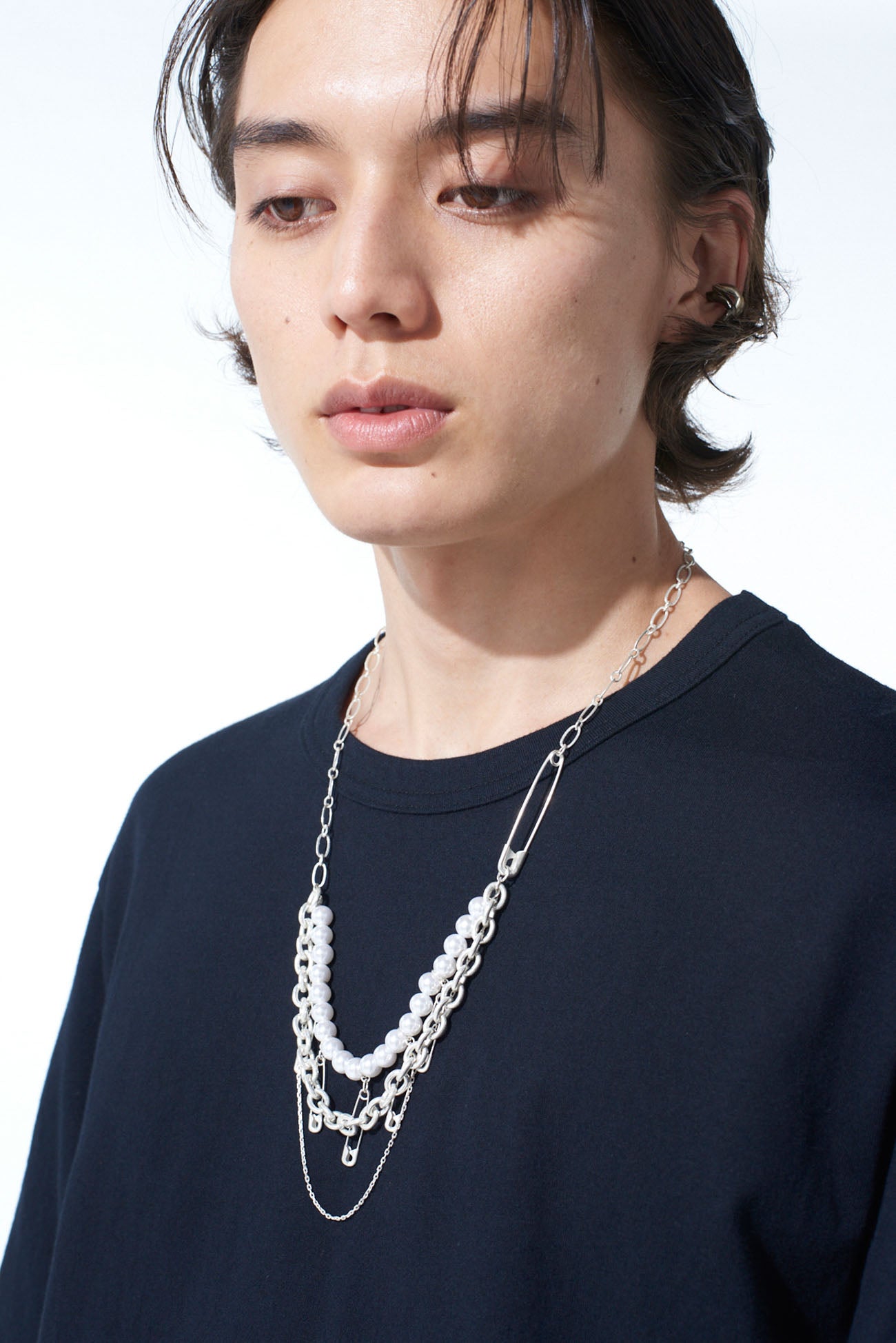 Diese Halskette kombiniert Ketten, Sicherheitsnadeln und Kunstperlen zu einem anspruchsvollen Punk-Design. Die Mischung aus Metall und Perlen erzeugt einen auffälligen Look, der aus verschiedenen Blickwinkeln anders erscheint. Mit der Zeit entwickelt das Material eine antike Patina. Ergänzen Sie sie mit dem passenden Armband.
