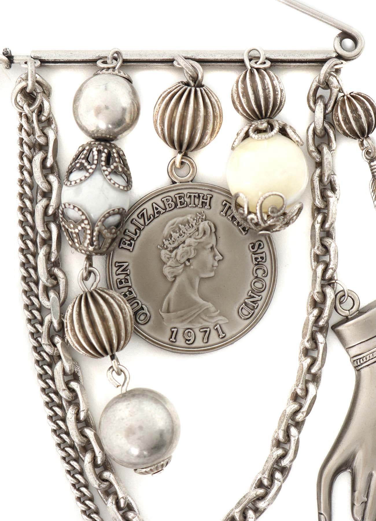 Diese Brosche mit antiken Charms aus Edelsteinen und Muscheln verleiht Outfits wie Hüten und Mänteln einen markanten Akzent. Der Nadelverschluss ermöglicht vielseitige Nutzung mit Taschen oder einem Schal. Im Laufe der Zeit entwickelt der Charm eine einzigartige Patina und passt gut zu legeren Denim-Stilen. - Vielseitige Brosche mit antiken Charms. - Perfekt zum Verschönern von Hüten, Mänteln u.a. - Nadelverschluss für Taschen und Schals geeignet. - Entwickelt mit der Zeit eine einzigartige Patina. - Passt gut zu legeren Denim-Stilen für einzigartigen Look.
