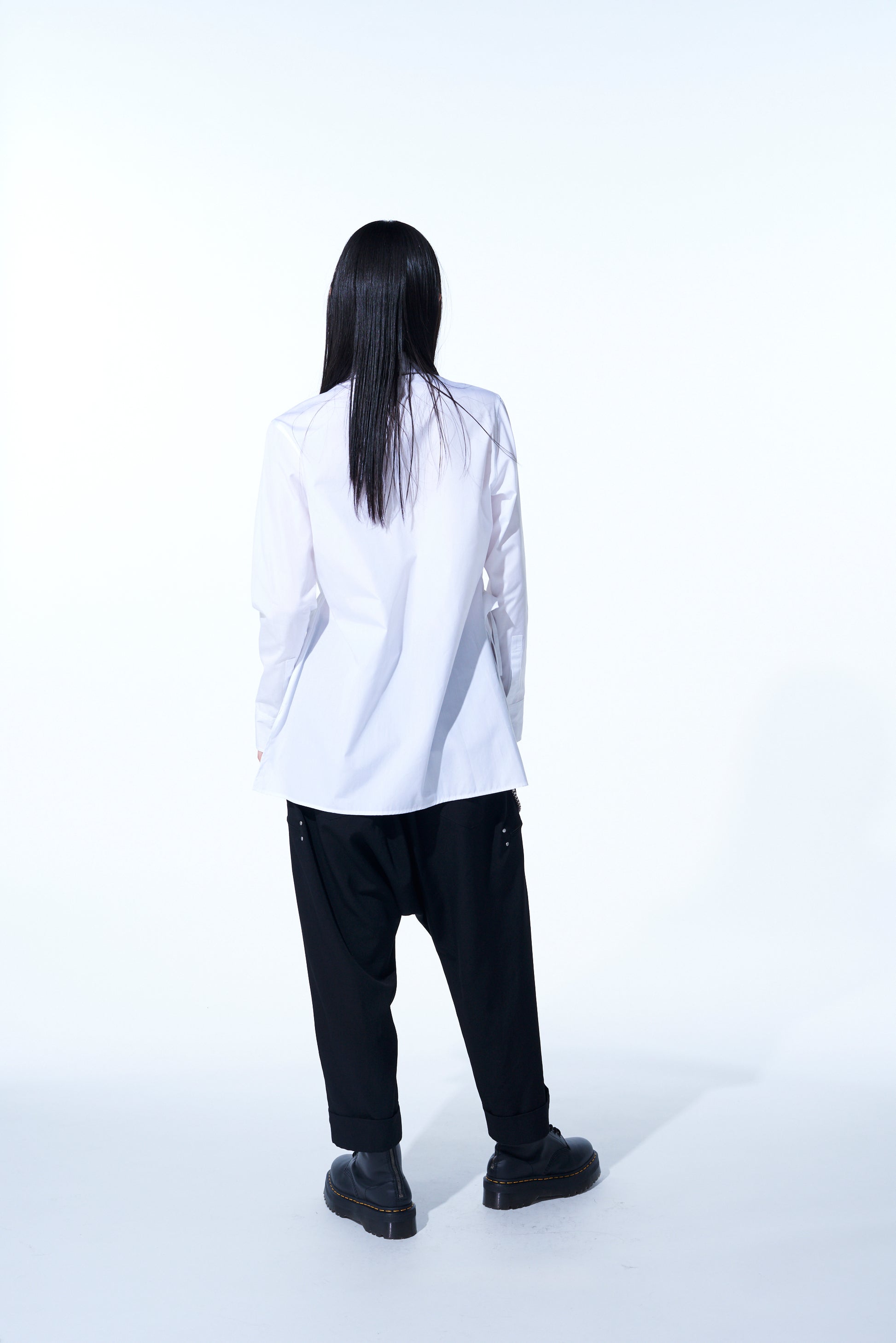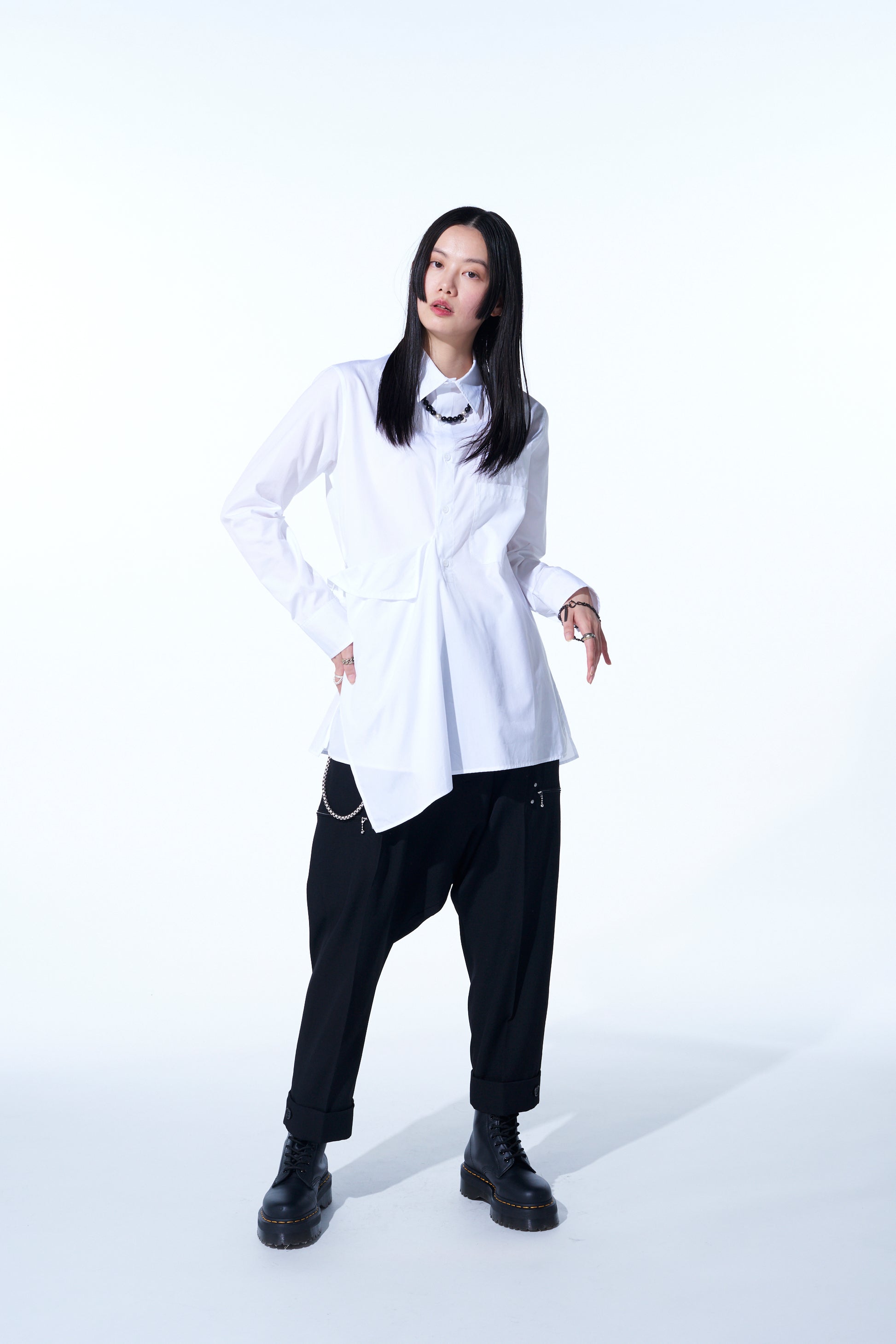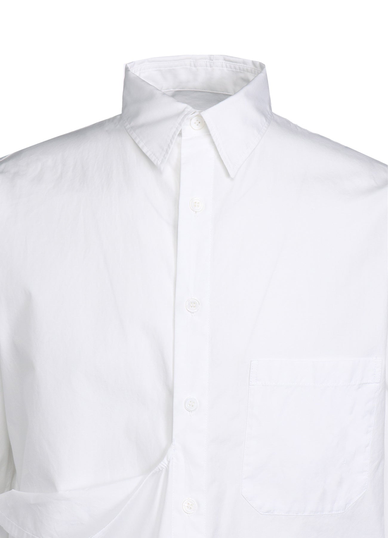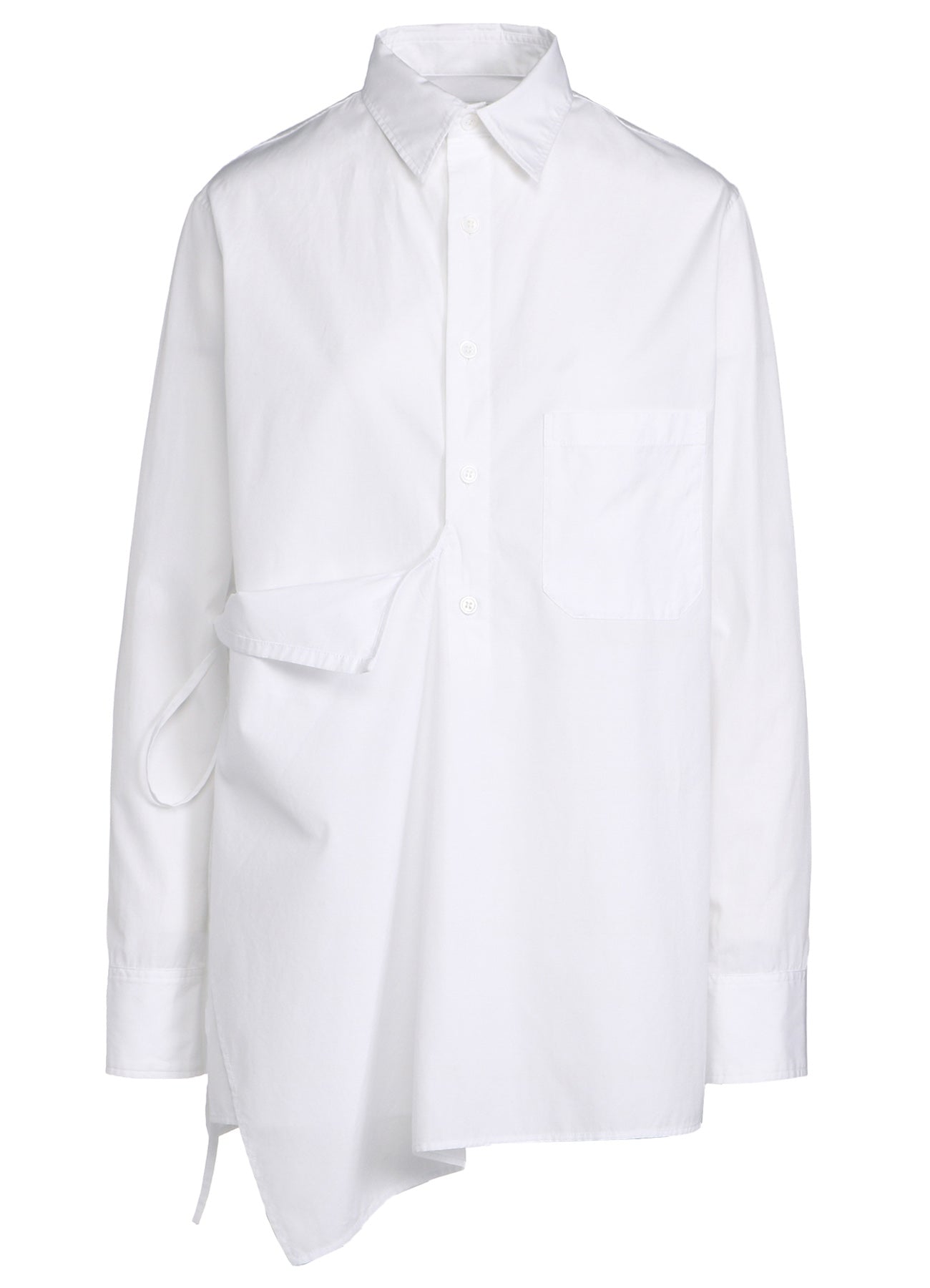 Ein kunstvoll gestaltetes Hemd, das verschiedene Frontstil-Anordnungen ermöglicht. Der rechte Seitenzug durch die linke Vorderblende erzeugt Drapierung am Saum. Das Damenschnittmuster bietet eine enge Passform an Schultern und Armen, mit einem ausgestellten Saum. Es hat eine moderate Länge, die für jeden Hosenstil geeignet ist, und besteht aus glänzendem Baumwoll-Broadcloth, das für jede Saison geeignet ist.