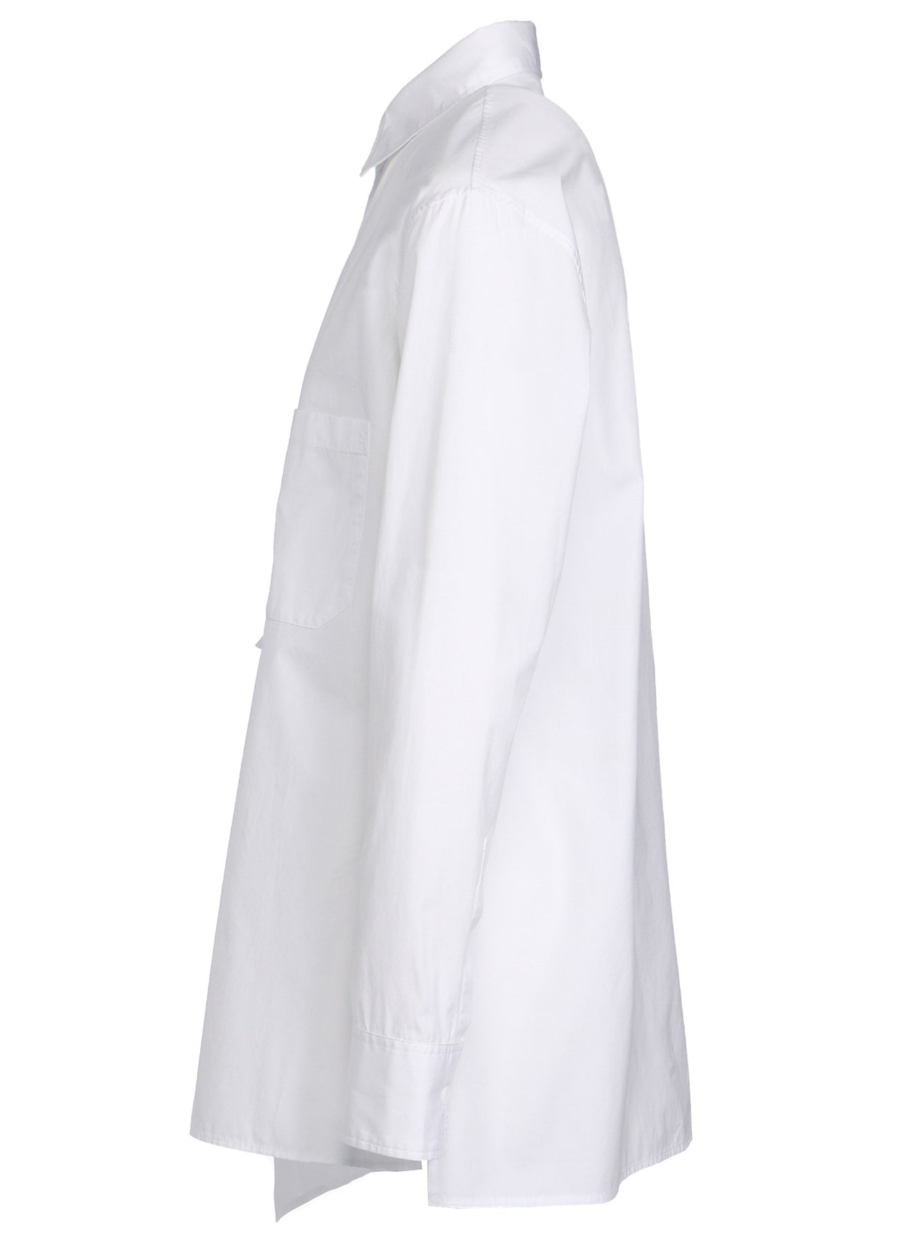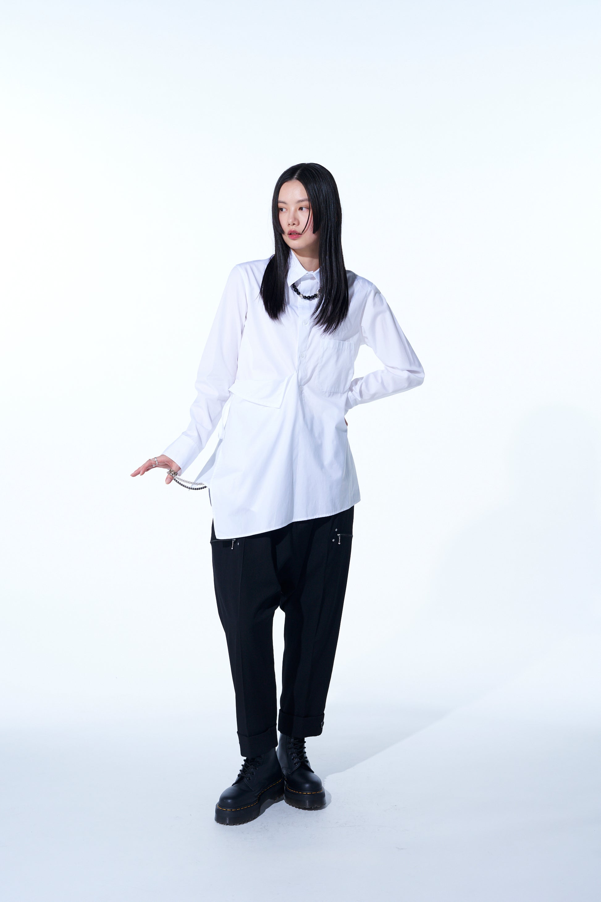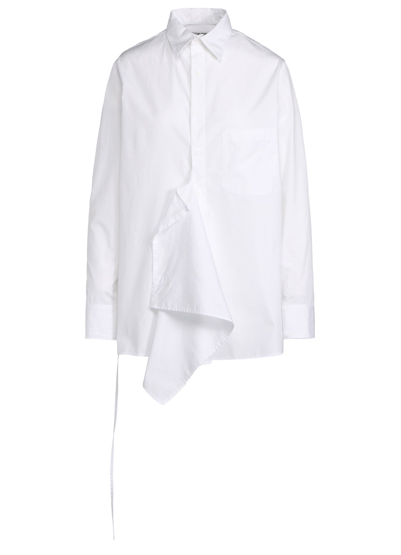 Ein kunstvoll gestaltetes Hemd, das verschiedene Frontstil-Anordnungen ermöglicht. Der rechte Seitenzug durch die linke Vorderblende erzeugt Drapierung am Saum. Das Damenschnittmuster bietet eine enge Passform an Schultern und Armen, mit einem ausgestellten Saum. Es hat eine moderate Länge, die für jeden Hosenstil geeignet ist, und besteht aus glänzendem Baumwoll-Broadcloth, das für jede Saison geeignet ist.