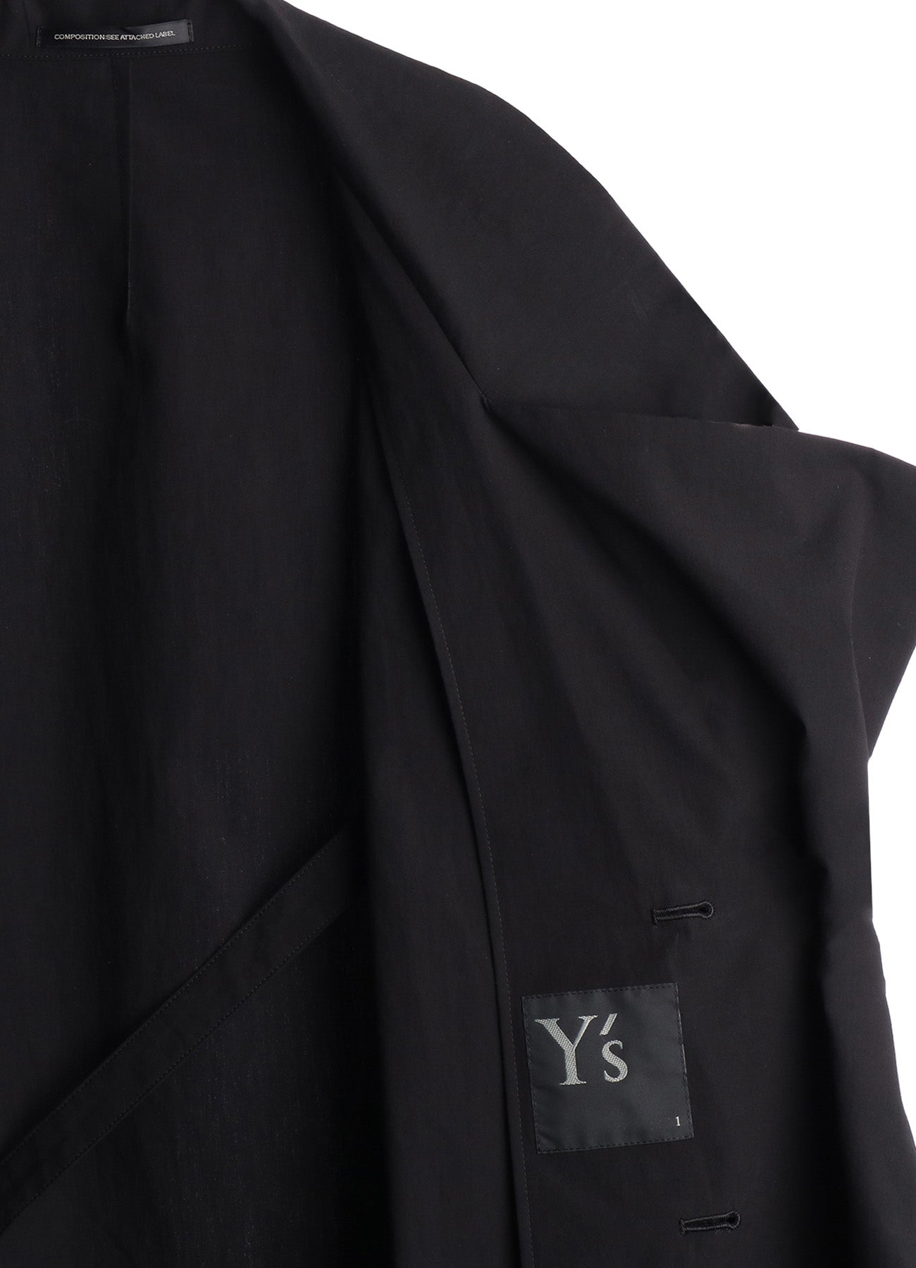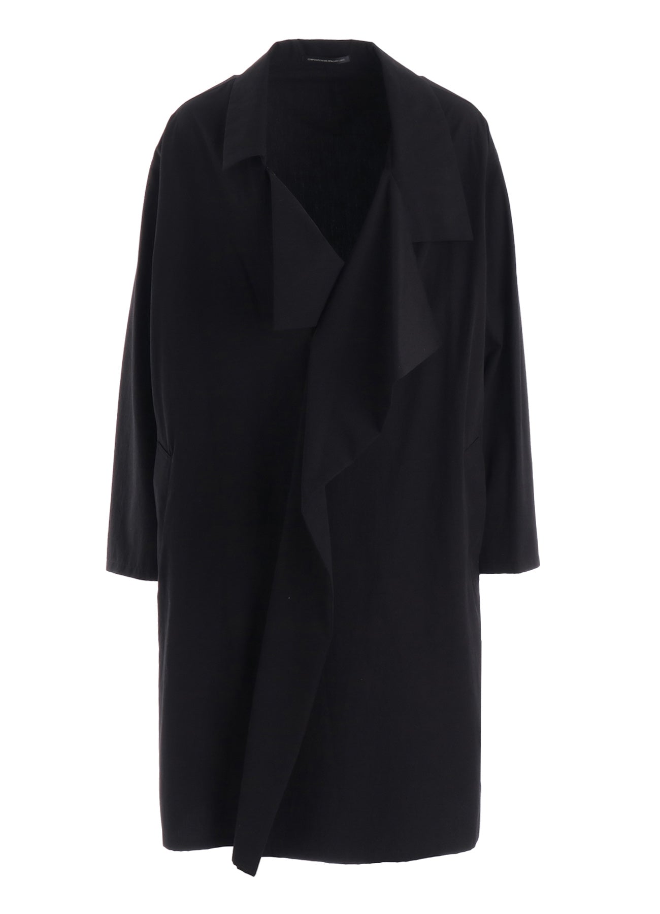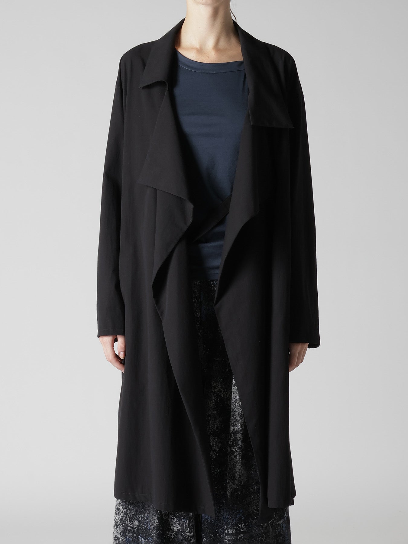 A cotton lapel coat featuring a soft-washed texture. The garment highlights accent wrinkles and a delicate puff in the fabric that effortlessly creates an elegant drapery from the neckline, offering a dynamic silhouette. Additionally, a decorative wrapped belt accentuates its overall design.