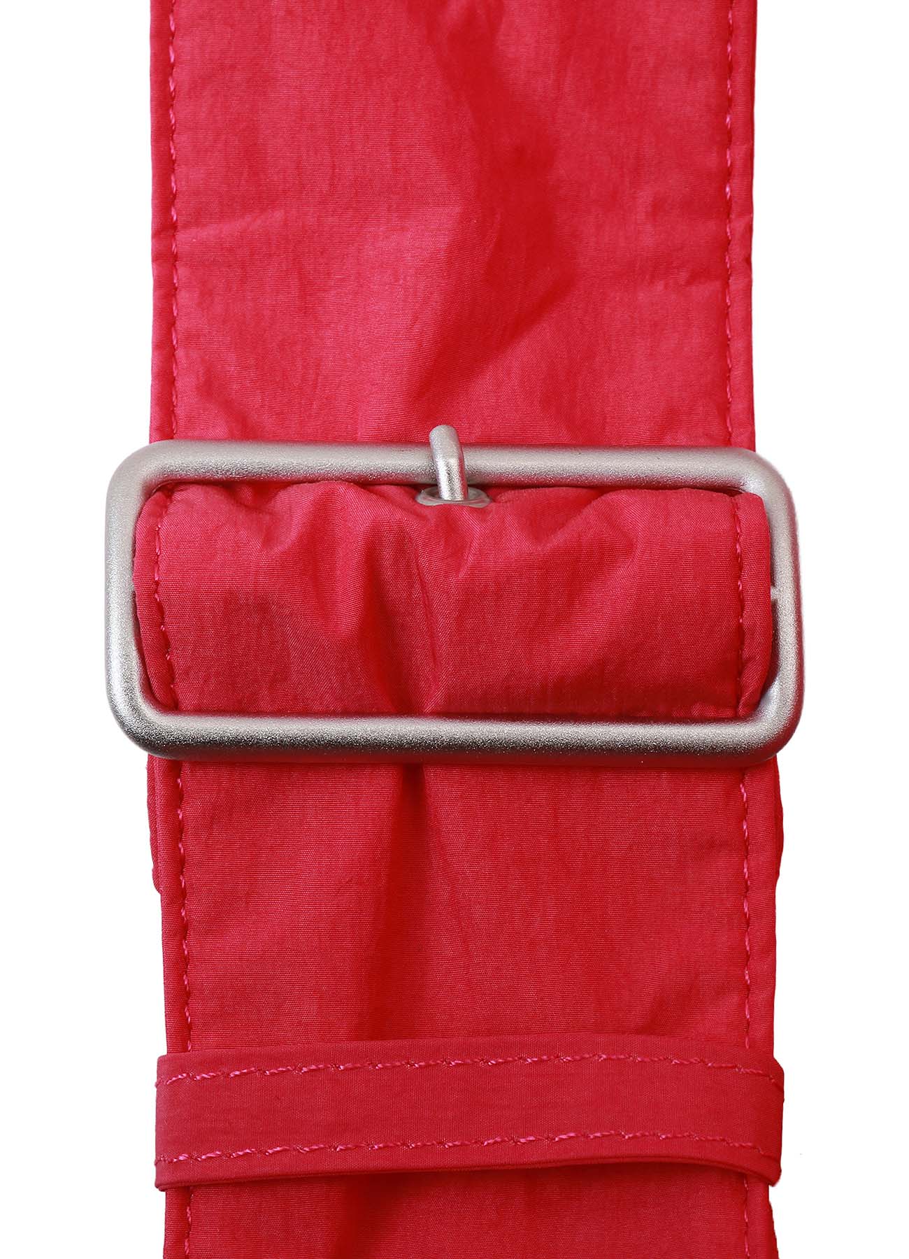 This vintage-inspired nylon bag features a gyoza shape, with a perfect glossy finish and natural wrinkles. The updated design includes a large buckle and adjustable handles, adding a modern touch to a classic style. Inside, it offers practical pockets for added convenience.