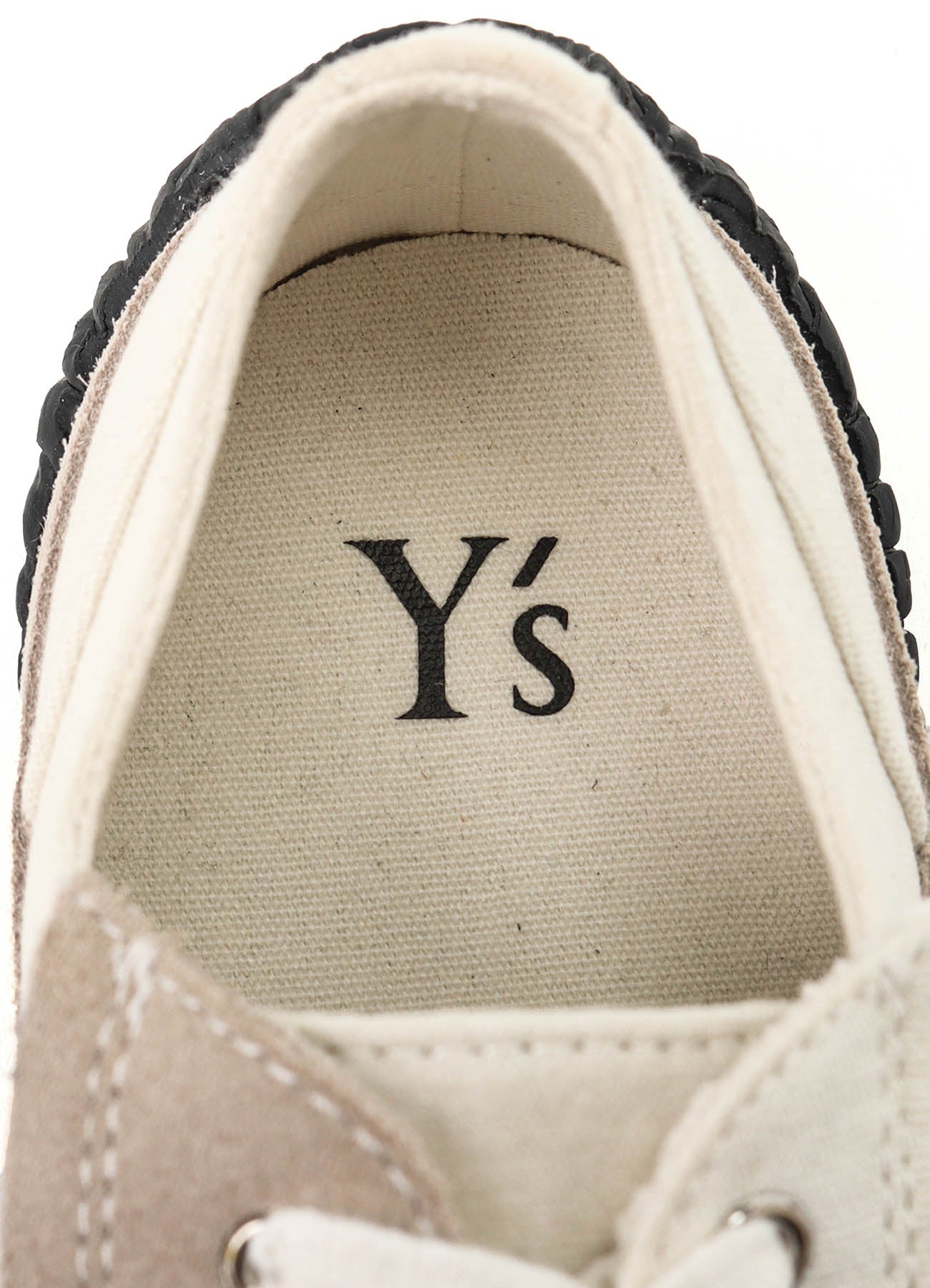 Ein vielseitiger Low-Cut-Sneaker, der Canvas, glattes Leder und Velours für eine moderne, aber schlichte Silhouette kombiniert. Er enthält sowohl elastische als auch normale Schnürsenkel, und das Design mit der kleinen Öffnung deutet darauf hin, dass das obere Loch nicht geschnürt werden soll. Beachten Sie mögliche Farbübertragungen aufgrund der Natur des Leders; vermeiden Sie es, ihn mit hellfarbiger Kleidung zu kombinieren.