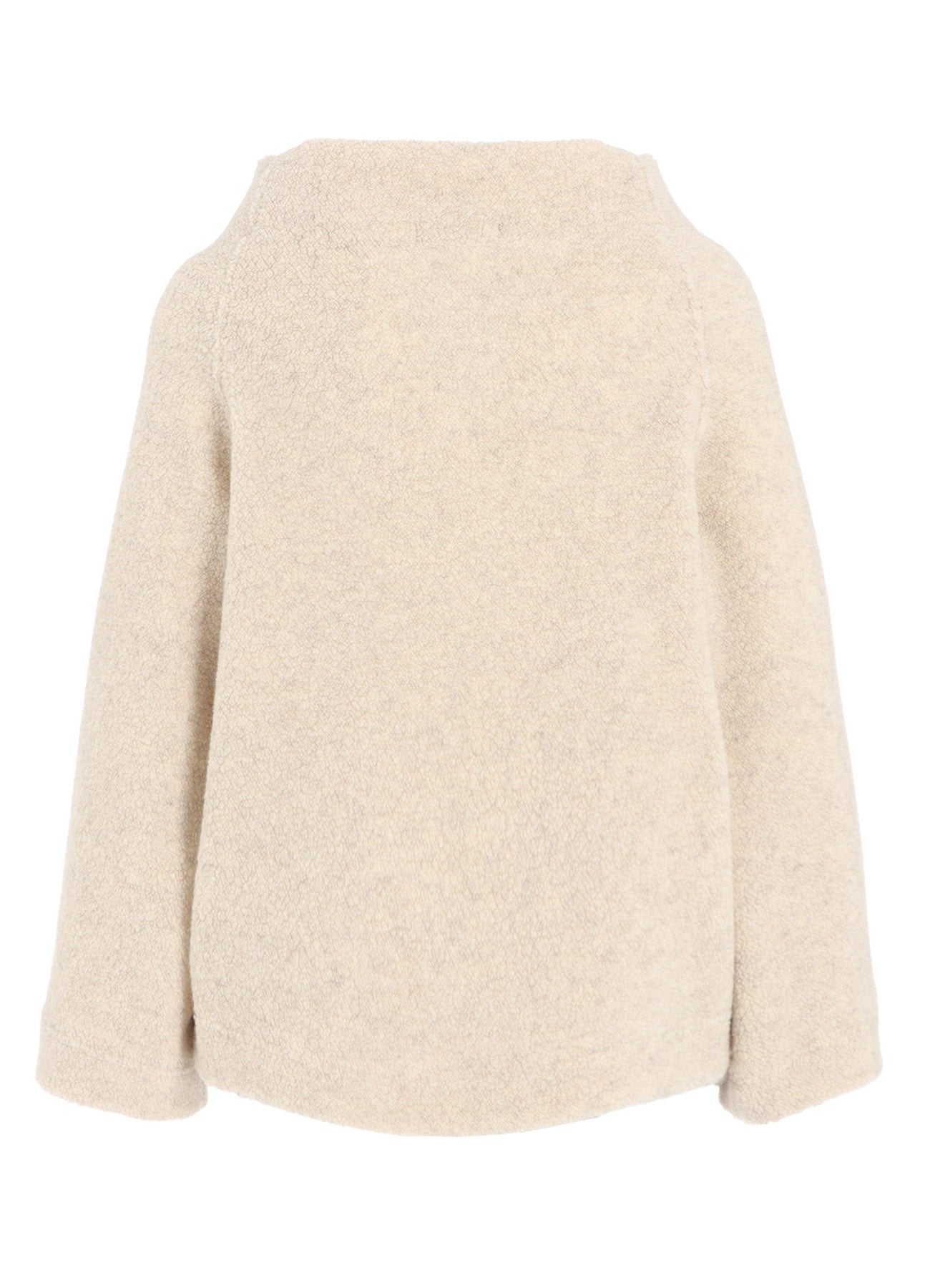 This lap jacket is crafted from pile fabric, offering a warm texture and lightweight feel. Versatile styling allows you to secure it at the front or leave it to drape. It's a cozy and adaptable outerwear piece for diverse occasions, combining comfort and elegance effortlessly.