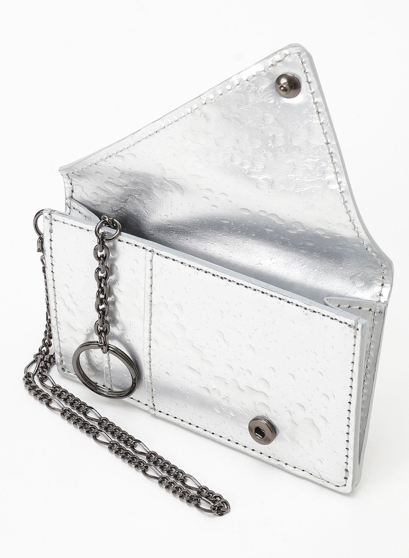 This minimalistic wallet features a triangular flap design. It has card slots on the front and a zipper coin pocket on the back. Inside, there's a double ring chain for keys. Made from foil leather, it boasts enameled droplets, each uniquely crafted by artisans.