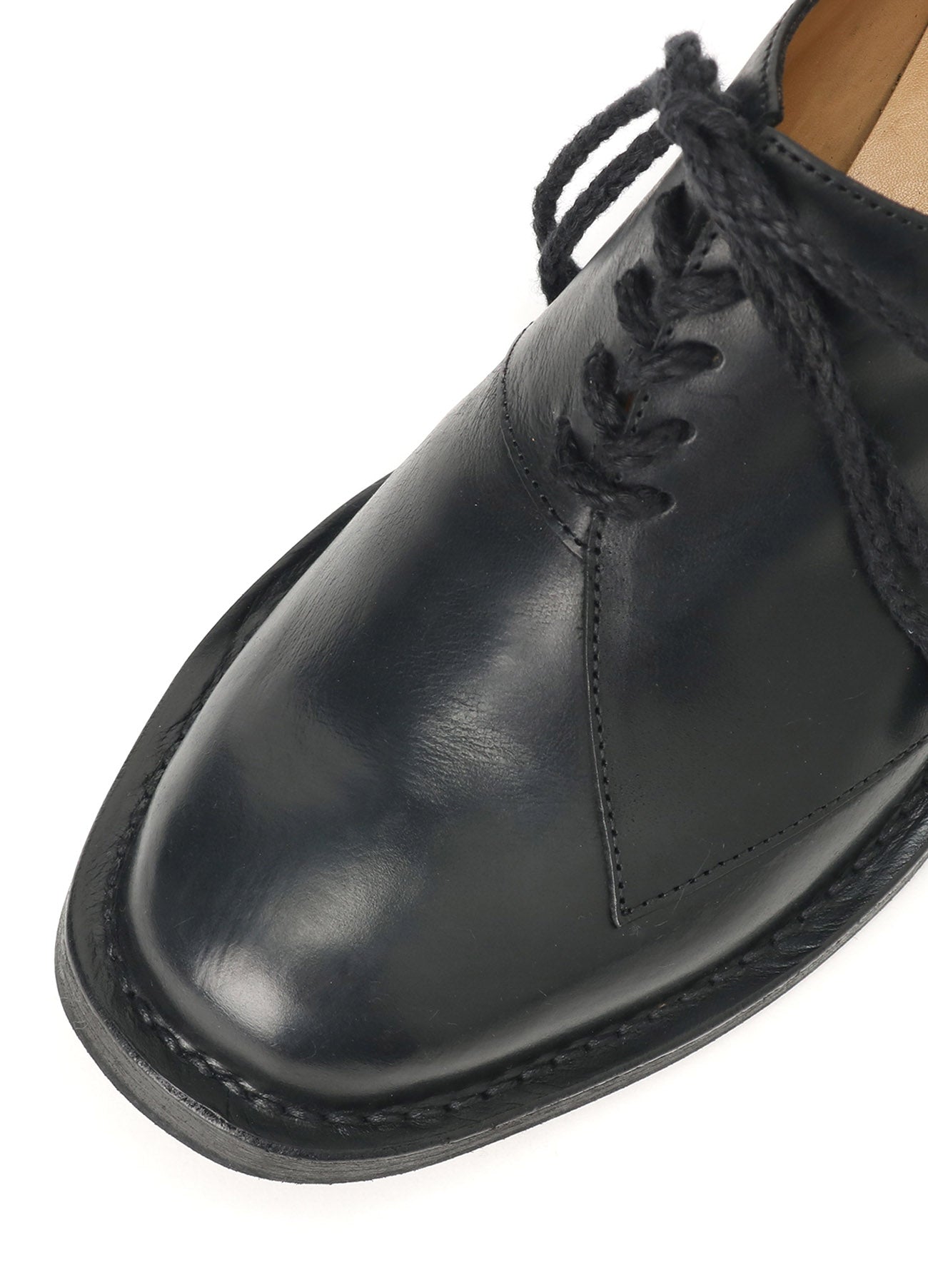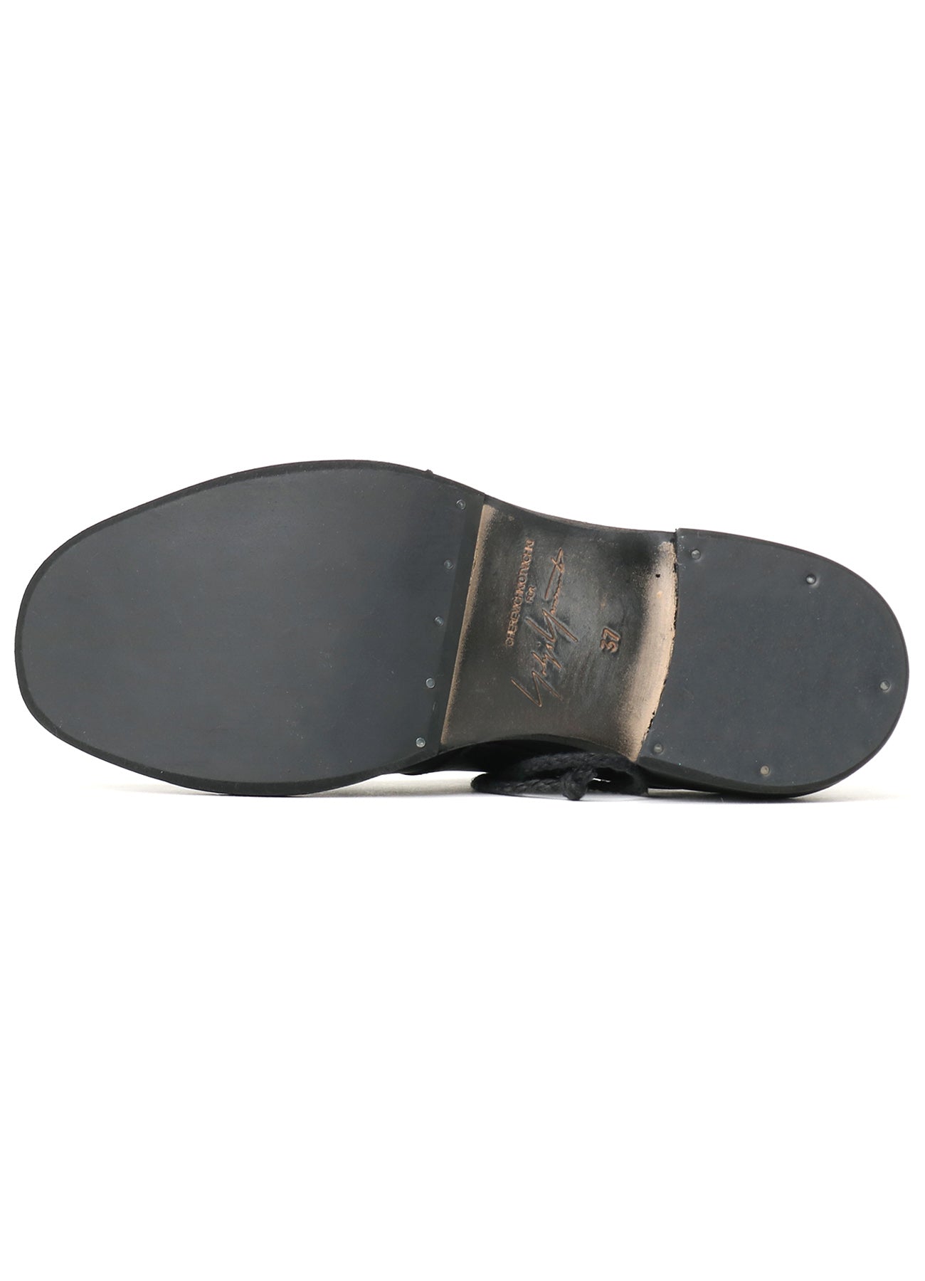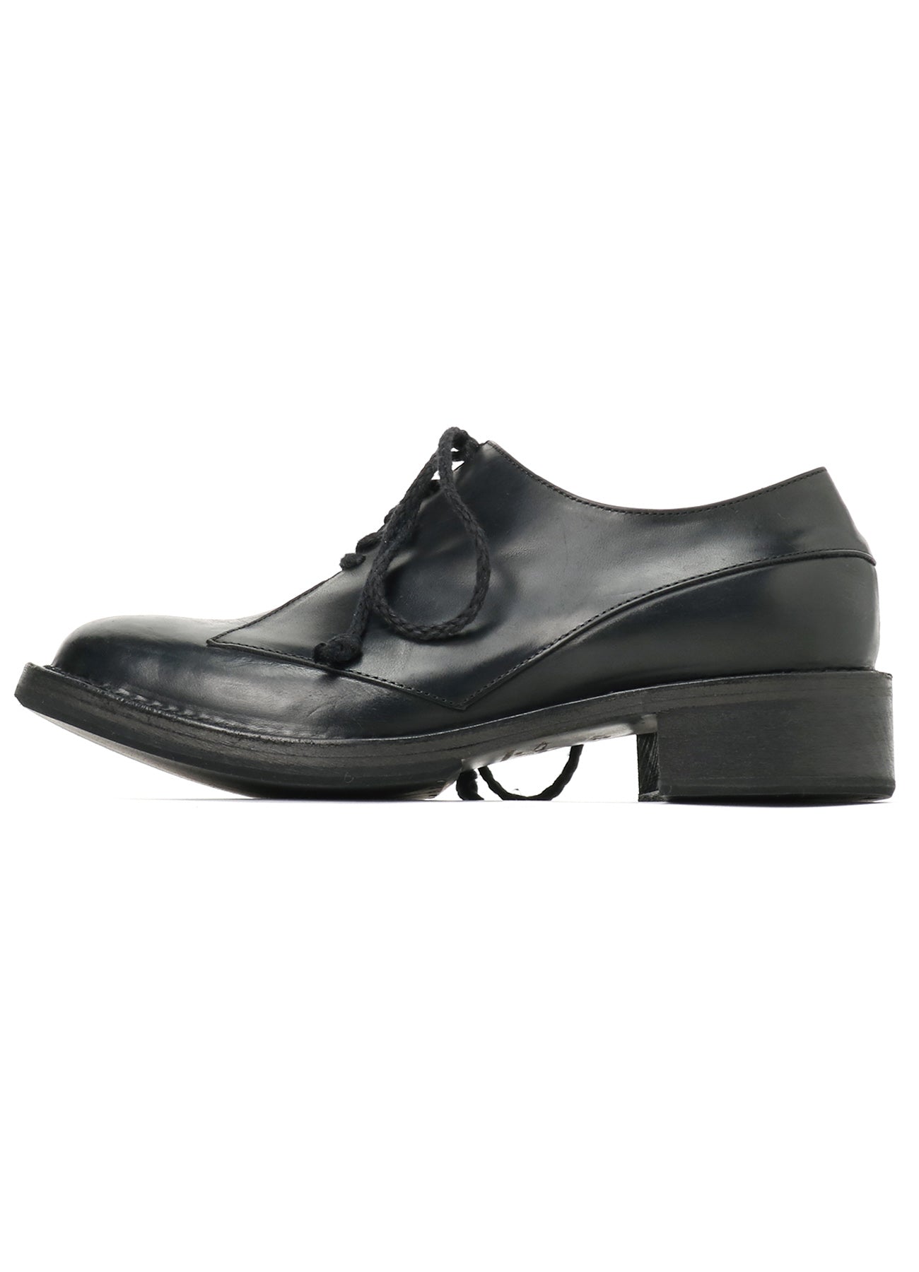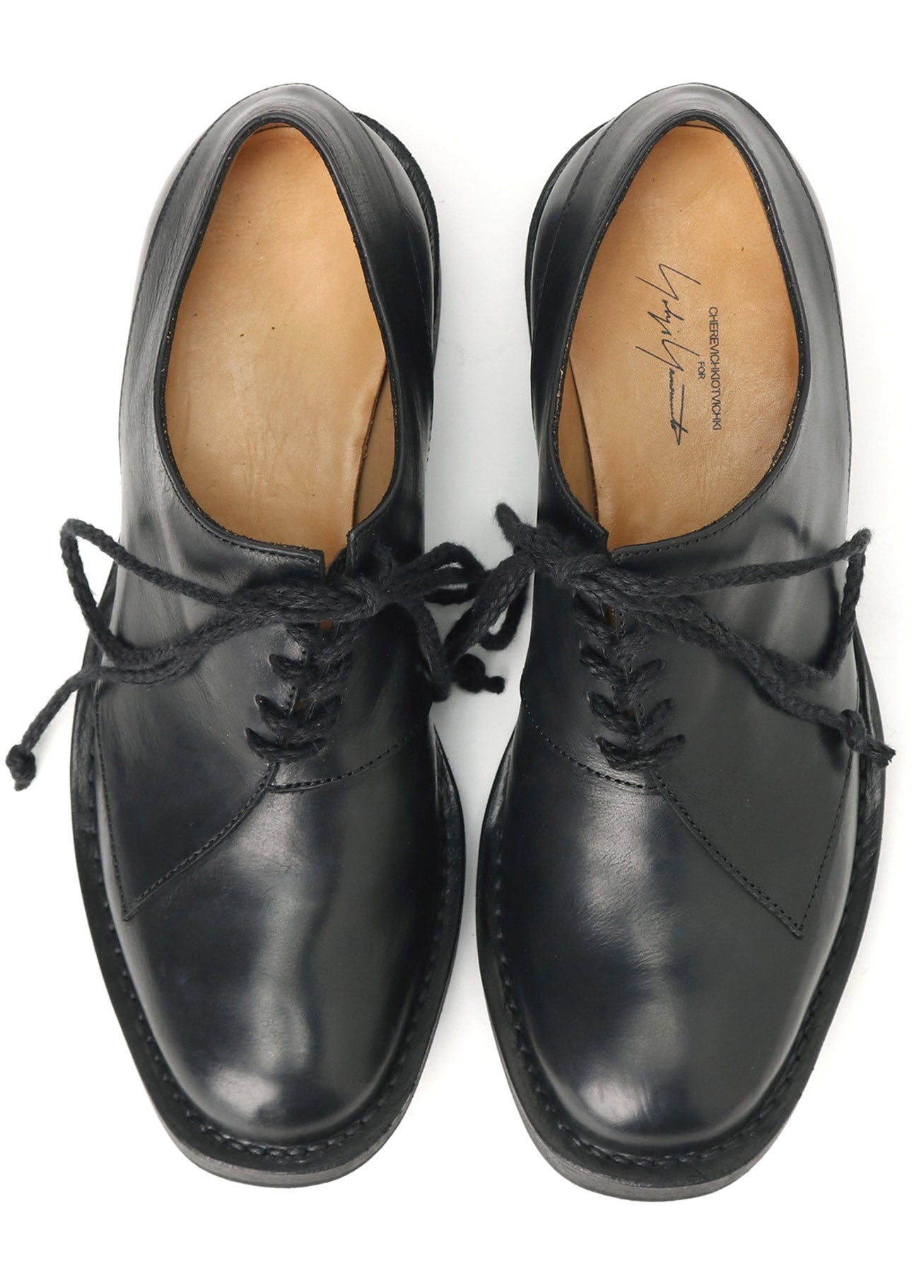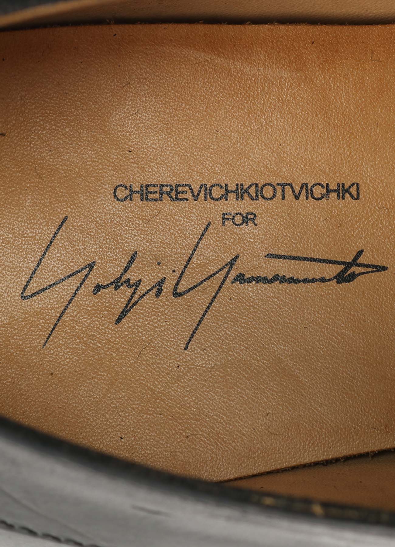 Un zapato de cuero de colaboración diseñado por CHEREVICHKIOTVICHKI para Yohji Yamamoto, utilizando cuero aceitado ligeramente rígido. Presenta una solapa asimétrica y una construcción con costura exterior para una expresión casual. Se recomienda aumentar una talla debido a una horma más pequeña.