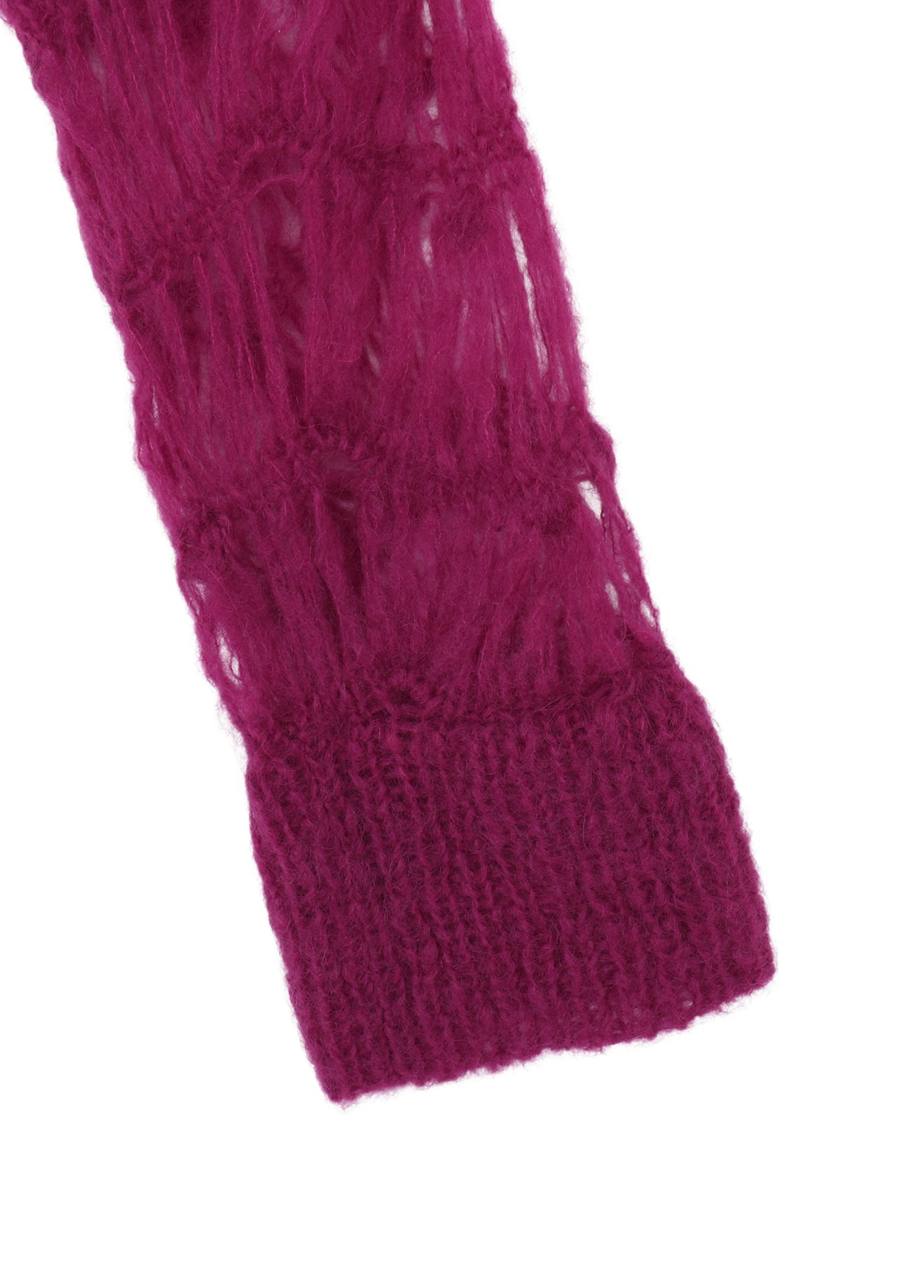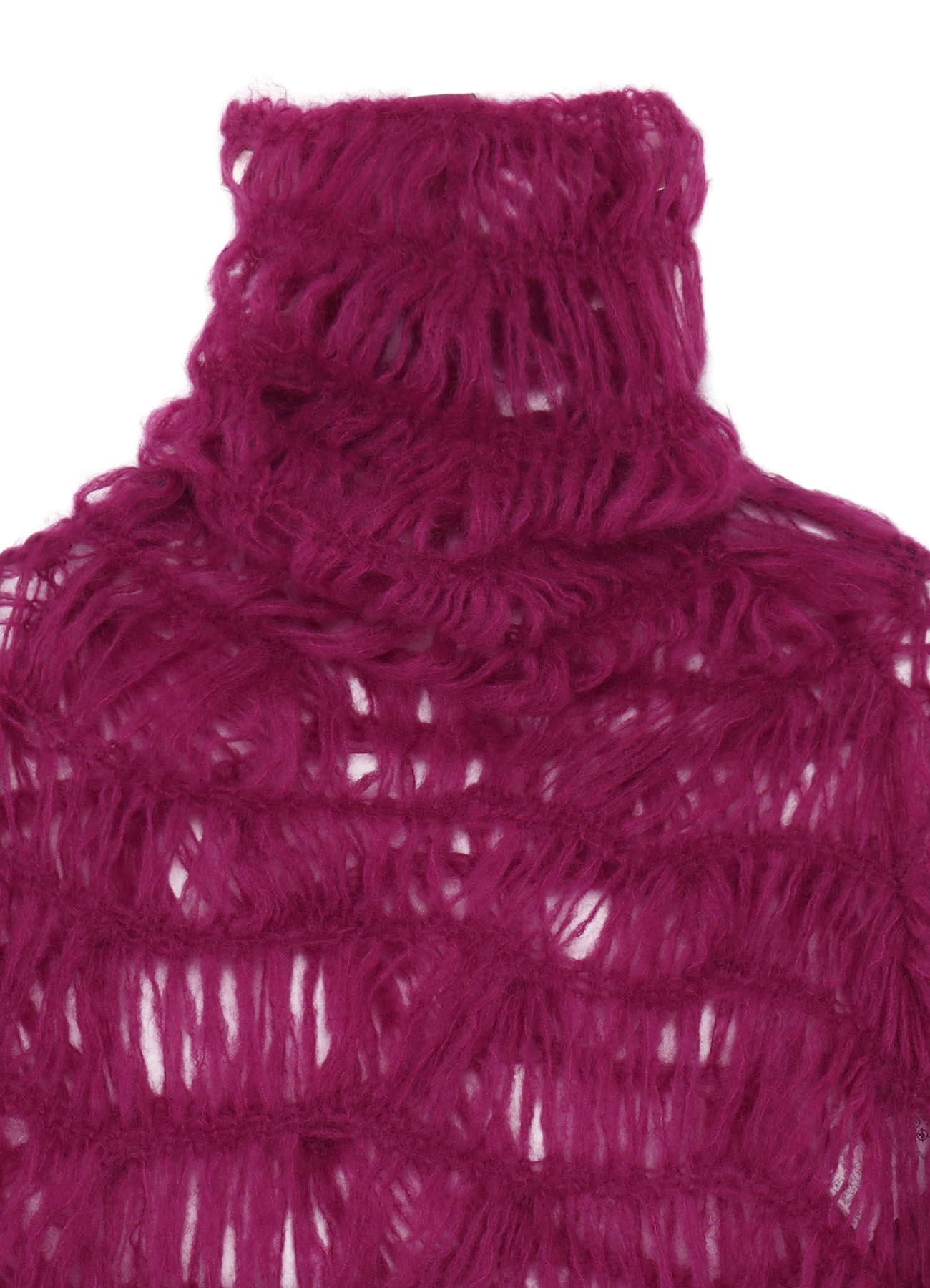 This cropped high-neck knit, made from mohair wool, can be styled with a variety of outfits such as high-waisted pants or voluminous skirts. Note that the model image showcases a sample item, and the final product may differ in size and texture. Refer to SIZE INFO for more details.