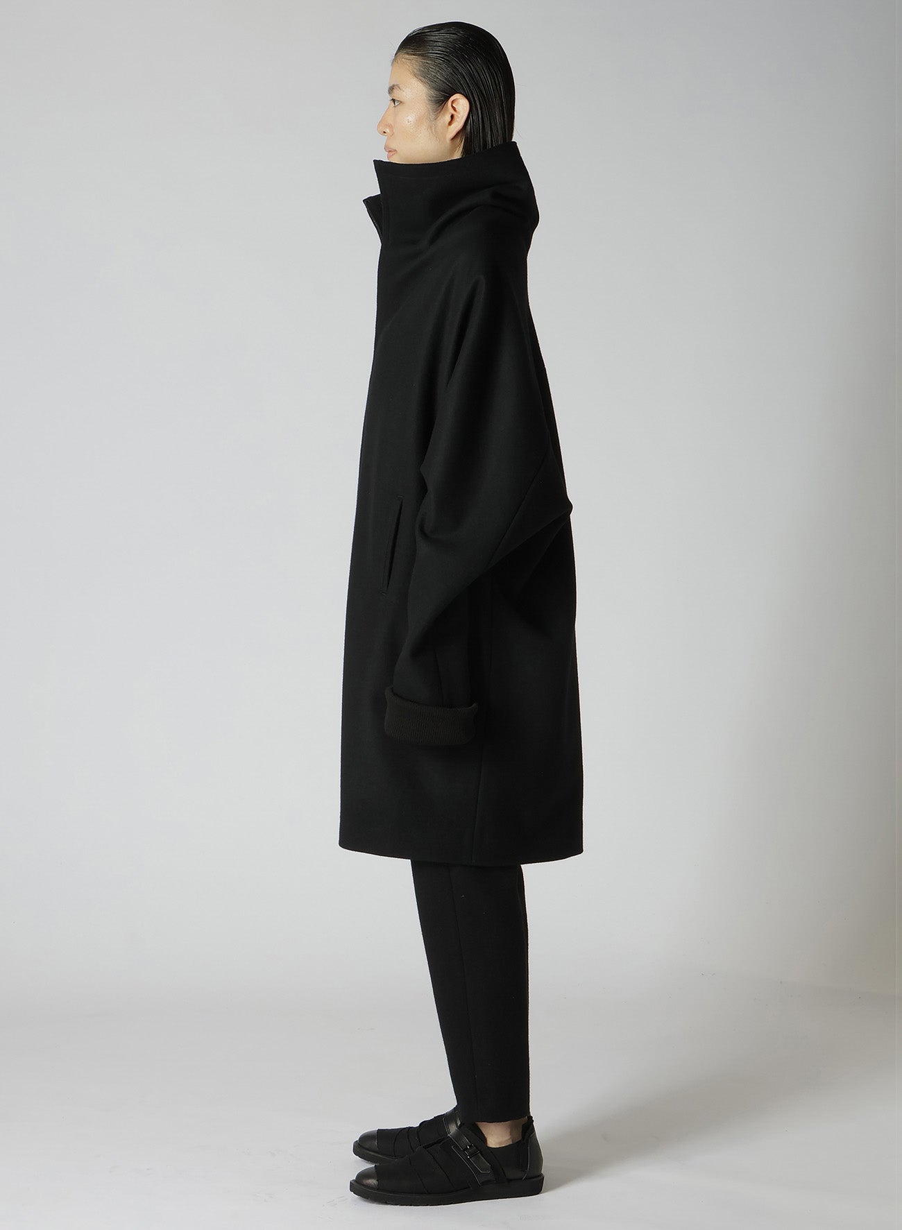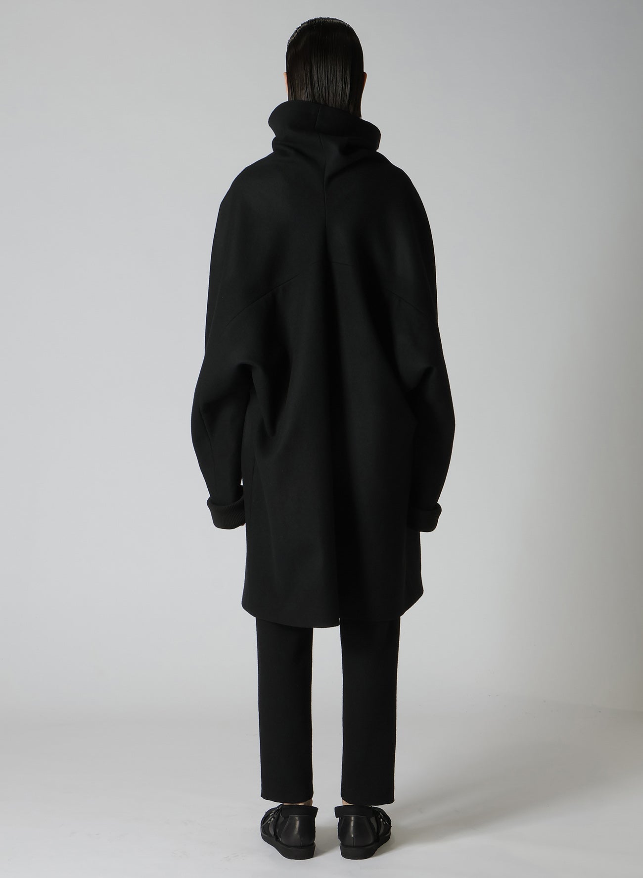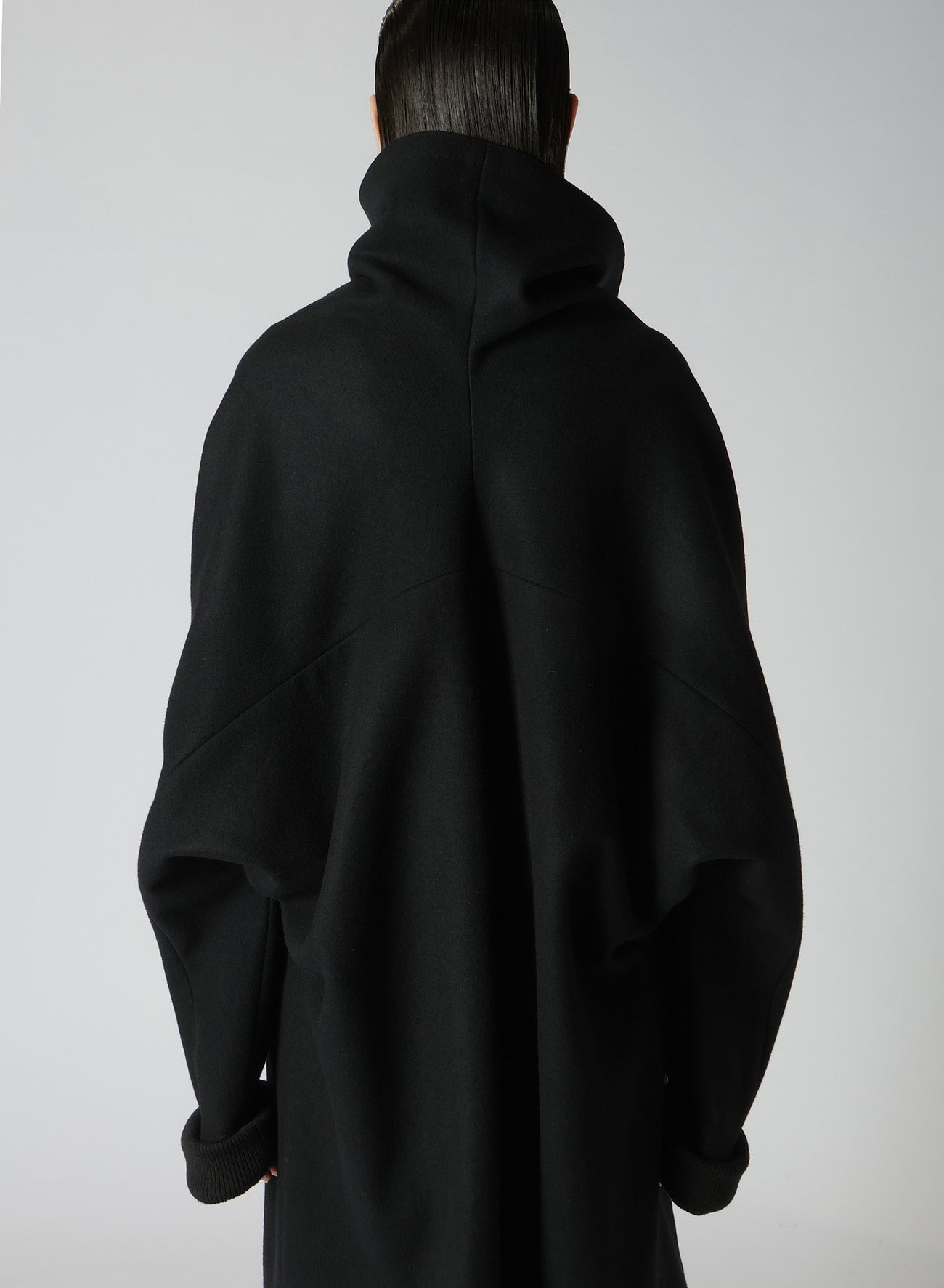 El abrigo presenta un diseño de mangas dolman y está confeccionado con lana melton mediante un proceso de fulled, ofreciendo una textura firme entrelazada con suavidad. La melton de alta densidad es lavada y secada al sol para un acabado natural. Las imágenes del modelo pueden diferir en tamaño y textura del producto final.