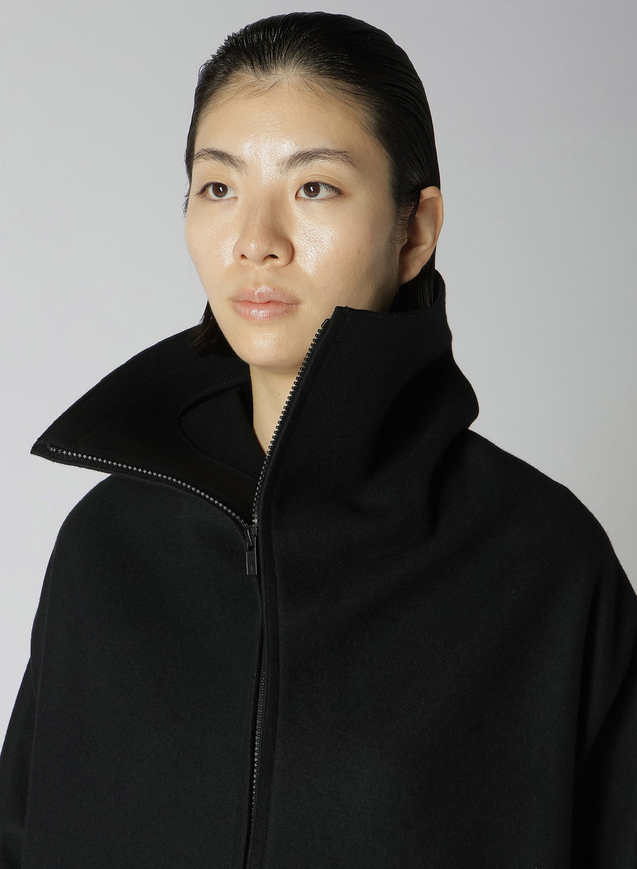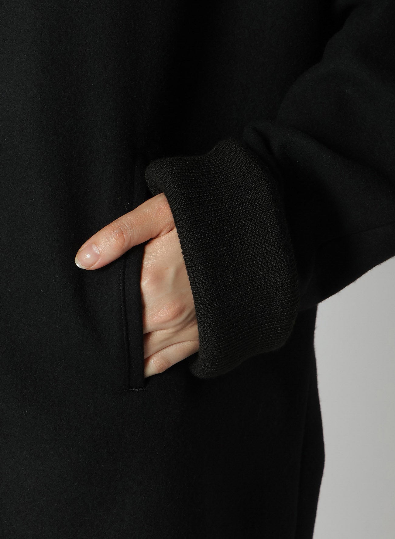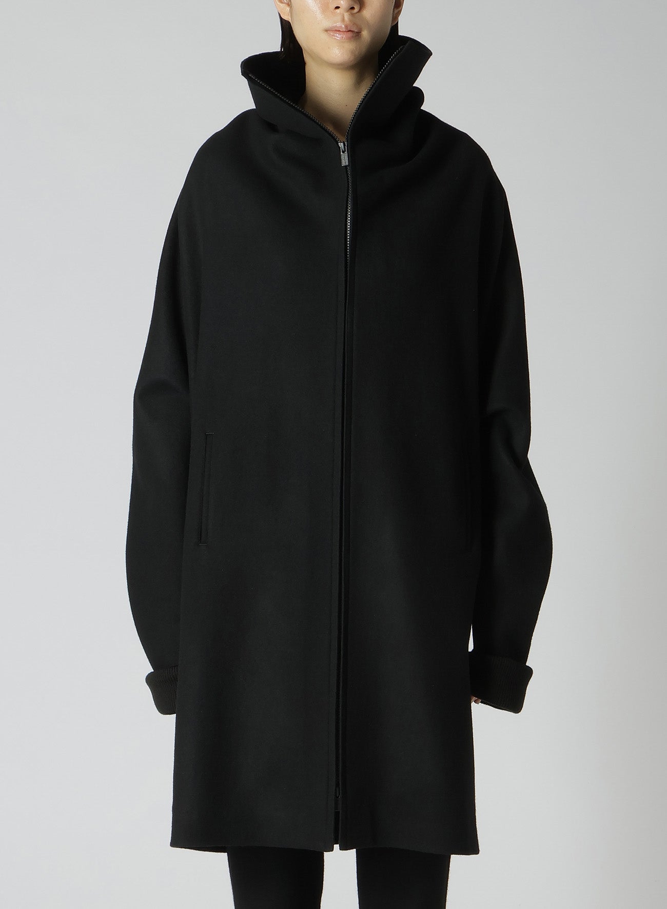 El abrigo presenta un diseño de mangas dolman y está confeccionado con lana melton mediante un proceso de fulled, ofreciendo una textura firme entrelazada con suavidad. La melton de alta densidad es lavada y secada al sol para un acabado natural. Las imágenes del modelo pueden diferir en tamaño y textura del producto final.