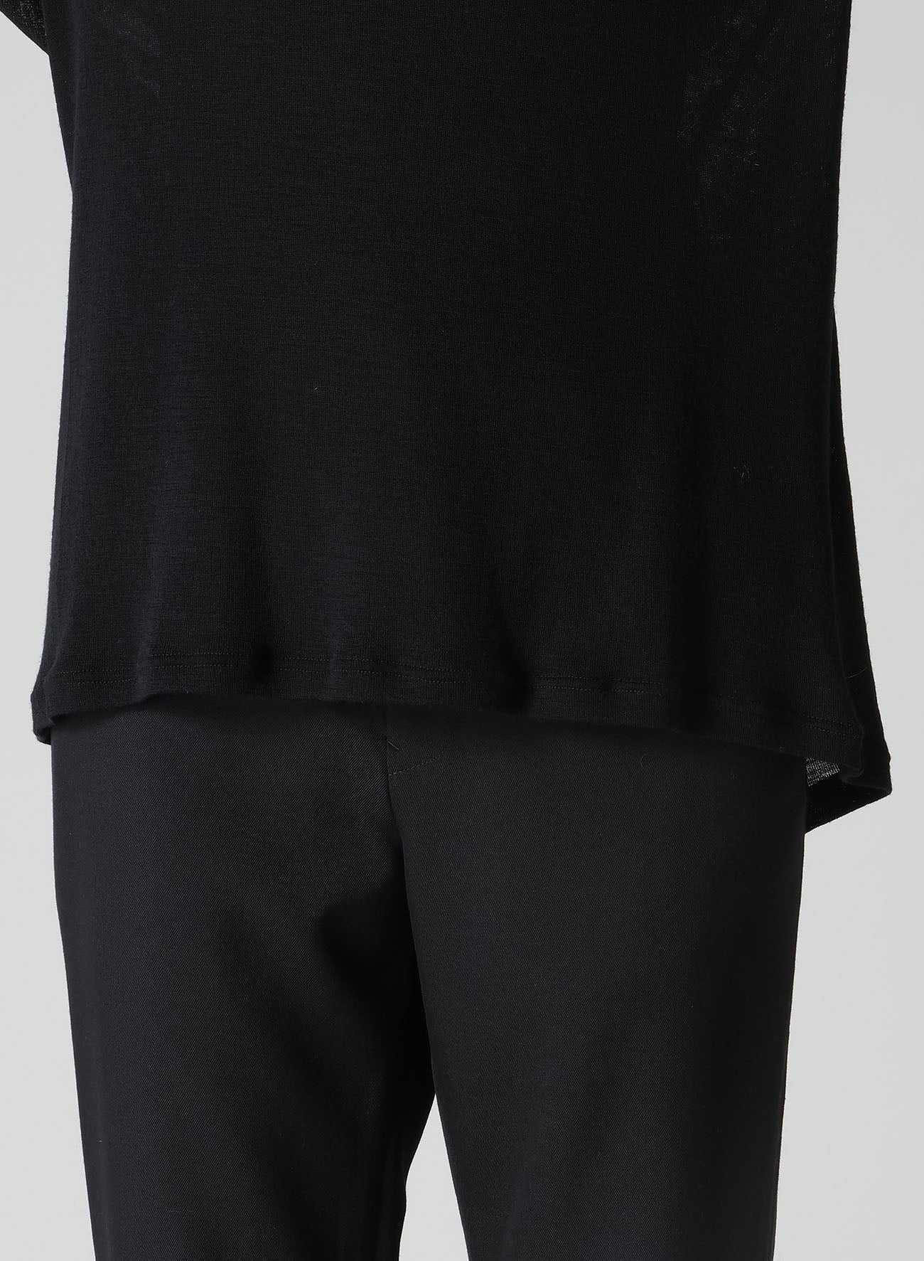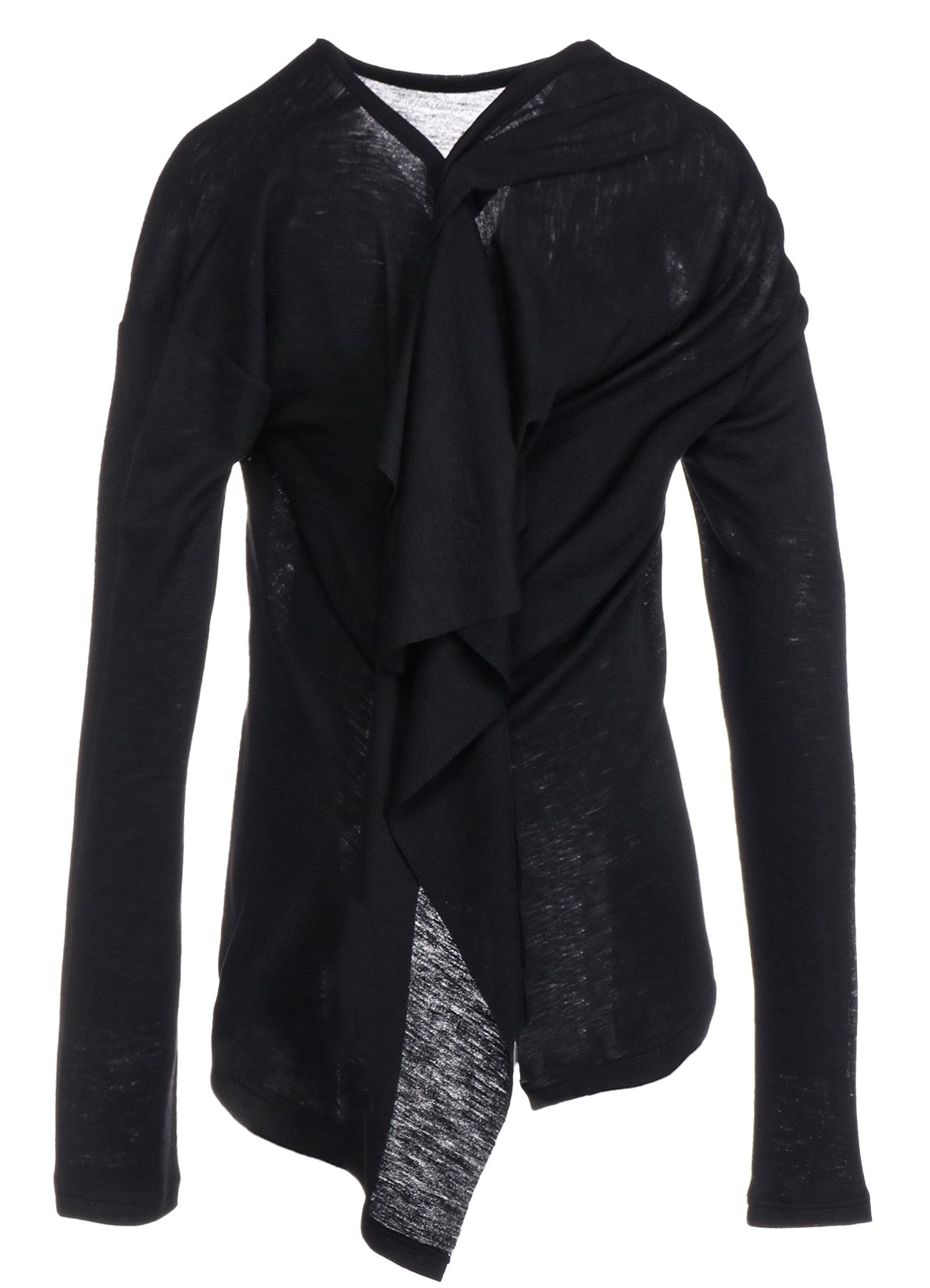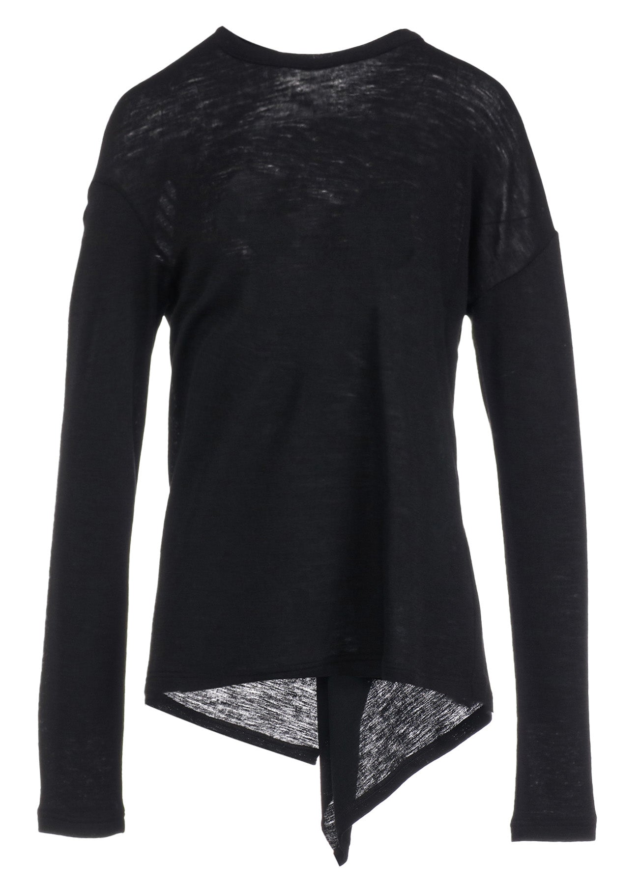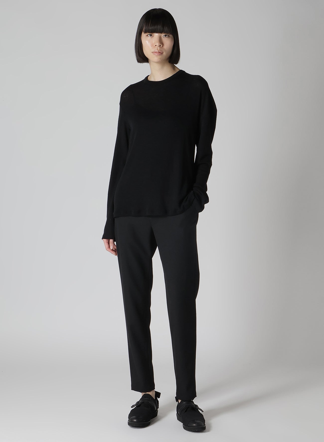 Una prenda de manga larga que presenta un estilo distintivo en la parte posterior, fabricada en lana Merino Super120 de Nueva Zelanda con un acabado en flasc. La tela está tejida con comodidad para ofrecer una sensación relajada, mostrando una hermosa caída en la espalda. Las imágenes del modelo utilizan una muestra; para tamaños y texturas precisos, consulta SIZE INFO.