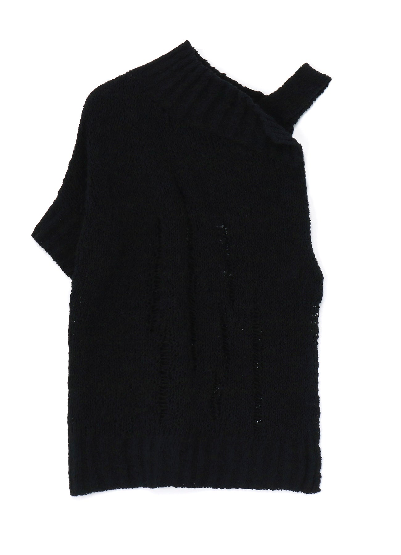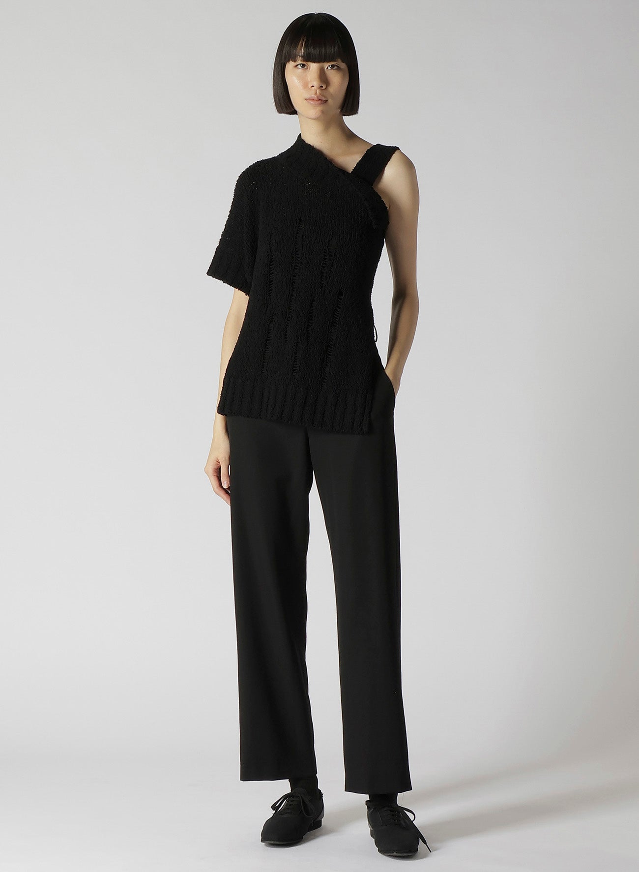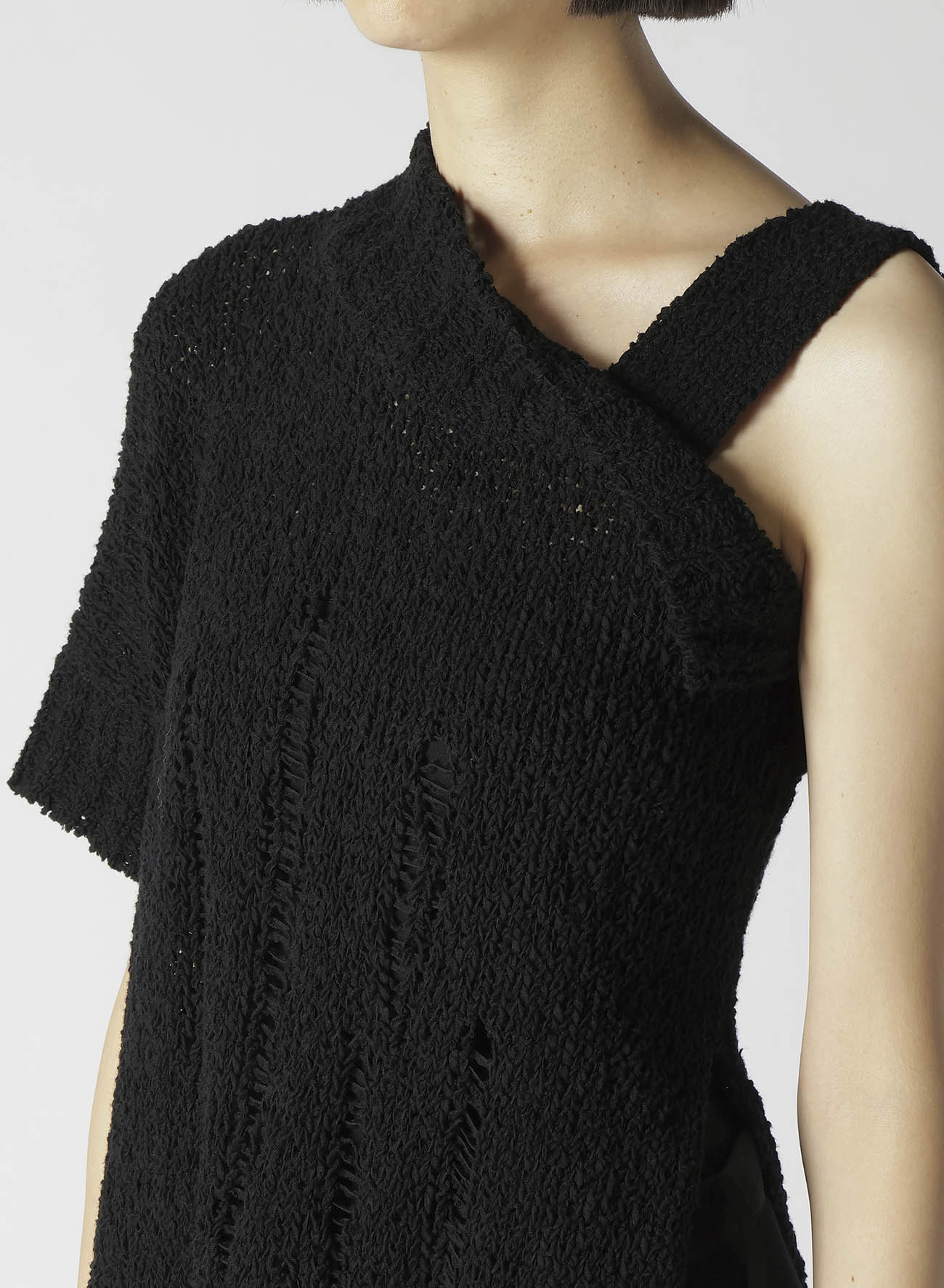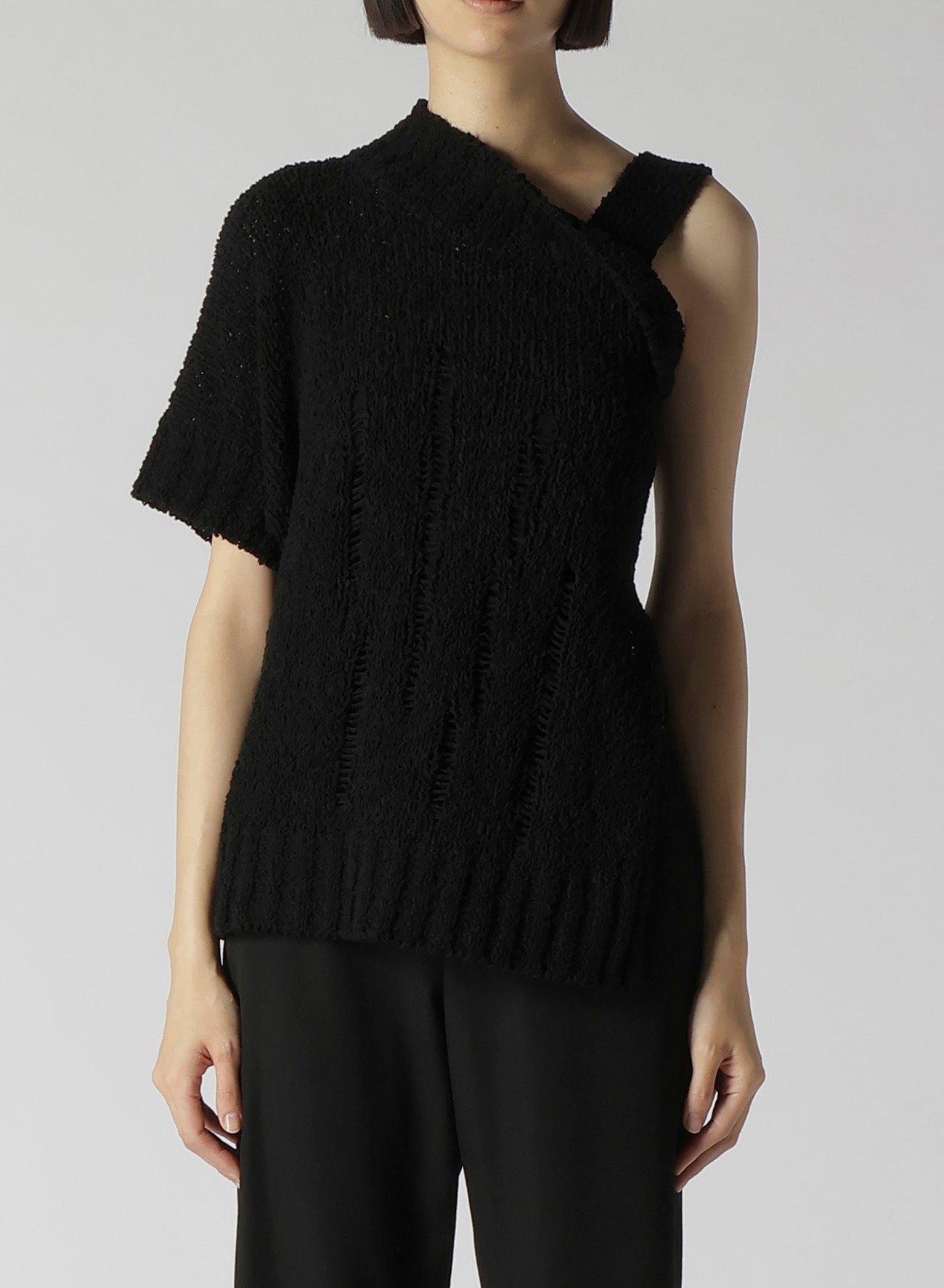 Este suéter de punto presenta un audaz diseño asimétrico en el hombro. Confeccionado en algodón ligero, ofrece una textura única y una sensación refrescante con su sutil transparencia. Las imágenes del modelo son artículos de muestra; puede haber ligeras diferencias en tamaño y textura. Por favor, consulte la INFORMACIÓN DE TAMAÑO para más detalles.