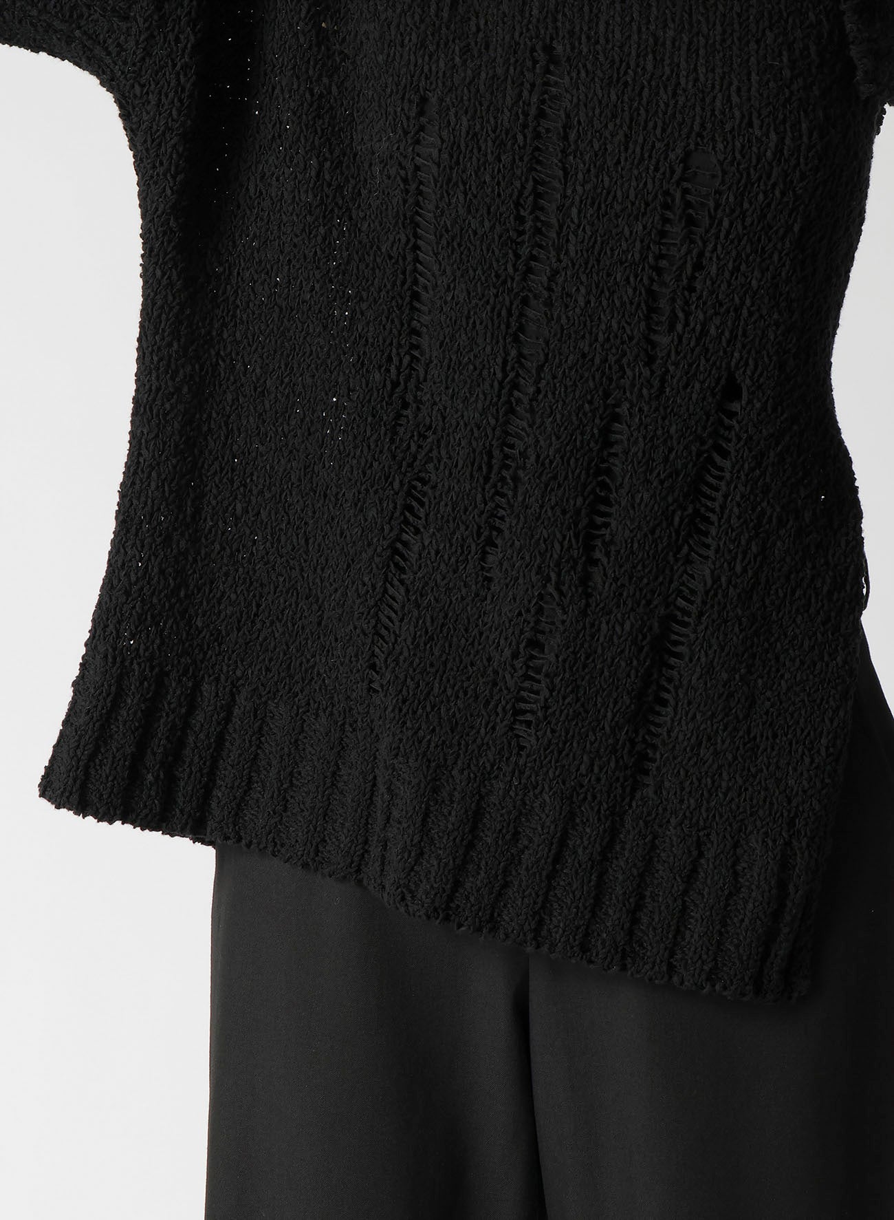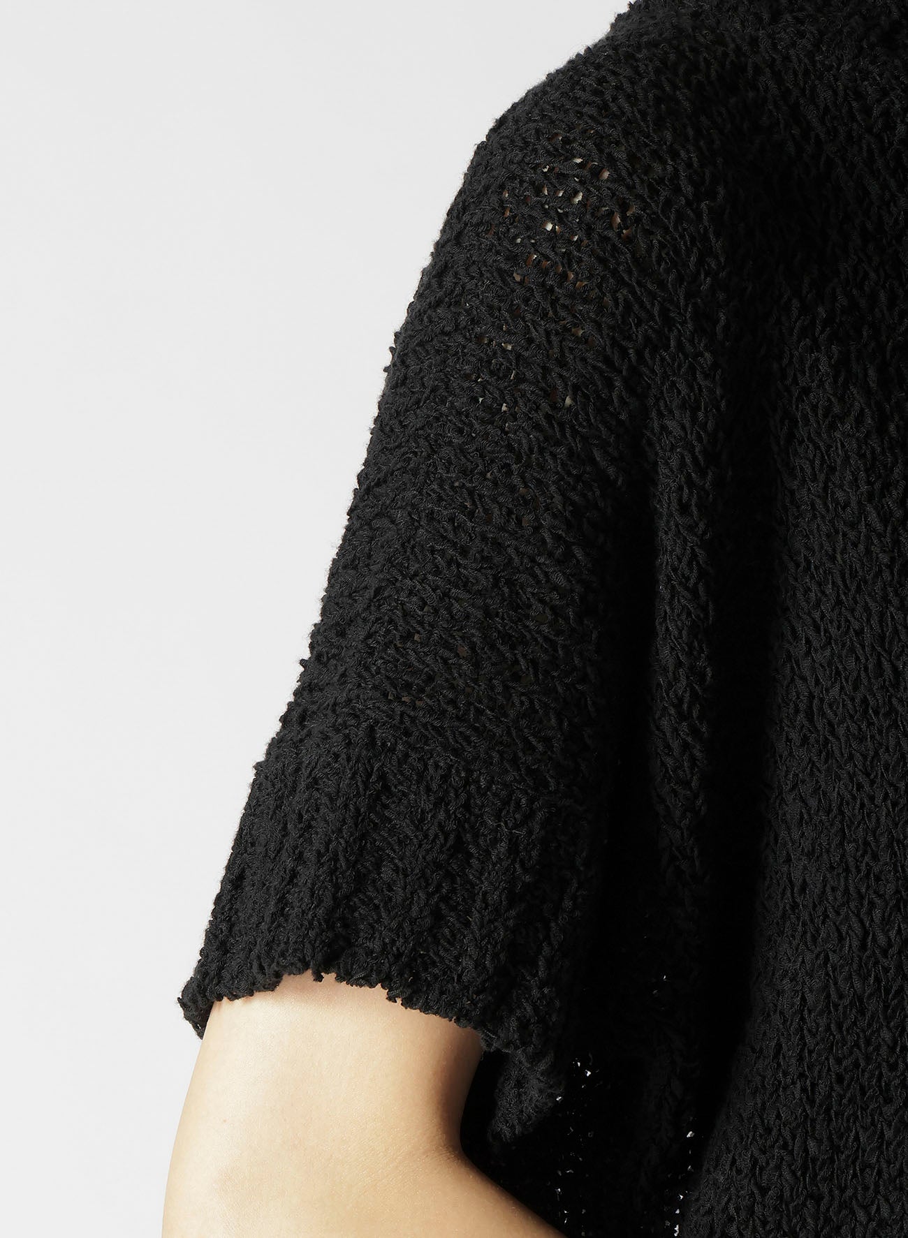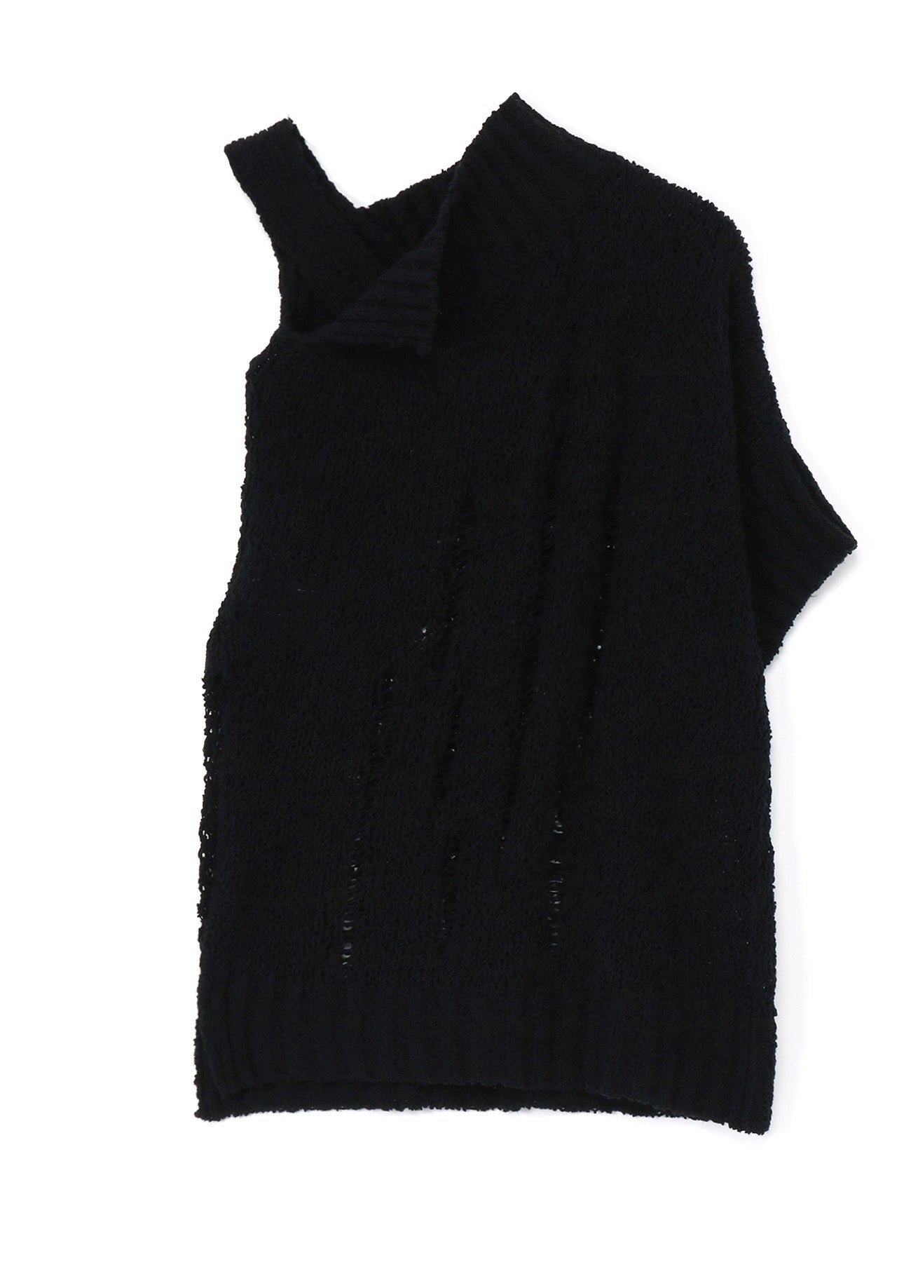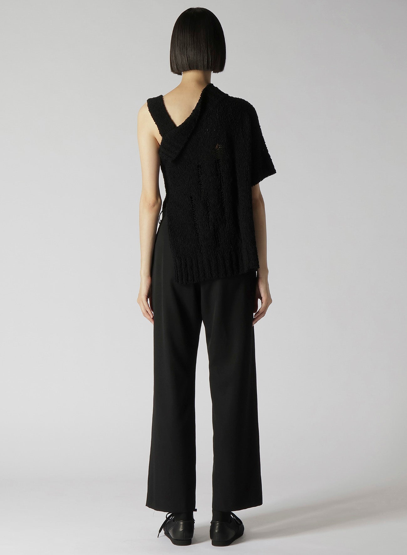 Este suéter de punto presenta un audaz diseño asimétrico en el hombro. Confeccionado en algodón ligero, ofrece una textura única y una sensación refrescante con su sutil transparencia. Las imágenes del modelo son artículos de muestra; puede haber ligeras diferencias en tamaño y textura. Por favor, consulte la INFORMACIÓN DE TAMAÑO para más detalles.