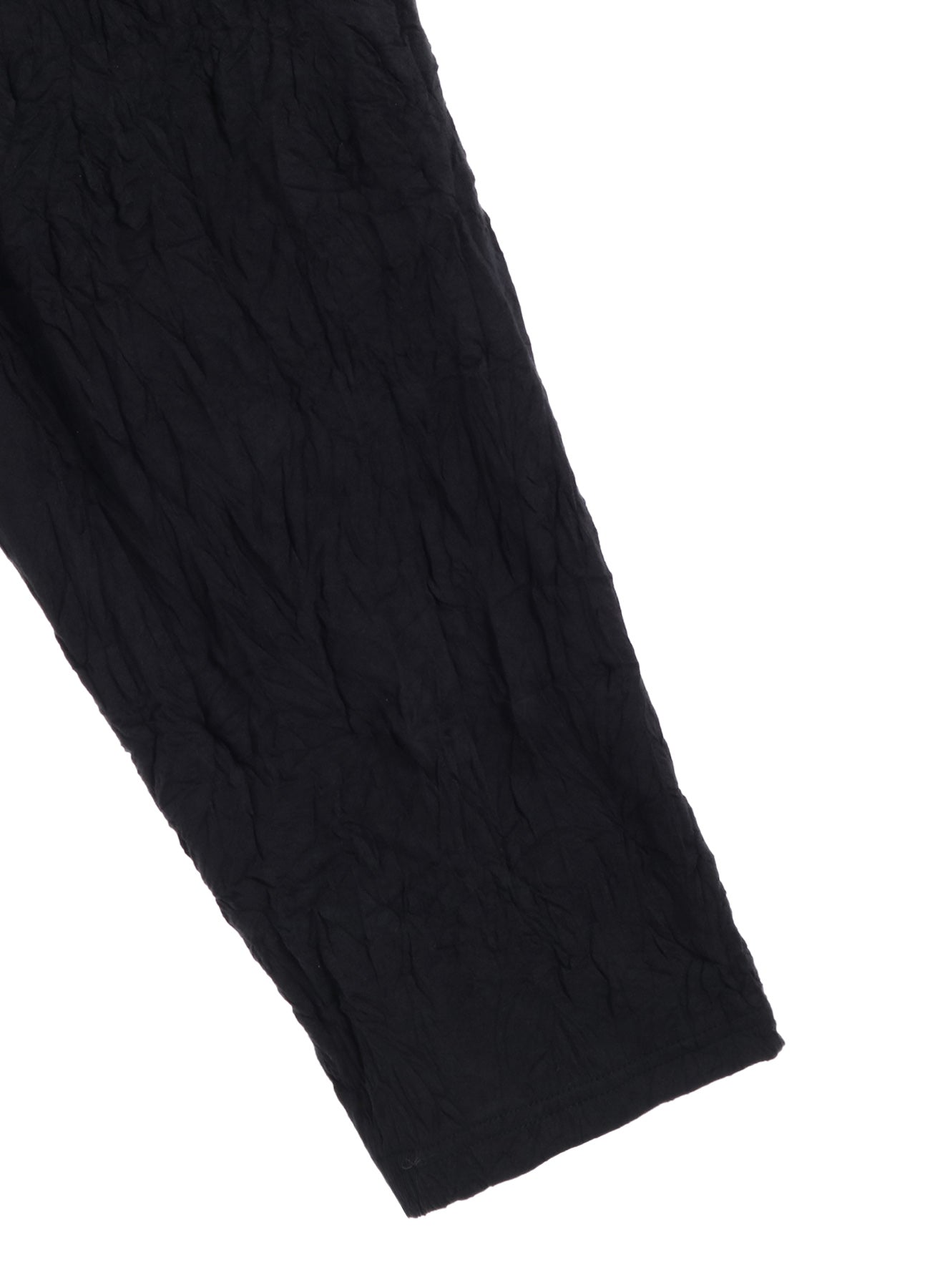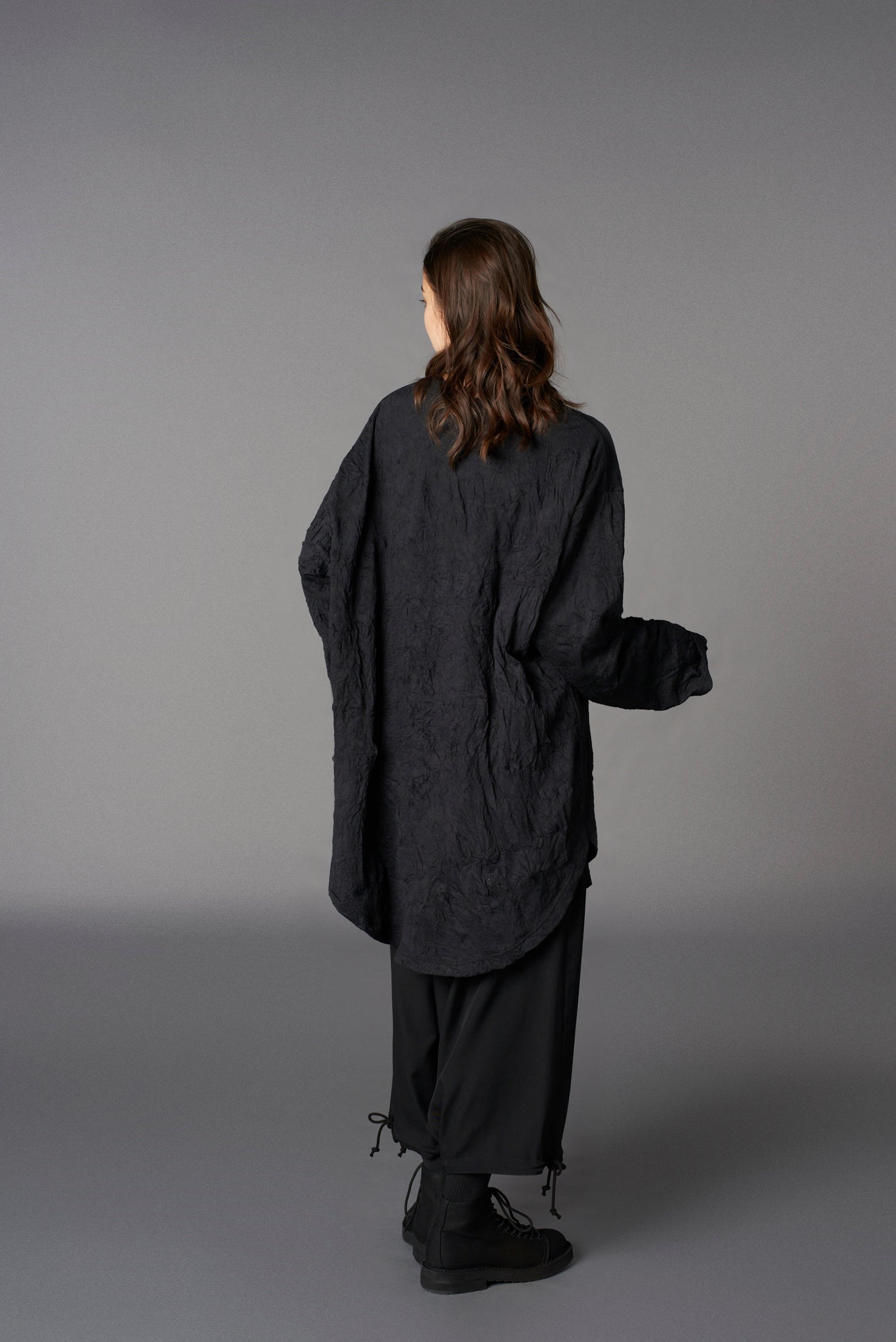 This simple long-sleeve top is designed with a rounded hem and an extended back, creating an attractive asymmetric silhouette. Made from a blend of cotton and polyester, the fabric is given a natural texture with handmade wrinkle processing, resulting in an expressive finish.