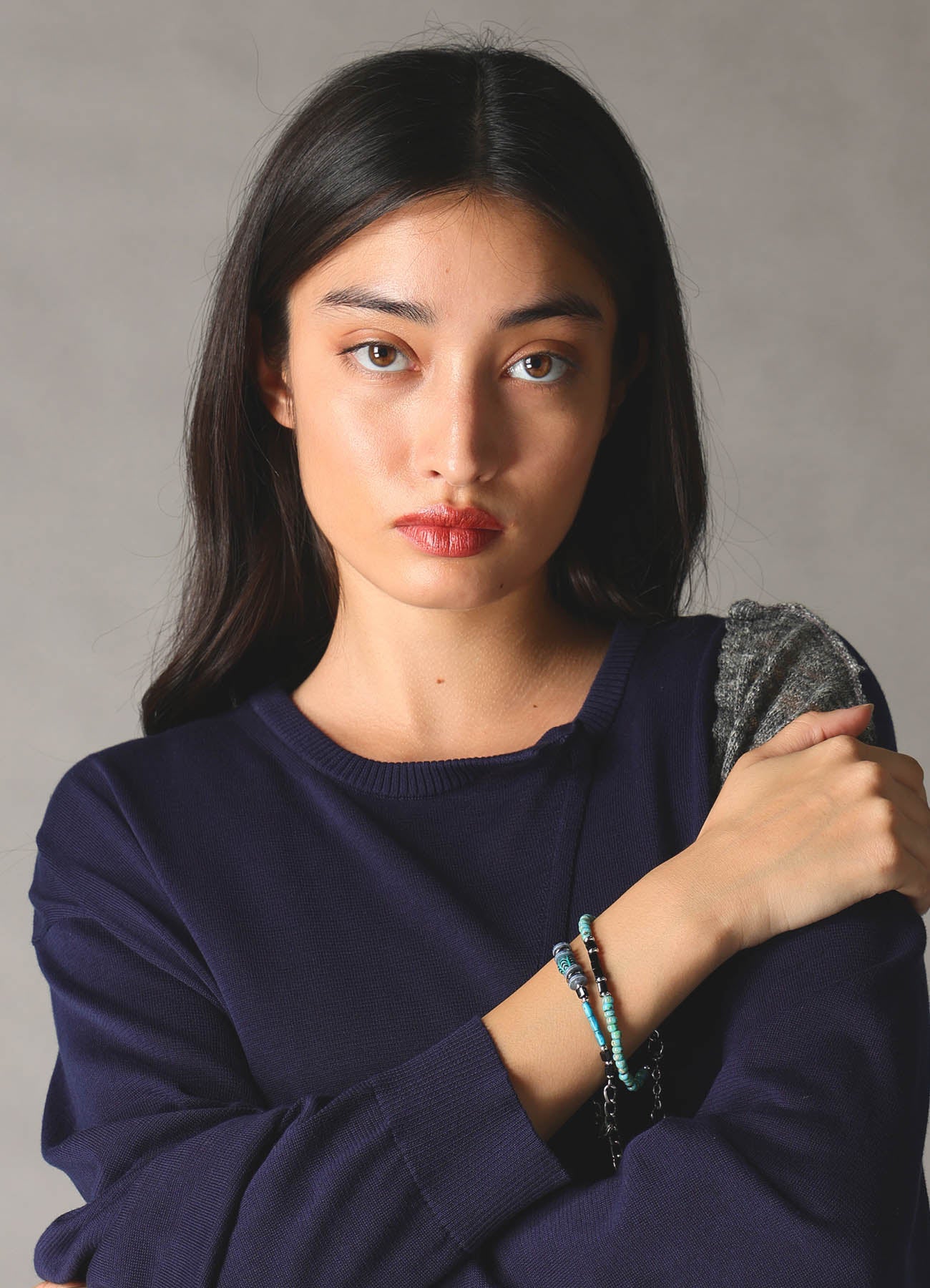 This Ground Y Spring/Summer 2026 Collection bracelet features a vibrant turquoise base with black accents. Crafted from glass beads and brass, the piece offers an elegant sheen and substantial weight. Its subtle presence complements any outfit from casual to high-fashion, making it an adaptable accessory.