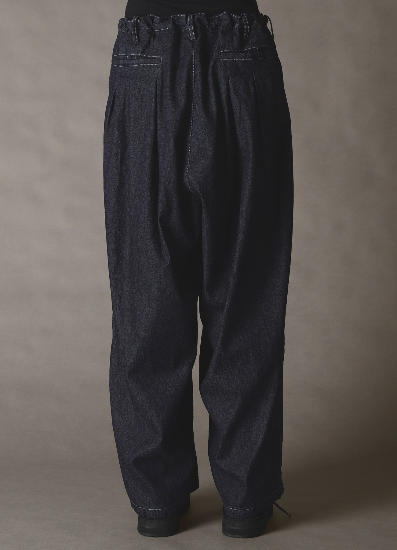 Denim pants featuring 12 pleats front and back, characterized by a voluminous wide baggy silhouette. The white stitching contrasts nicely with the indigo denim. Made from 8-ounce denim with slub yarn, it offers a vintage look. Indigo yarns dyed with rope method ensure beautiful aging changes with wear and wash.