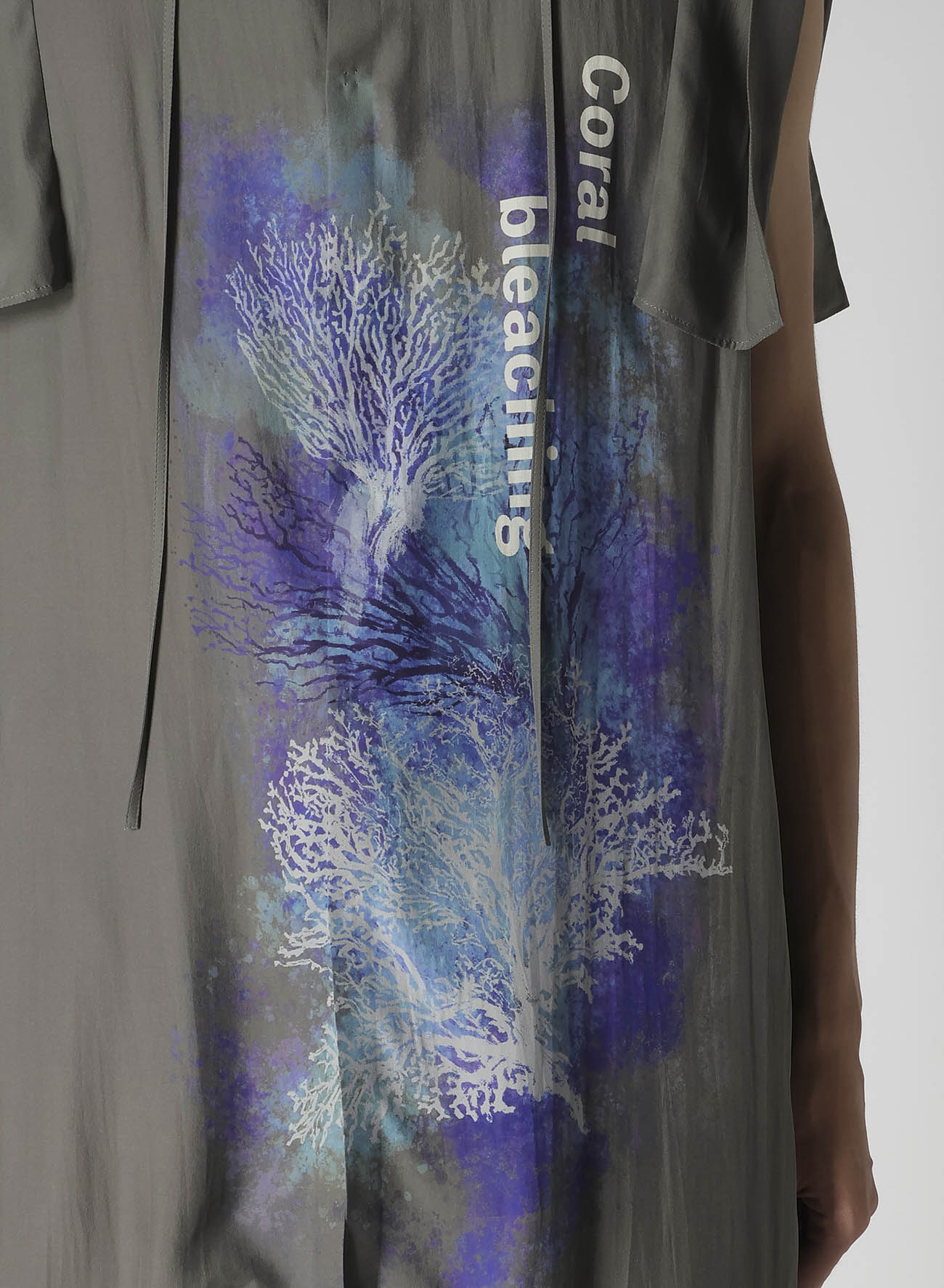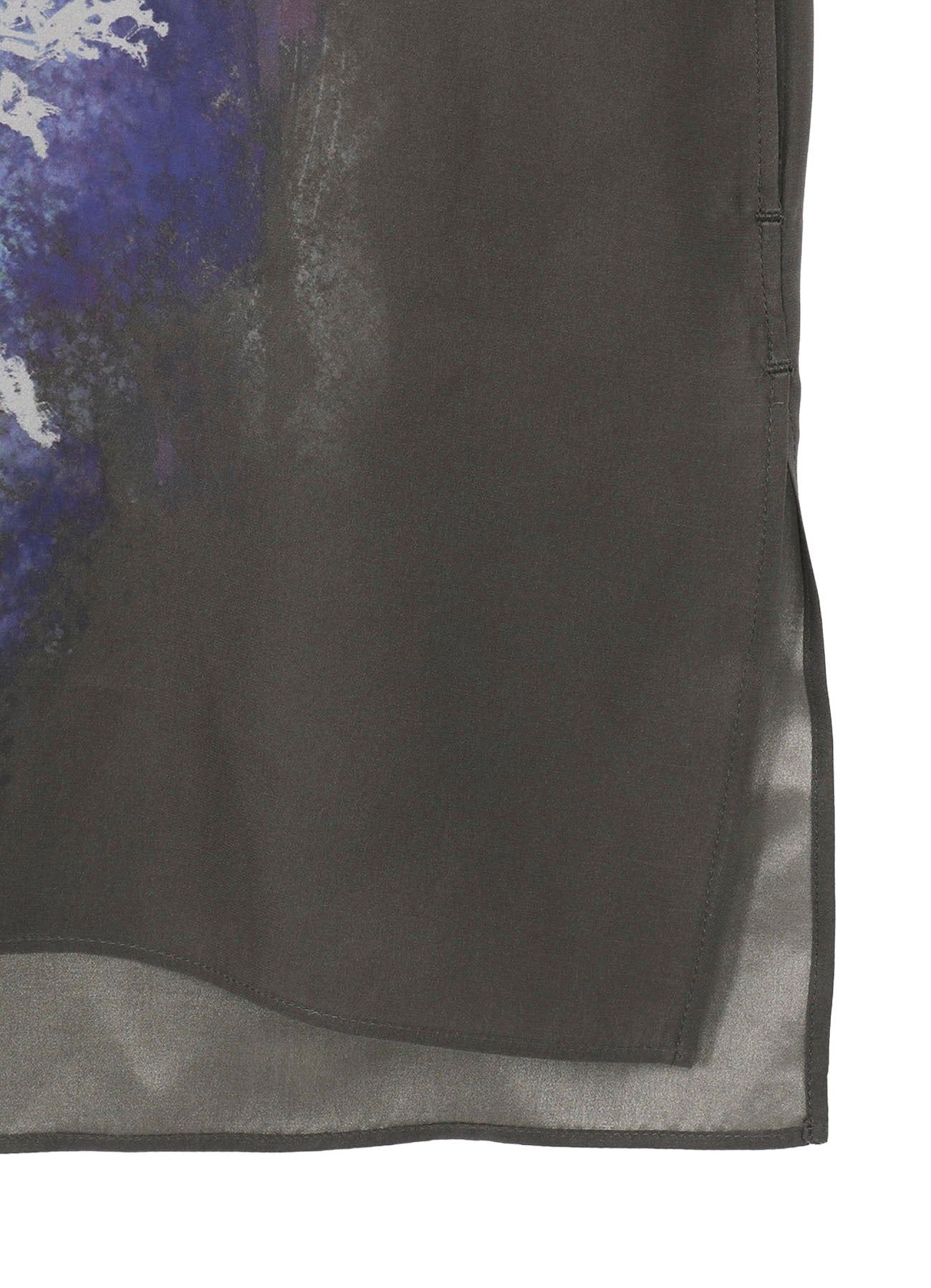 La colección Yohji Yamamoto POUR HOMME S/S 2026 presenta una blusa de corbata en Look 18. Confeccionada con satén de seda de 12 momme para una textura suave y ligera, muestra motivos marinos intrincados y un mensaje del diseñador utilizando impresión por inyección de tinta en una fábrica de Kyoto, ofreciendo profundidad en color mediante técnicas perfeccionadas.