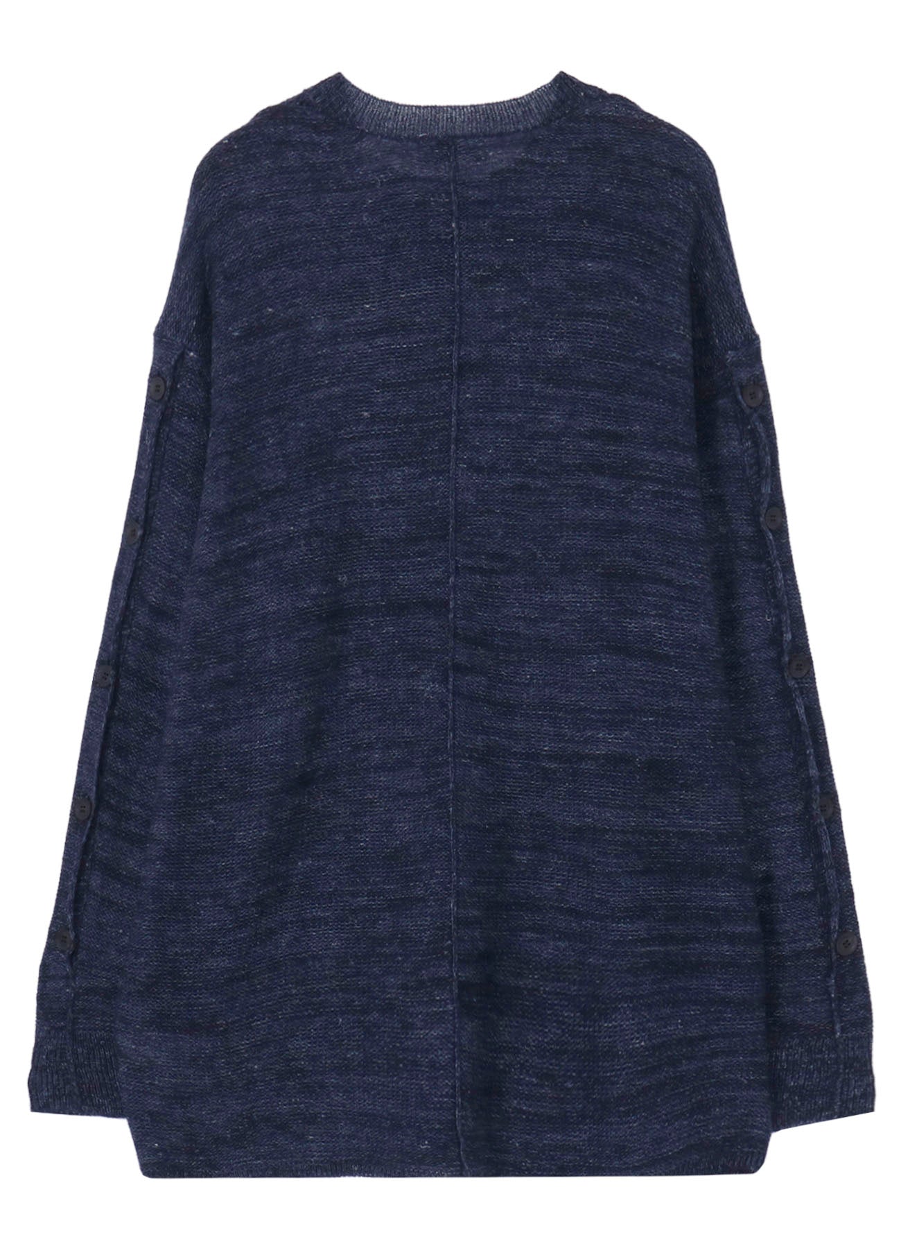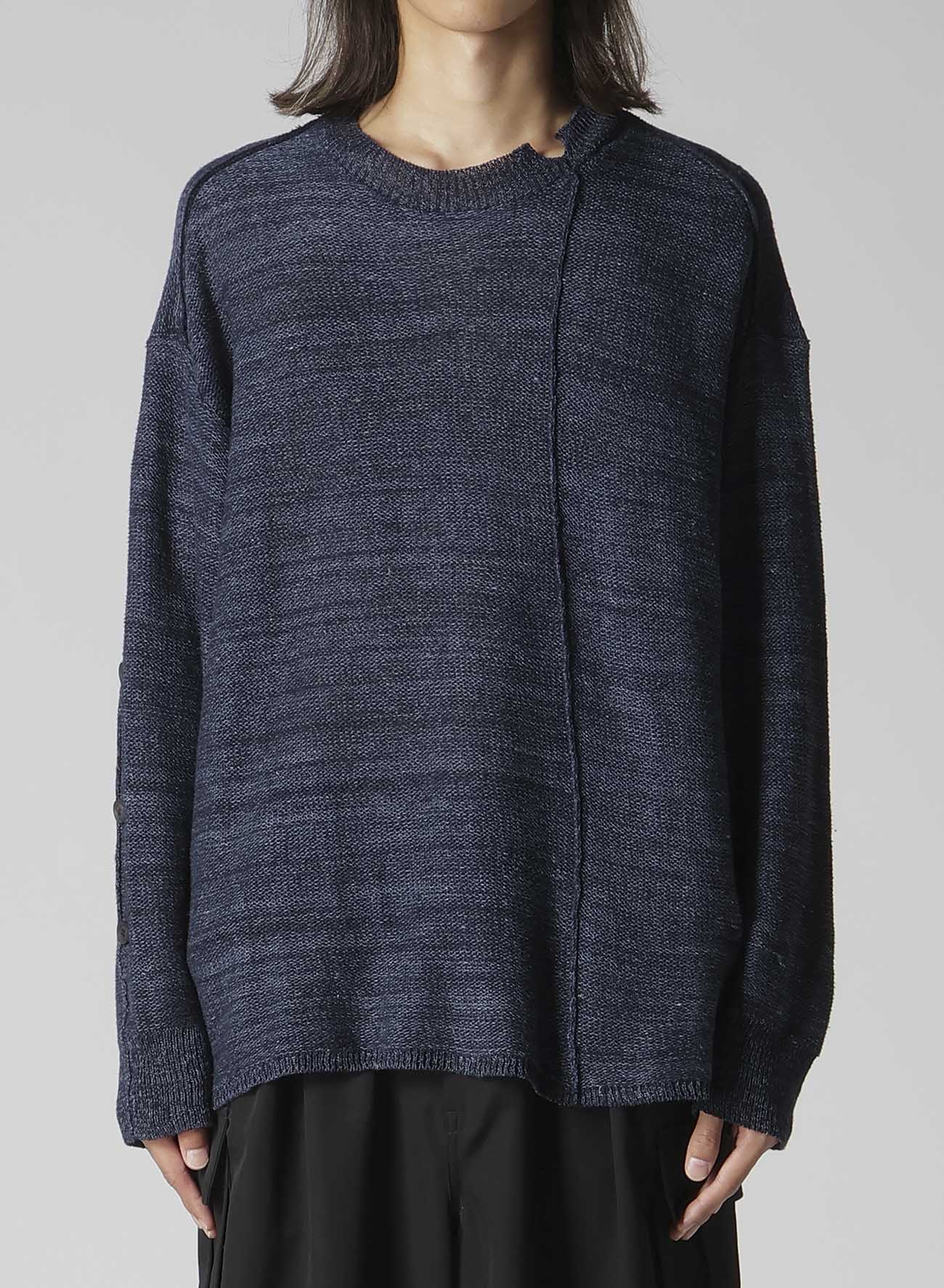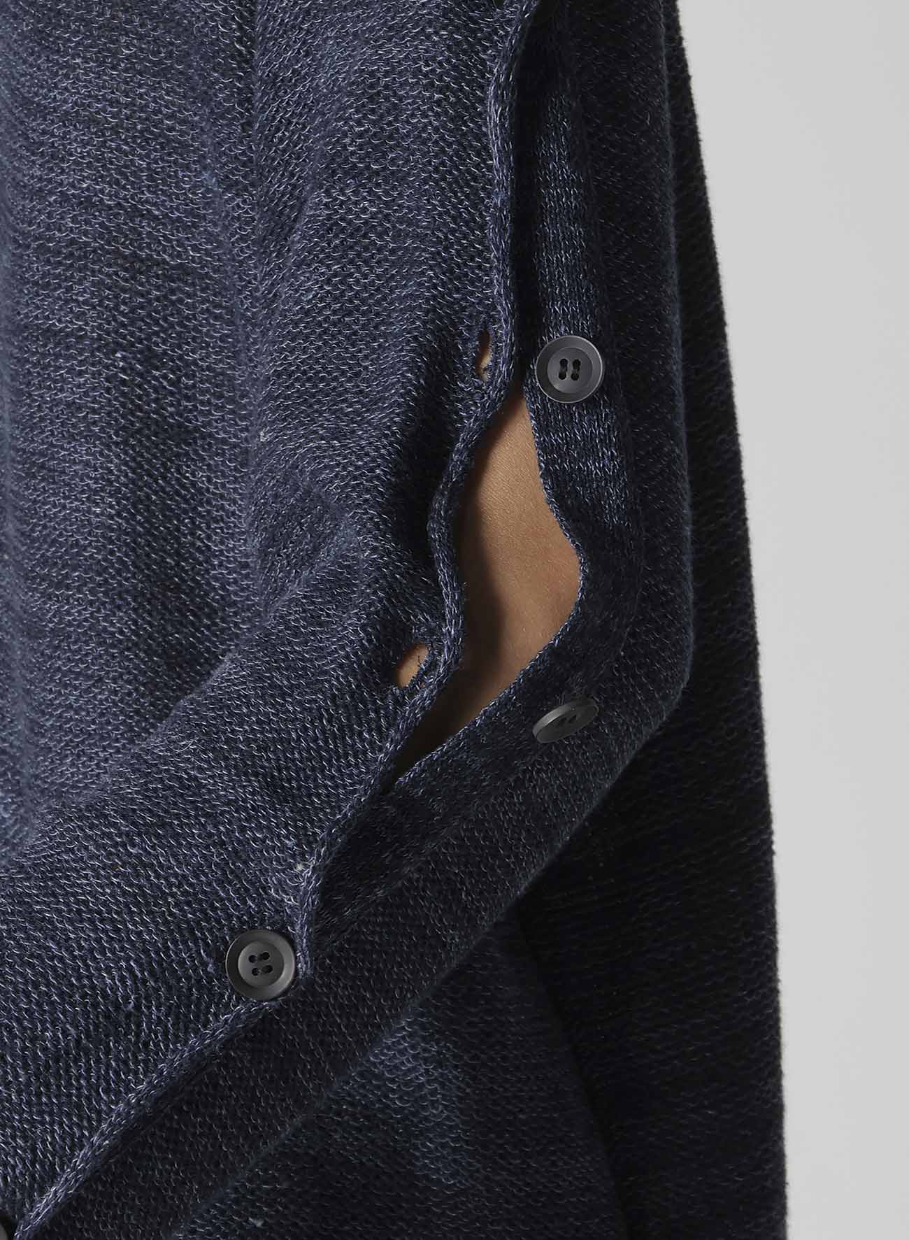 This knit features a unique grain and buttoned sleeve design, combining Washi/Cotton blend yarn and Linen yarn. The special fabric and distinctive sleeve design create an expressive look for the piece.