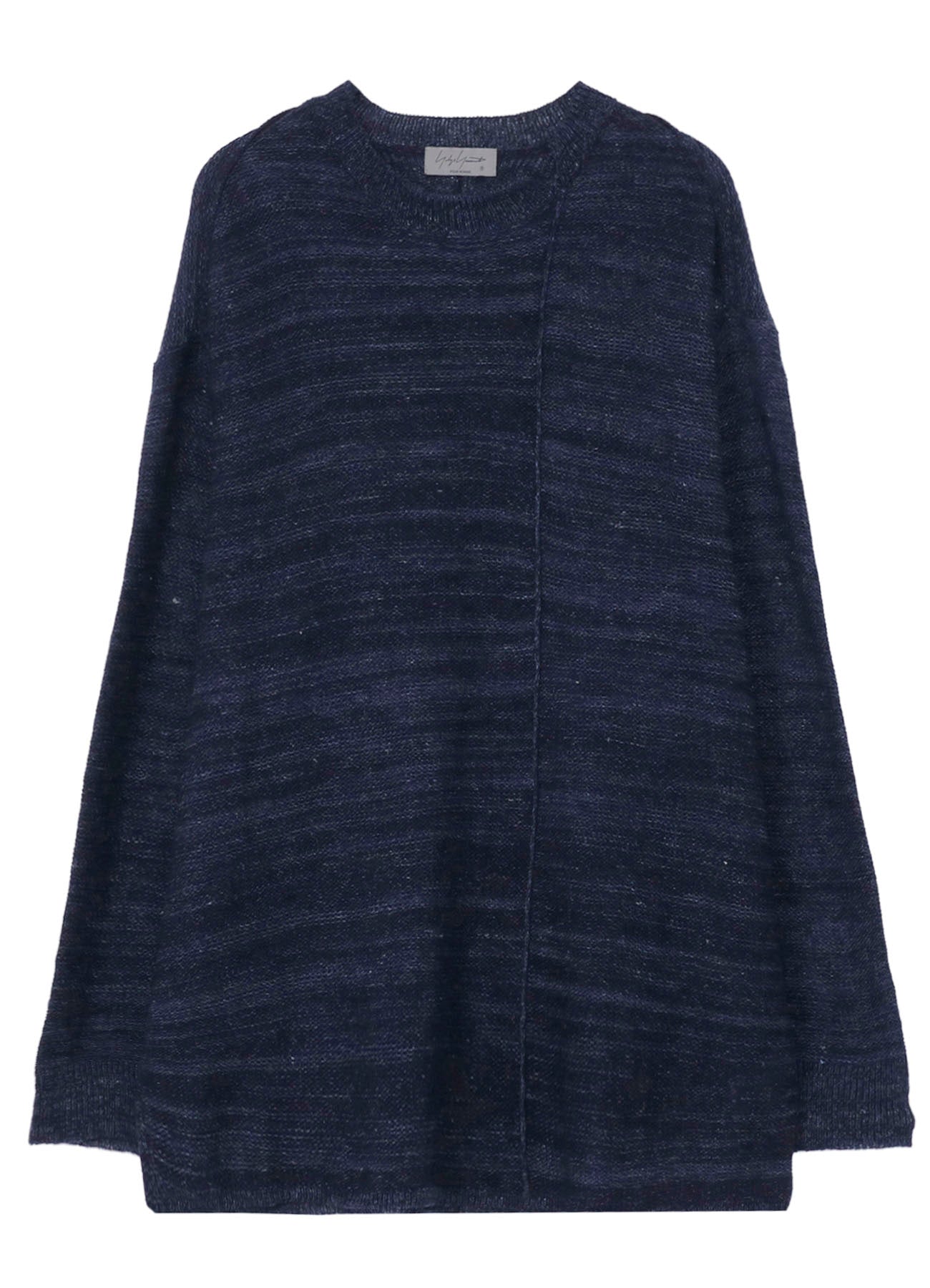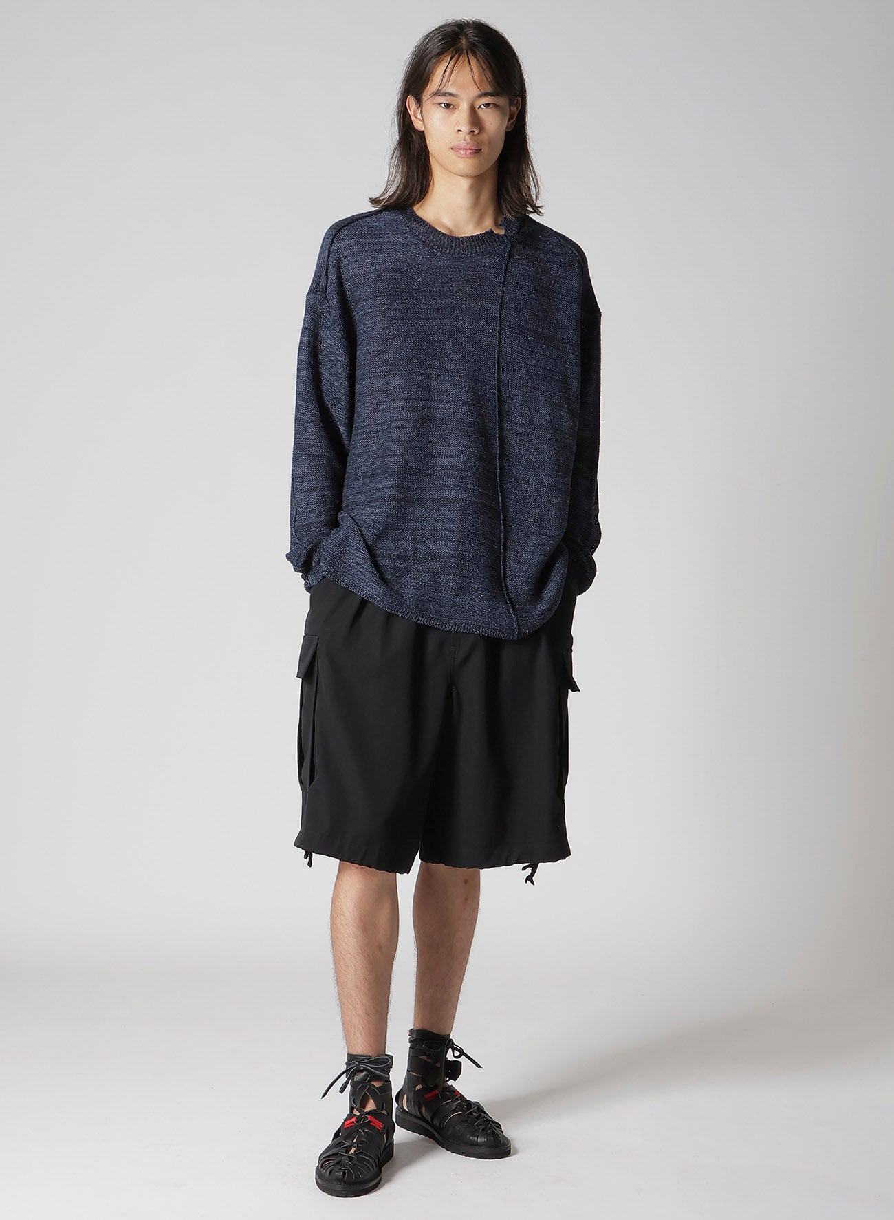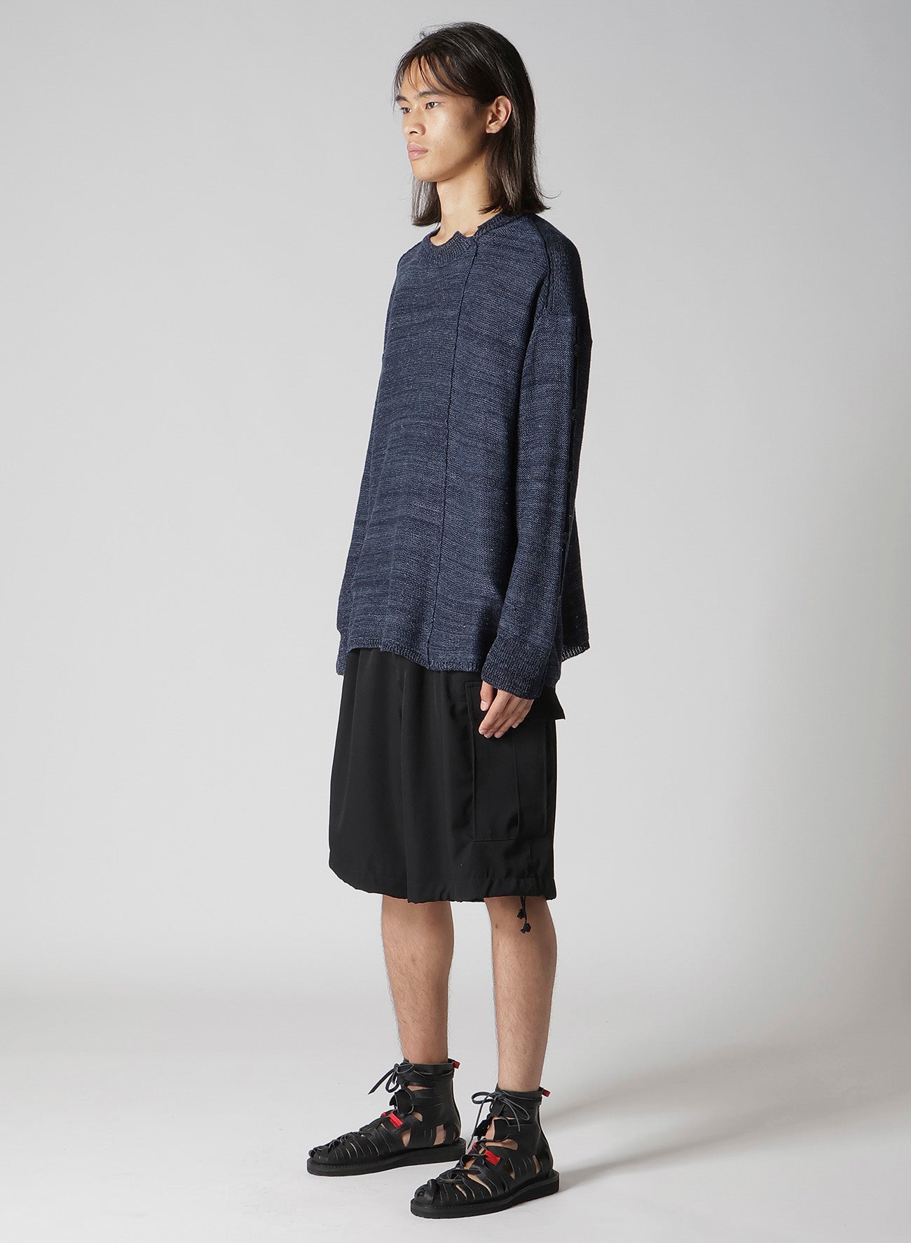 This knit features a unique grain and buttoned sleeve design, combining Washi/Cotton blend yarn and Linen yarn. The special fabric and distinctive sleeve design create an expressive look for the piece.