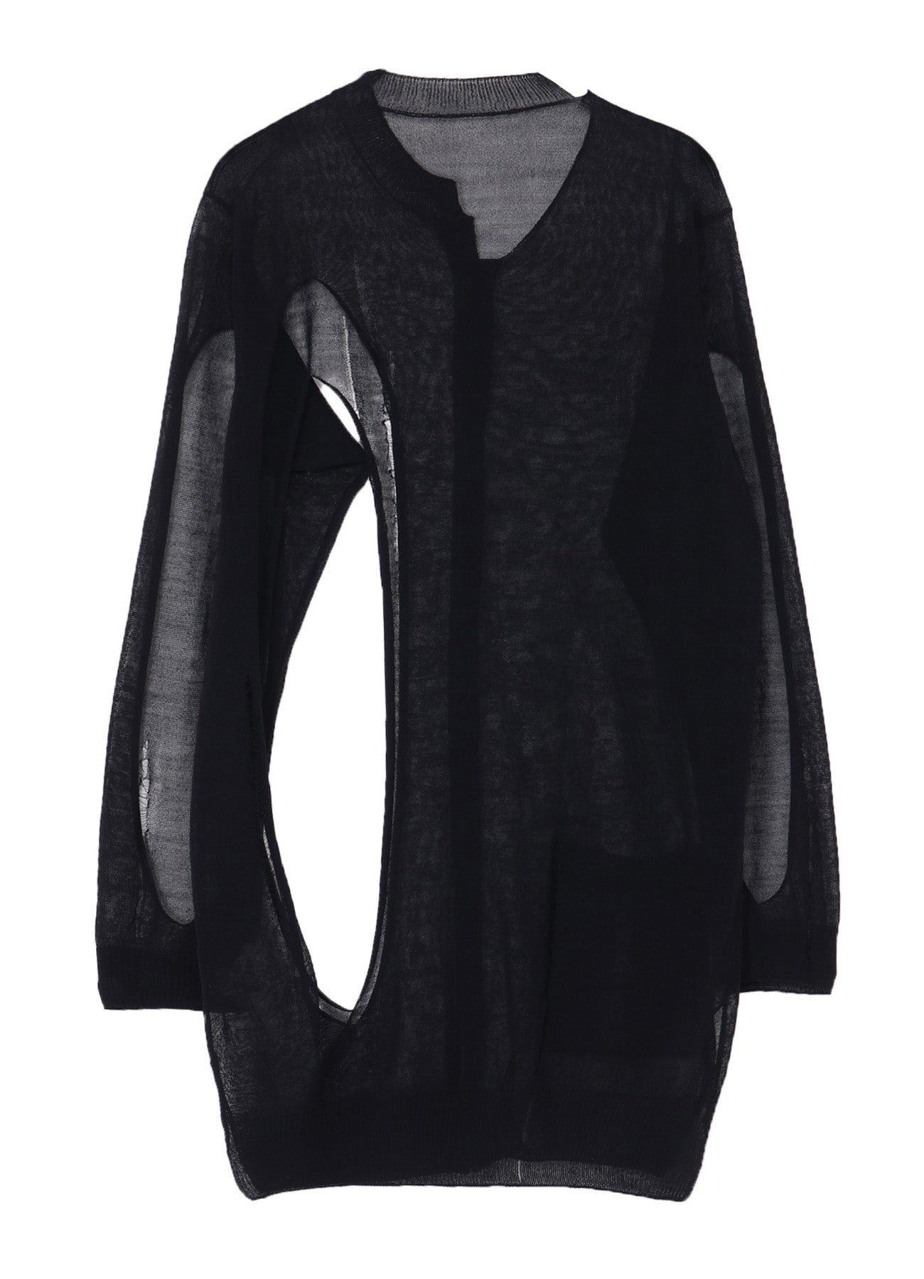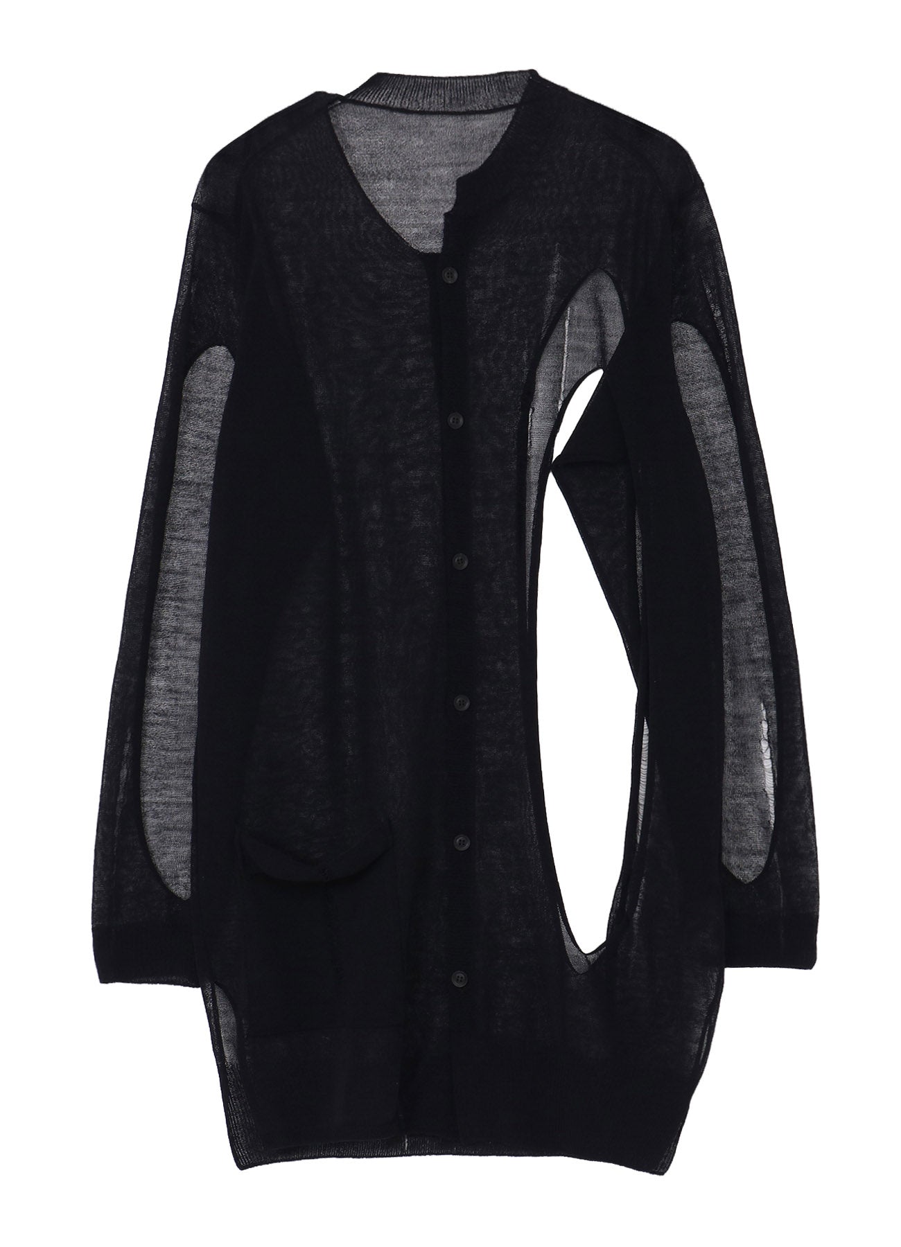 This innovative knitwear combines Shrink-Resistant Wool at its core with a Strong-Twist Nylon wrap. Its smooth texture is unexpected for a wool product. The large perforations in the design make it stylish and versatile, perfect for layering with inner wear for different looks.