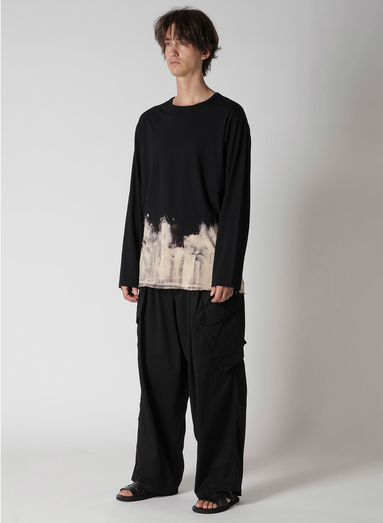 This long-sleeve top uses plain stitch fabric with a discharge dyeing technique applied by hand on each side, creating a blurred edge design. Due to the handcrafting, each piece varies slightly. This product combines craftsmanship with a unique visual effect, making it a distinct piece.