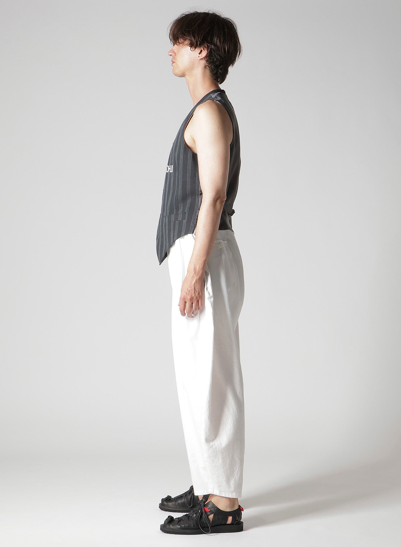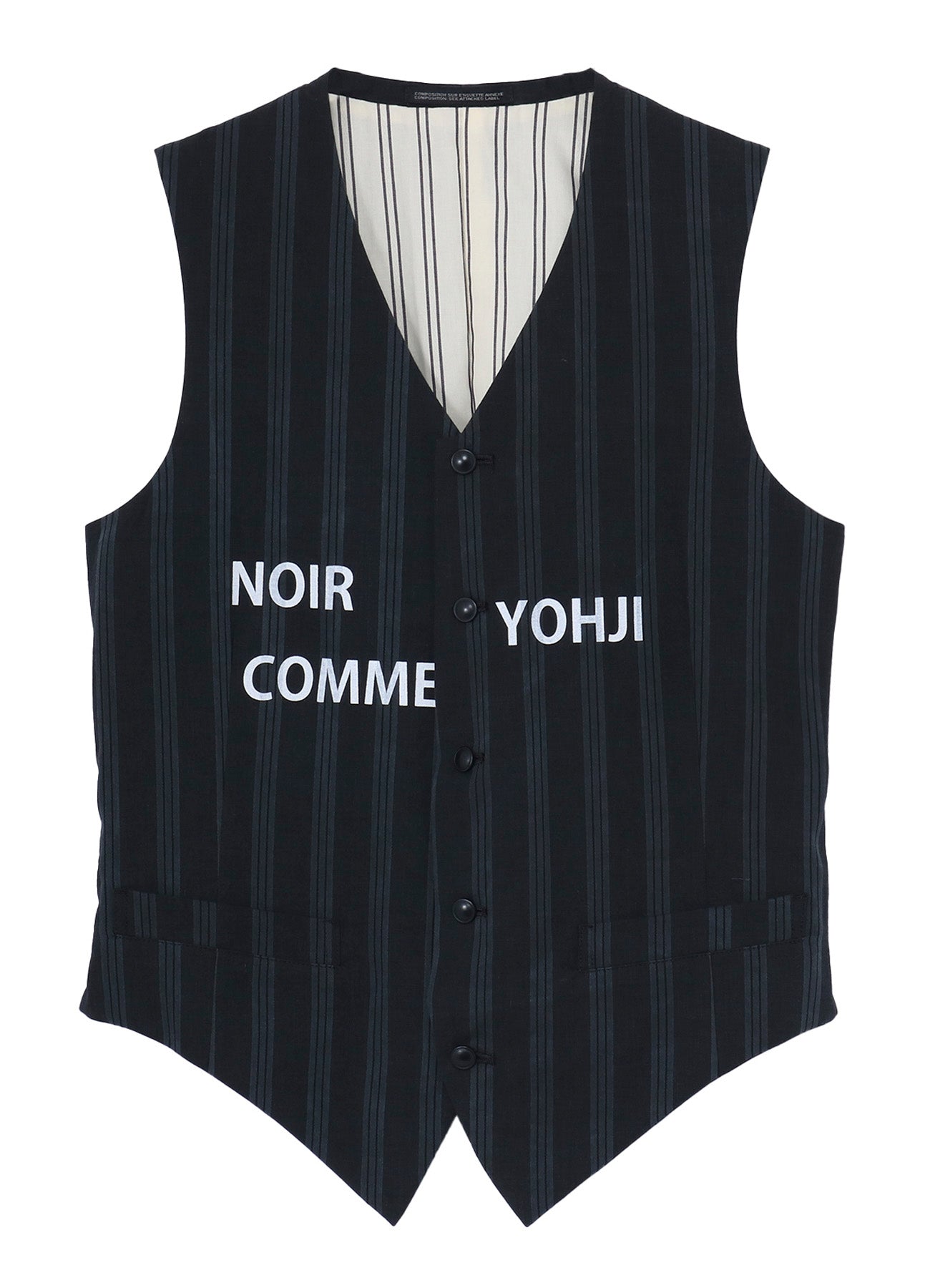 This Yohji Yamamoto POUR HOMME S/S 2026 collection includes a striking striped vest with unique fabric construction. Using Yarn-Dyed threads, plain and satin weaves are combined. A drumming method during garment dyeing harmonizes colors. Repeated washes create a detailed, unique fade.