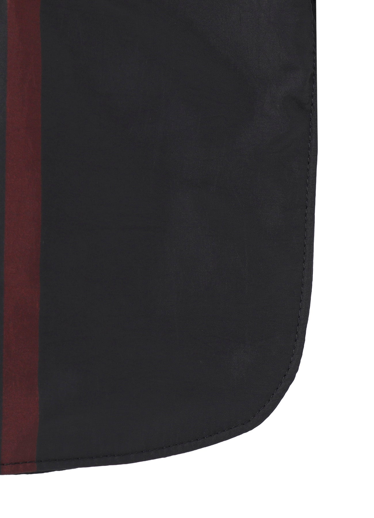 La blusa LOOK 18 de A/W 2025-26 de Yohji Yamamoto POUR HOMME presenta un tab de collar y está elaborada con tafta usando hilo de cation en urdimbre y trama. El procesamiento vintage otorga al material un aspecto cálido y natural. El diseño original de temática tabacalera se imprime digitalmente en una fábrica de Kyoto.