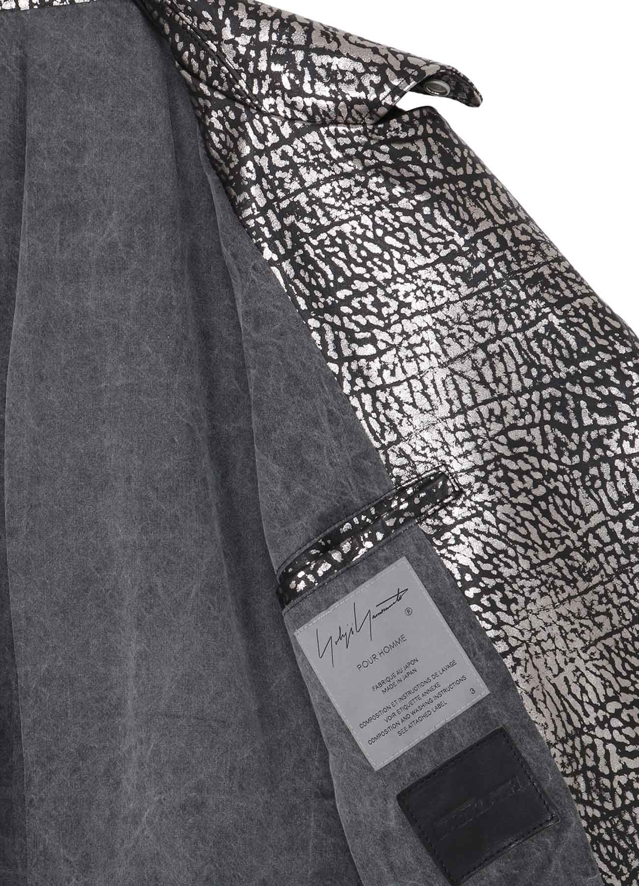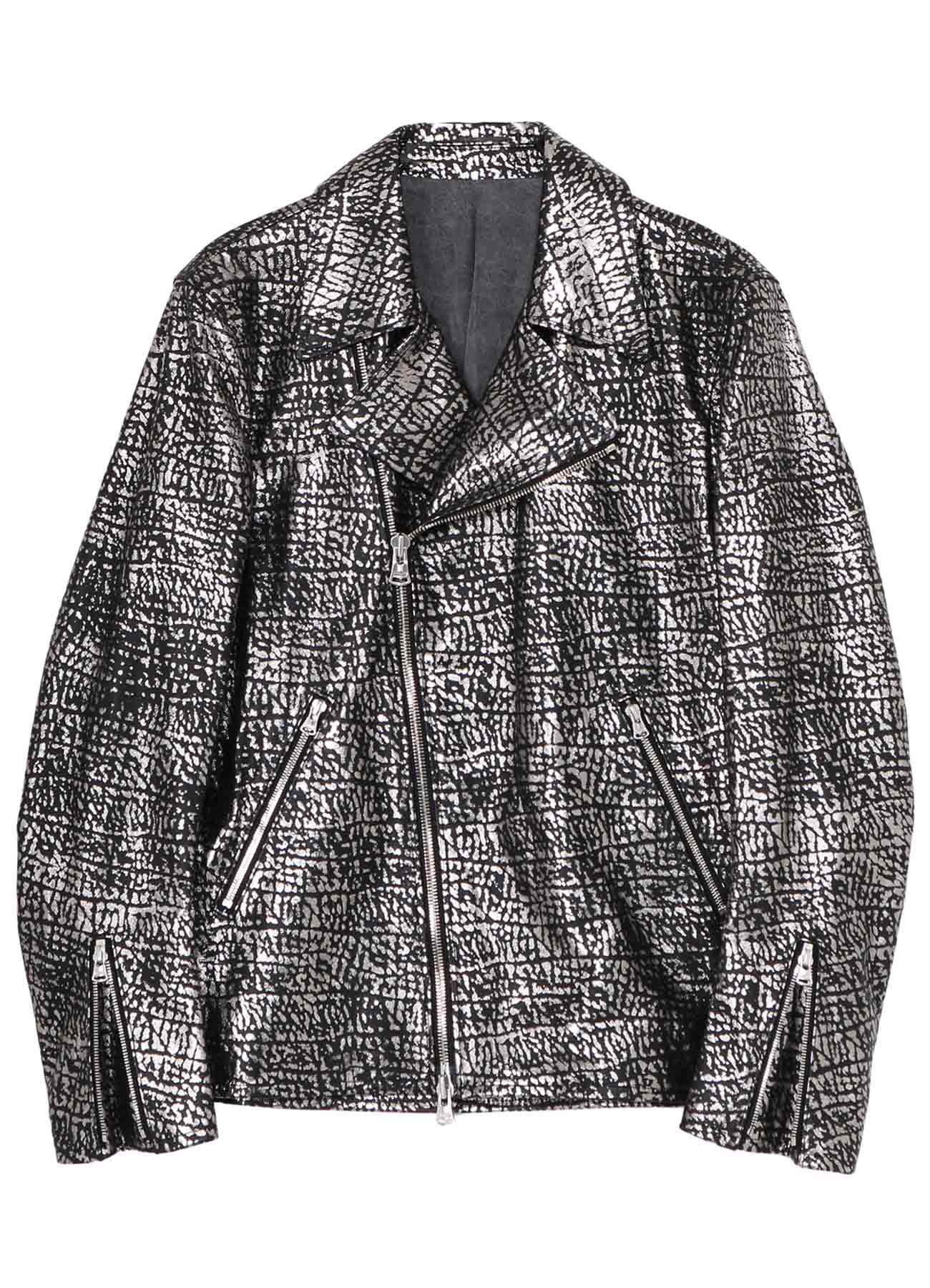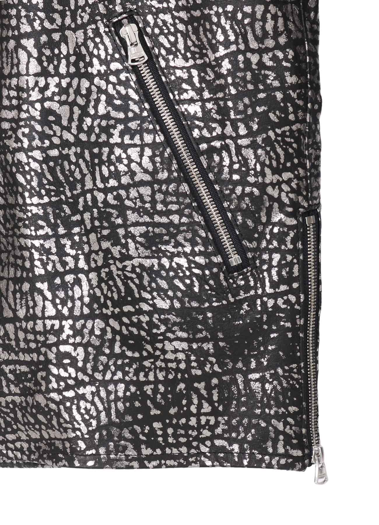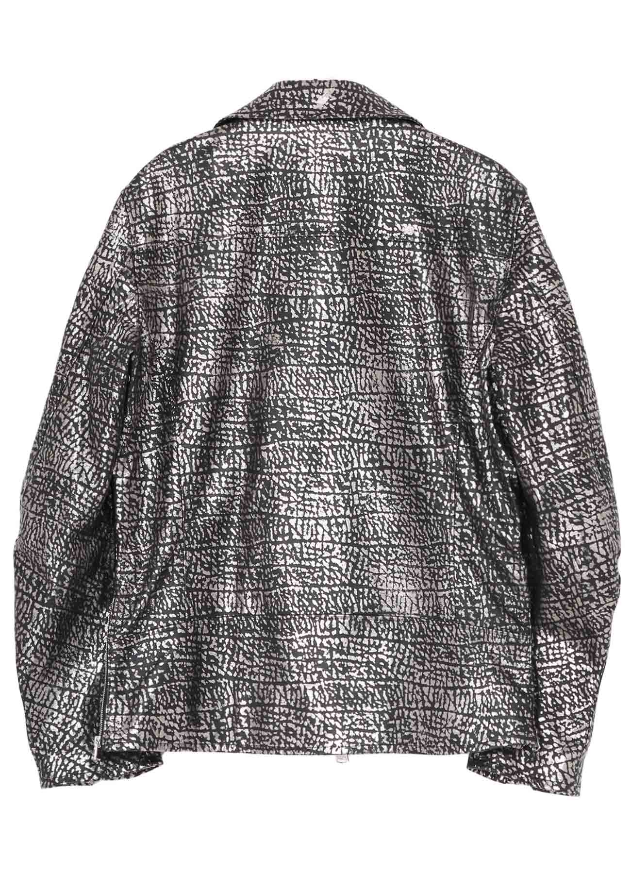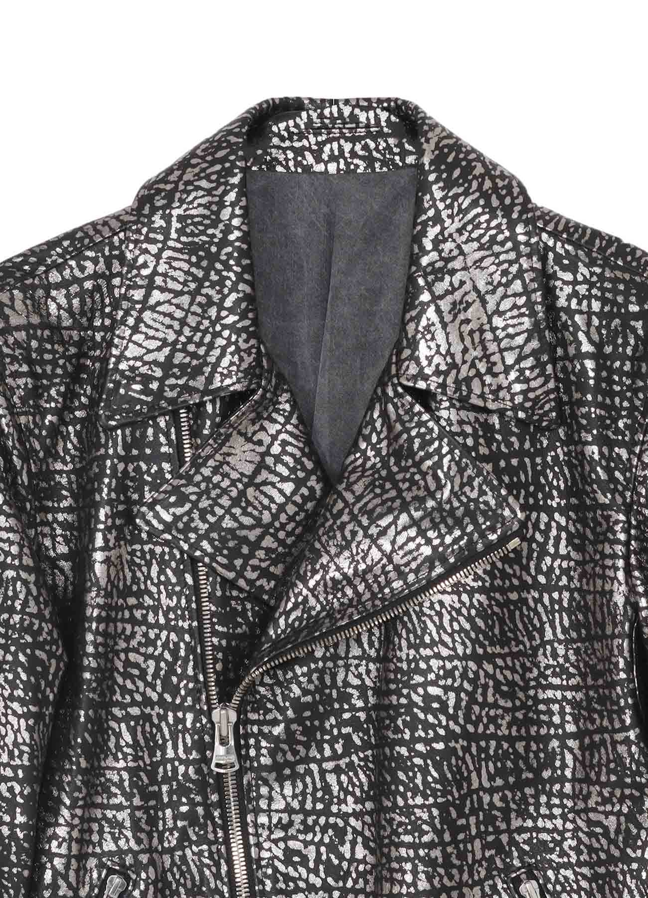 Una chaqueta de moto doble hecha de cuero de oveja suave con acabado de lámina de plata. Las áreas grabadas presentan negro, resaltando la textura de forma salvaje e irregular. Esta pieza cuenta con una silueta ajustada, un diseño distintivo de BACKLASH.