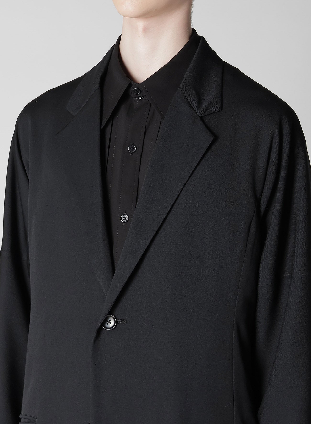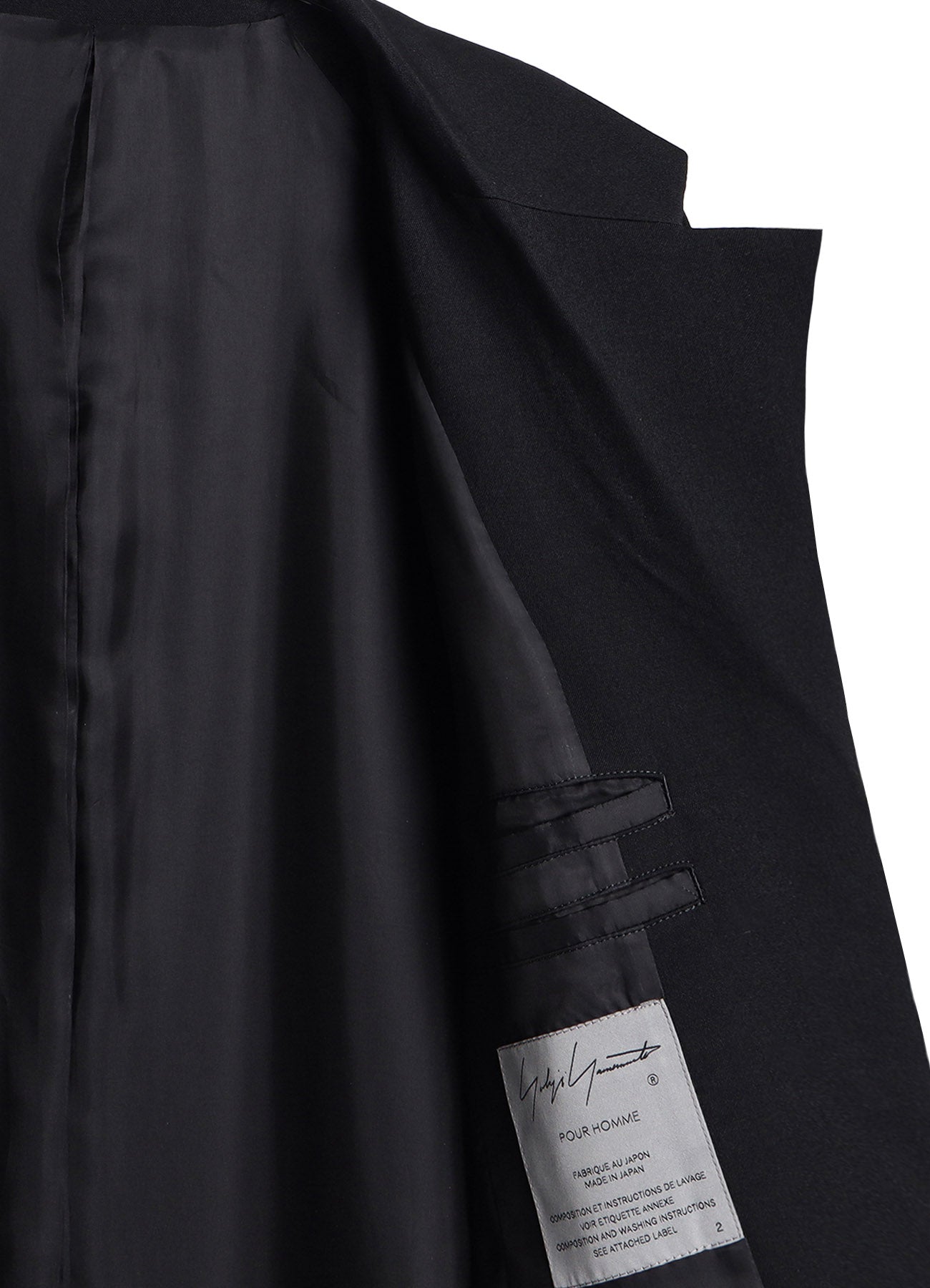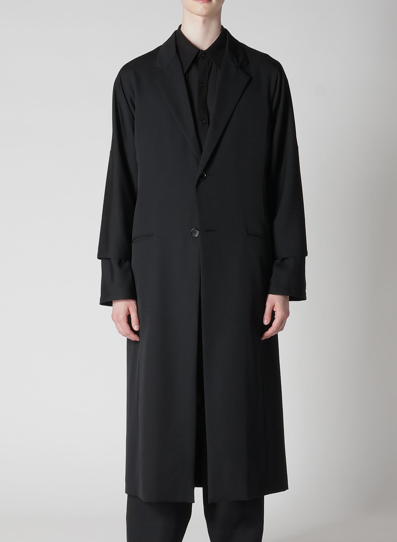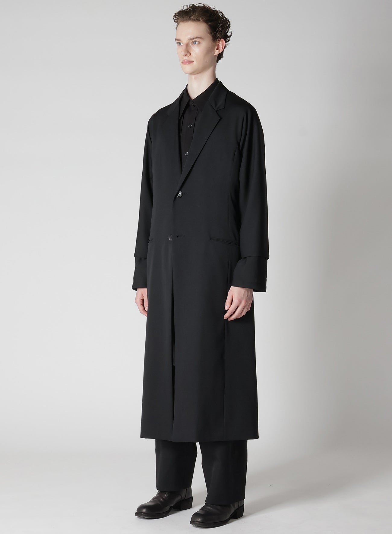 Esta chaqueta larga está hecha de la icónica lana gabardina de Yohji Yamamoto, con mangas superpuestas. Permite personalizar su estilo enrollando los puños, y su caída está resaltada por el tejido brillante y lujoso.