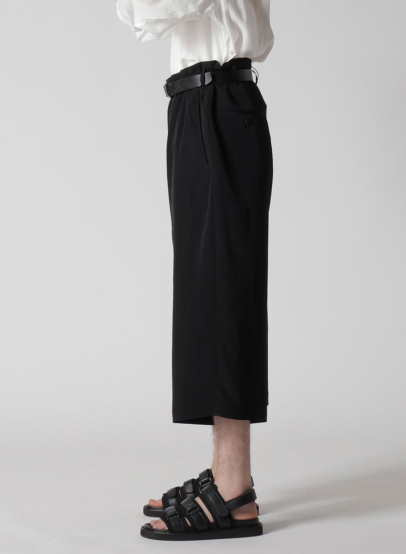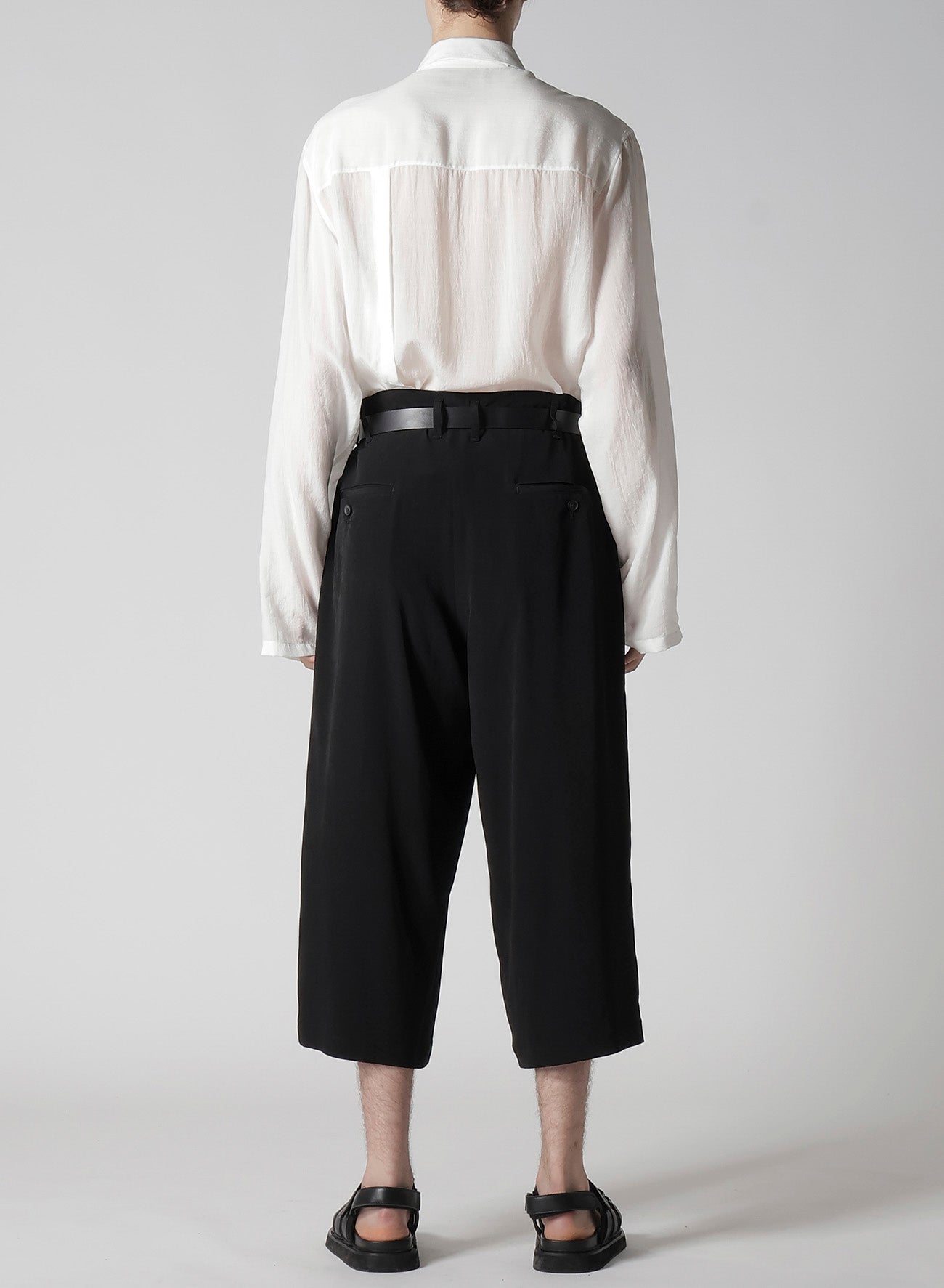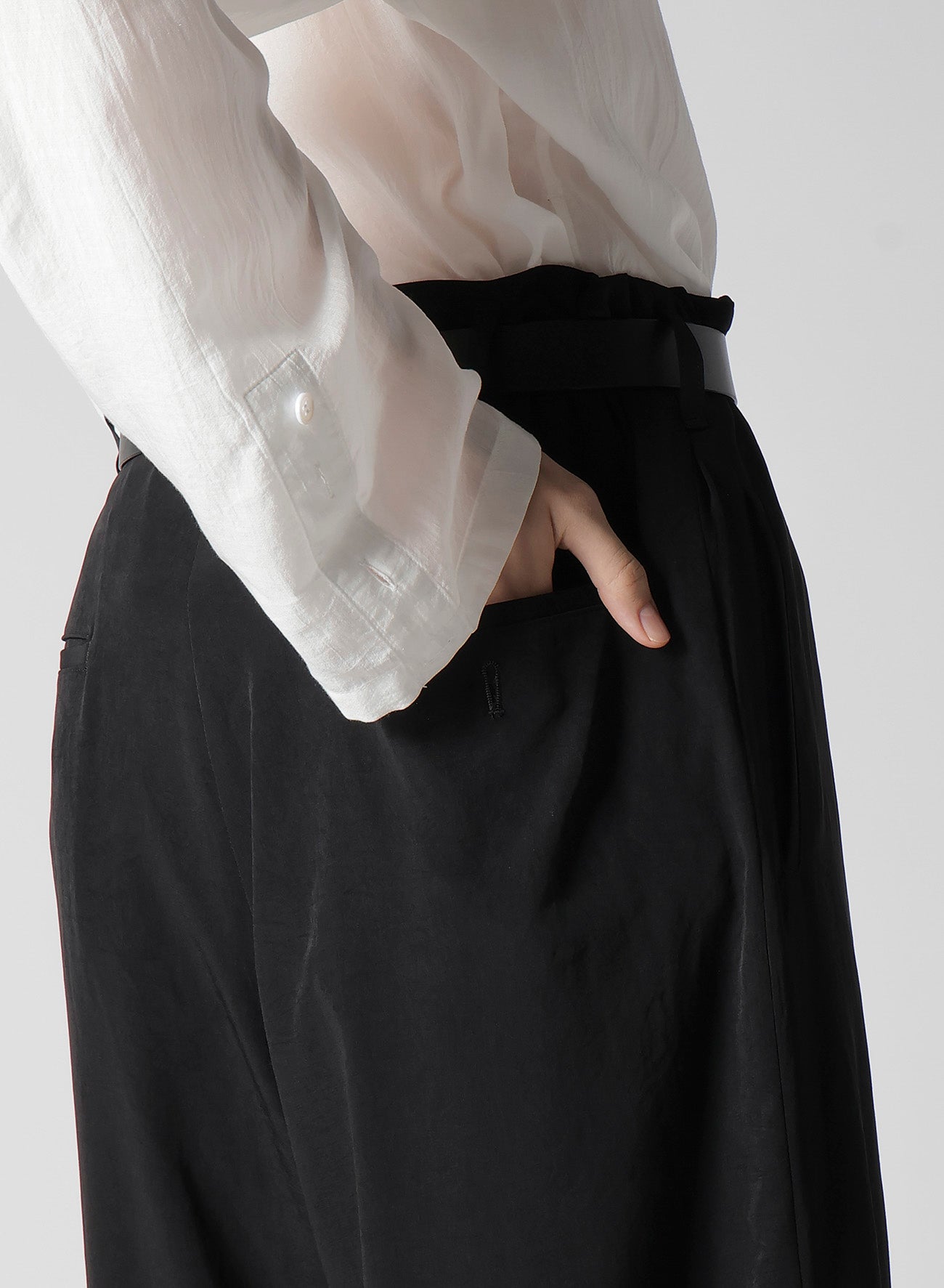 Este pantalón presenta un diseño de bolsillo con doble ribete, elaborado con una mezcla de triacetato y poliéster. Está hecho con el material característico de Yohji Yamamoto, conocido por su sutil brillo y lujo. La tela de tejido liso está realizada con hilo de torsión fuerte, ofreciendo un rico carácter drapeado.