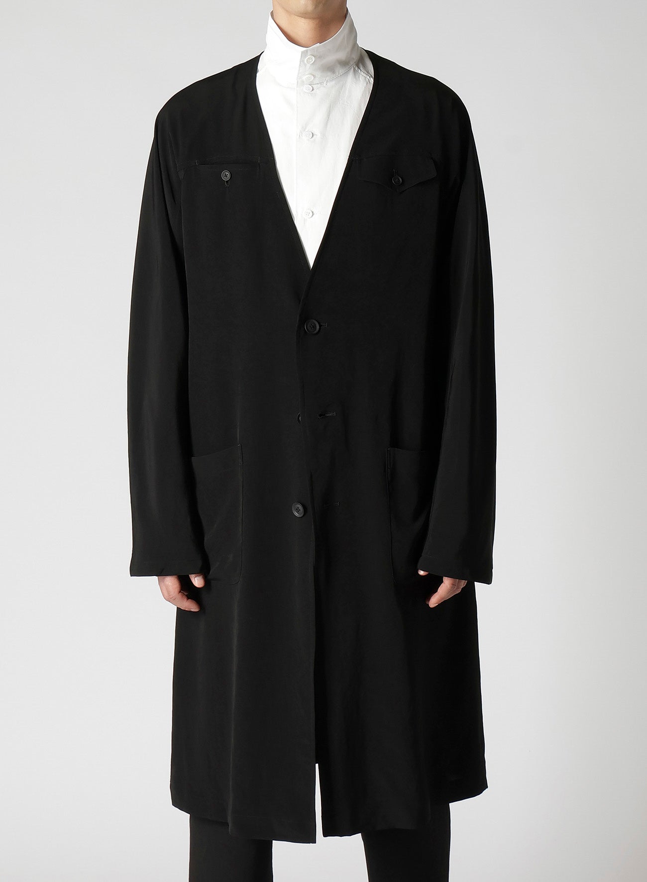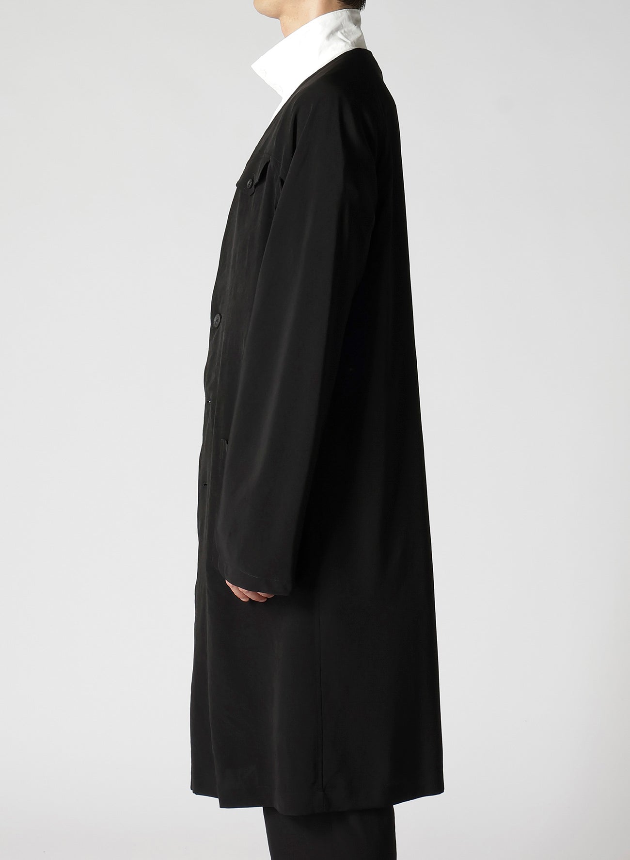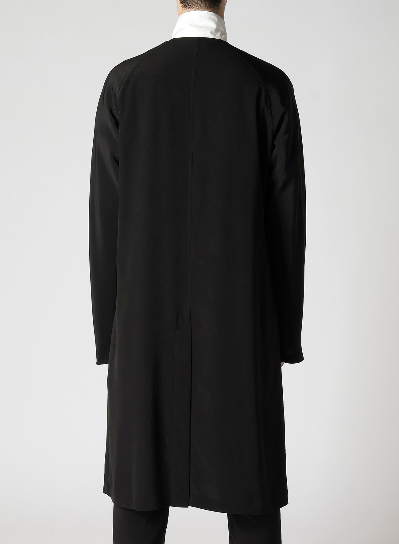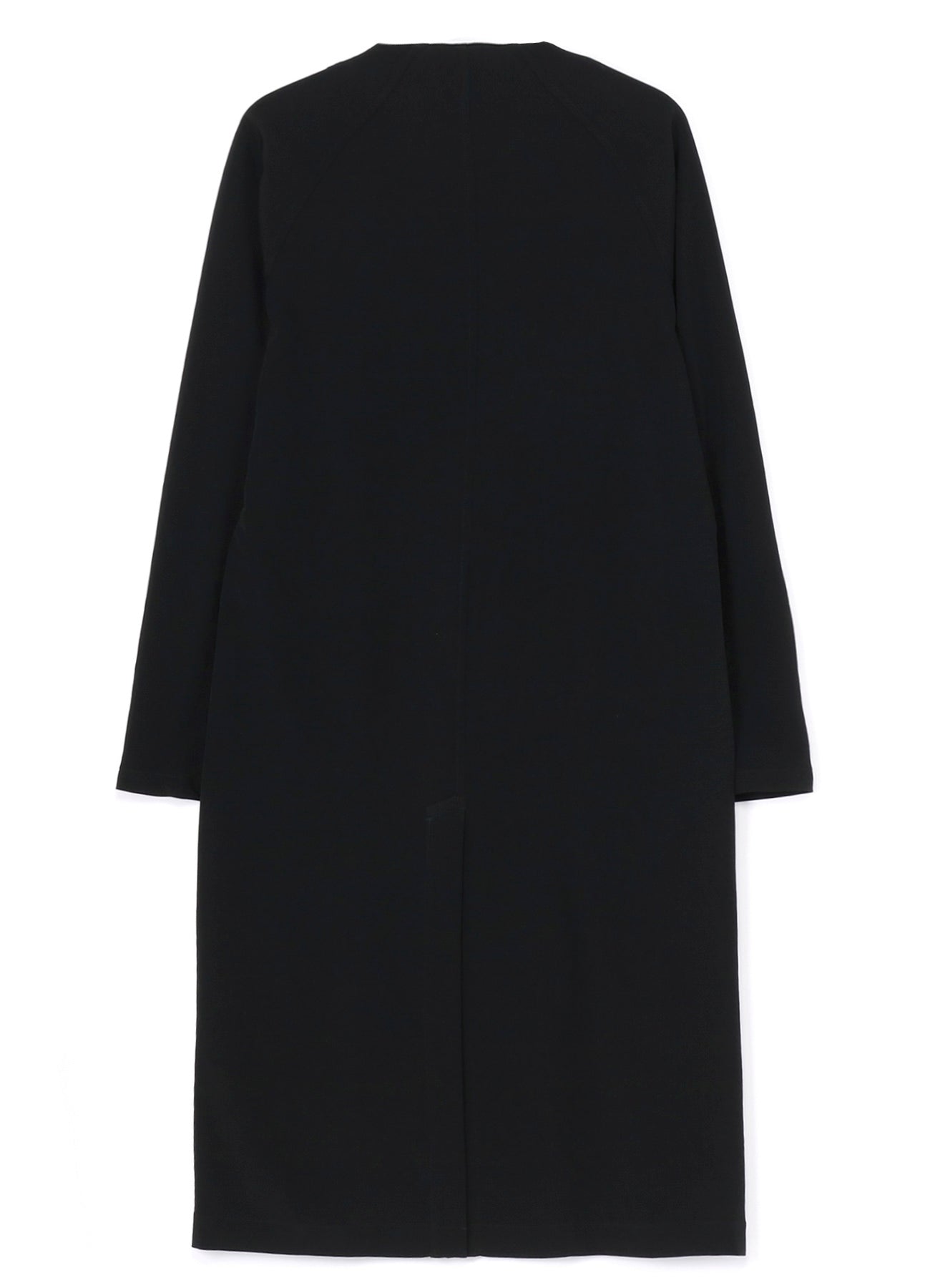 Un abrigo de vestido sin cuello hecho de material de esmoquin, caracterizado por un brillo suave y una sensación de alta gama. La tela, tejida de manera ajustada con hilo de torsión fuerte en la dirección horizontal, asegura una caída impresionante. Las costuras de overlock de una sola capa complementan la tela, resultando en una caída ricamente texturizada.