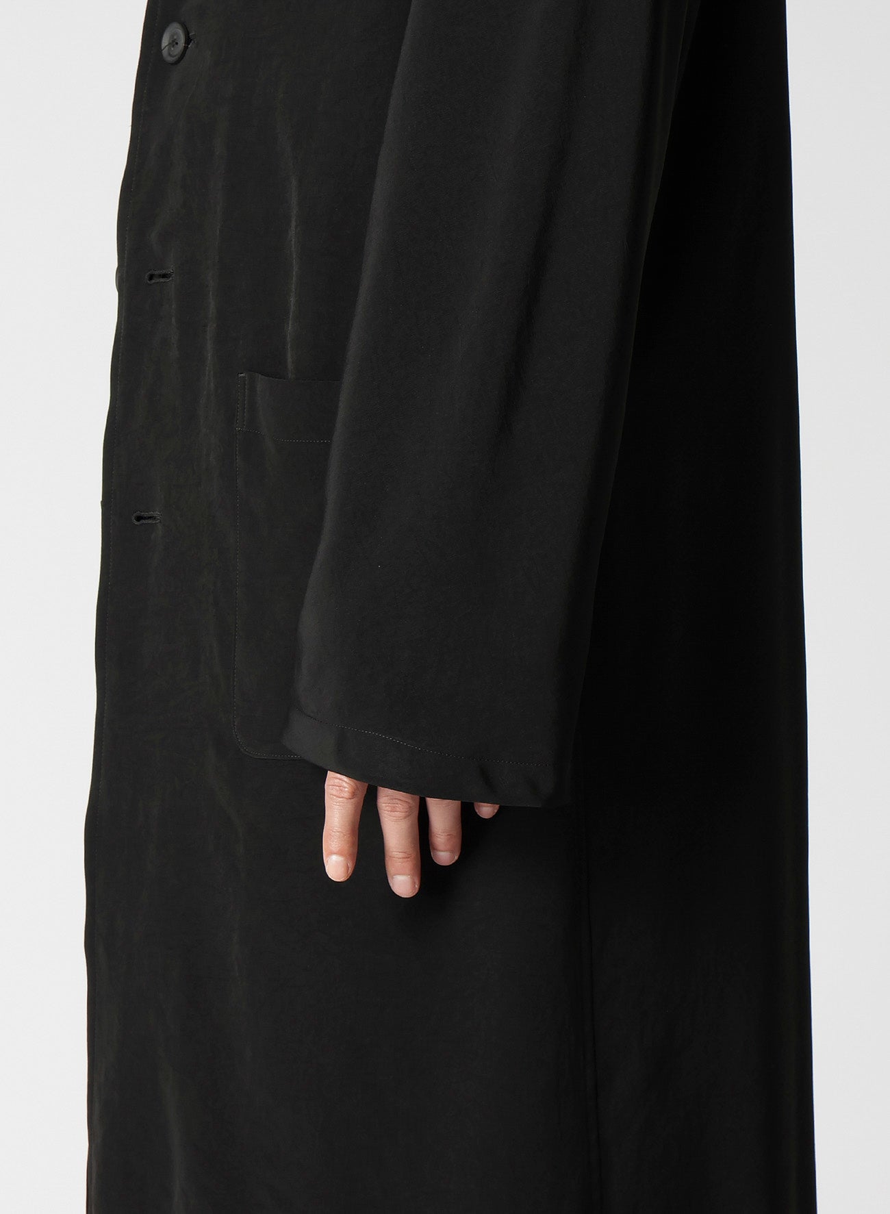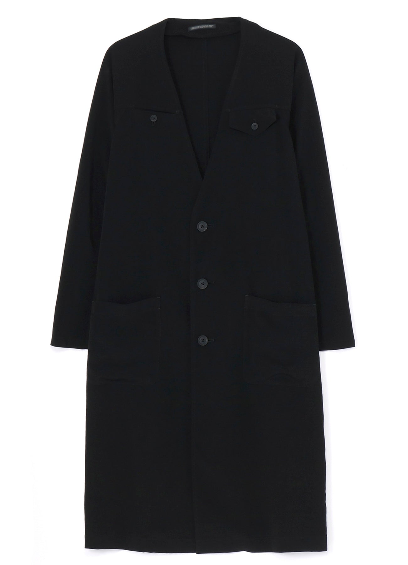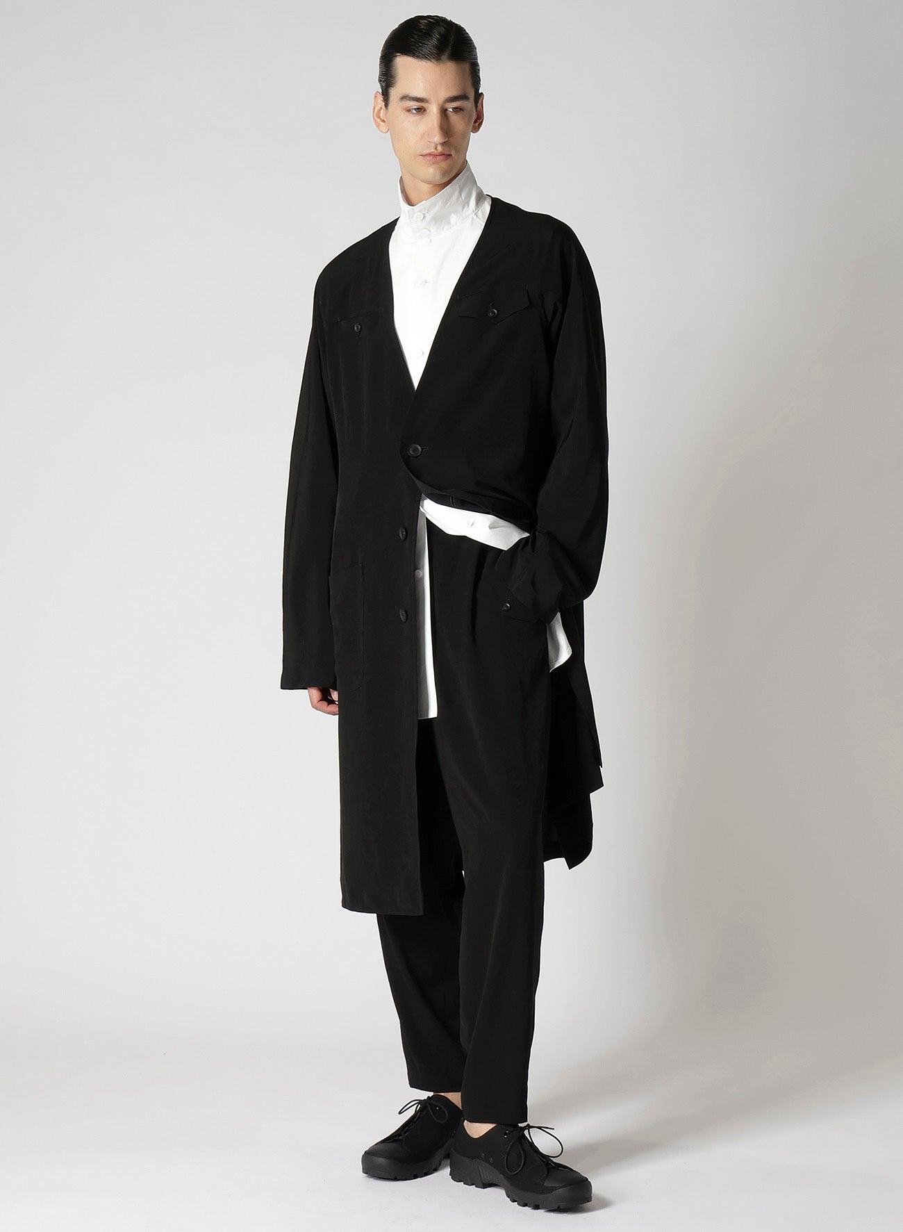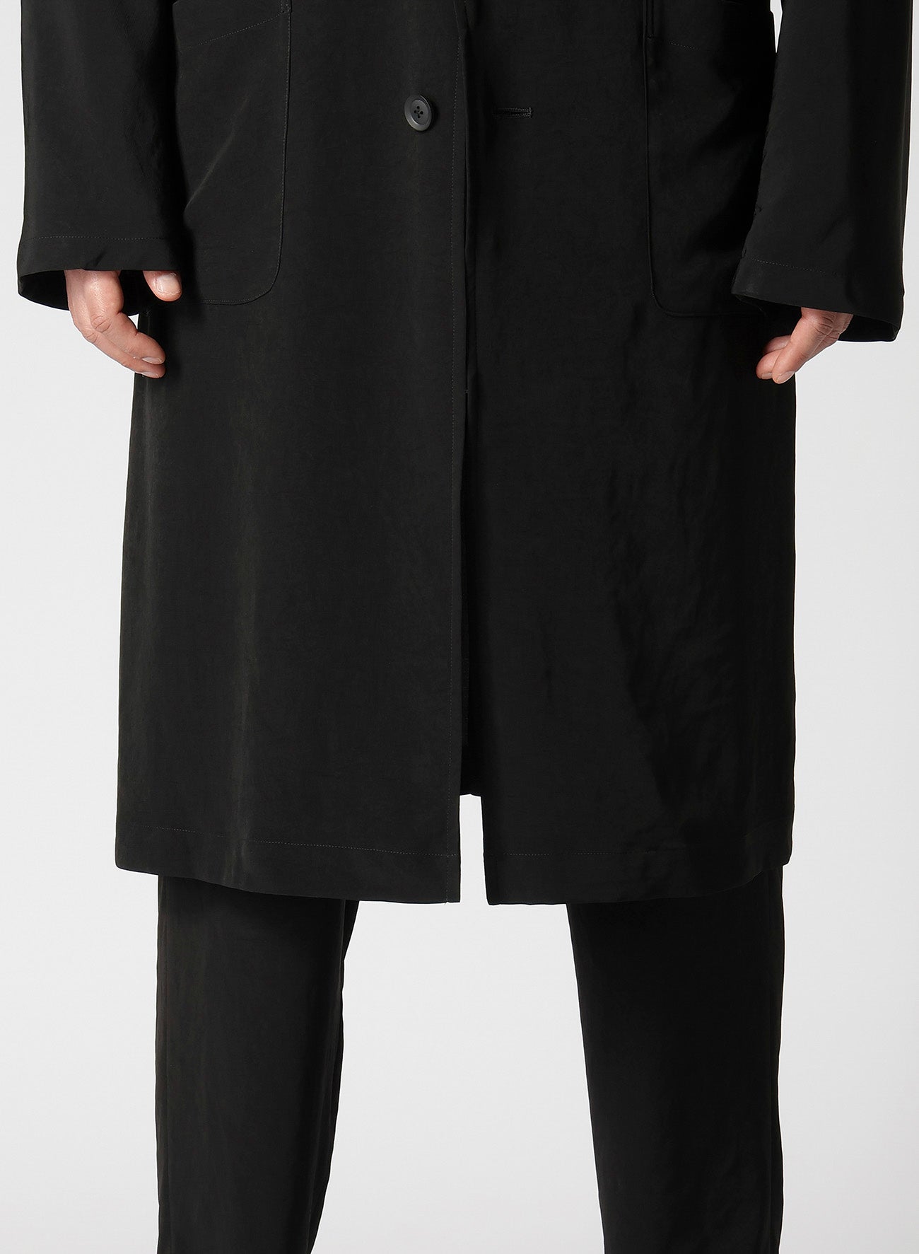 Un abrigo de vestido sin cuello hecho de material de esmoquin, caracterizado por un brillo suave y una sensación de alta gama. La tela, tejida de manera ajustada con hilo de torsión fuerte en la dirección horizontal, asegura una caída impresionante. Las costuras de overlock de una sola capa complementan la tela, resultando en una caída ricamente texturizada.