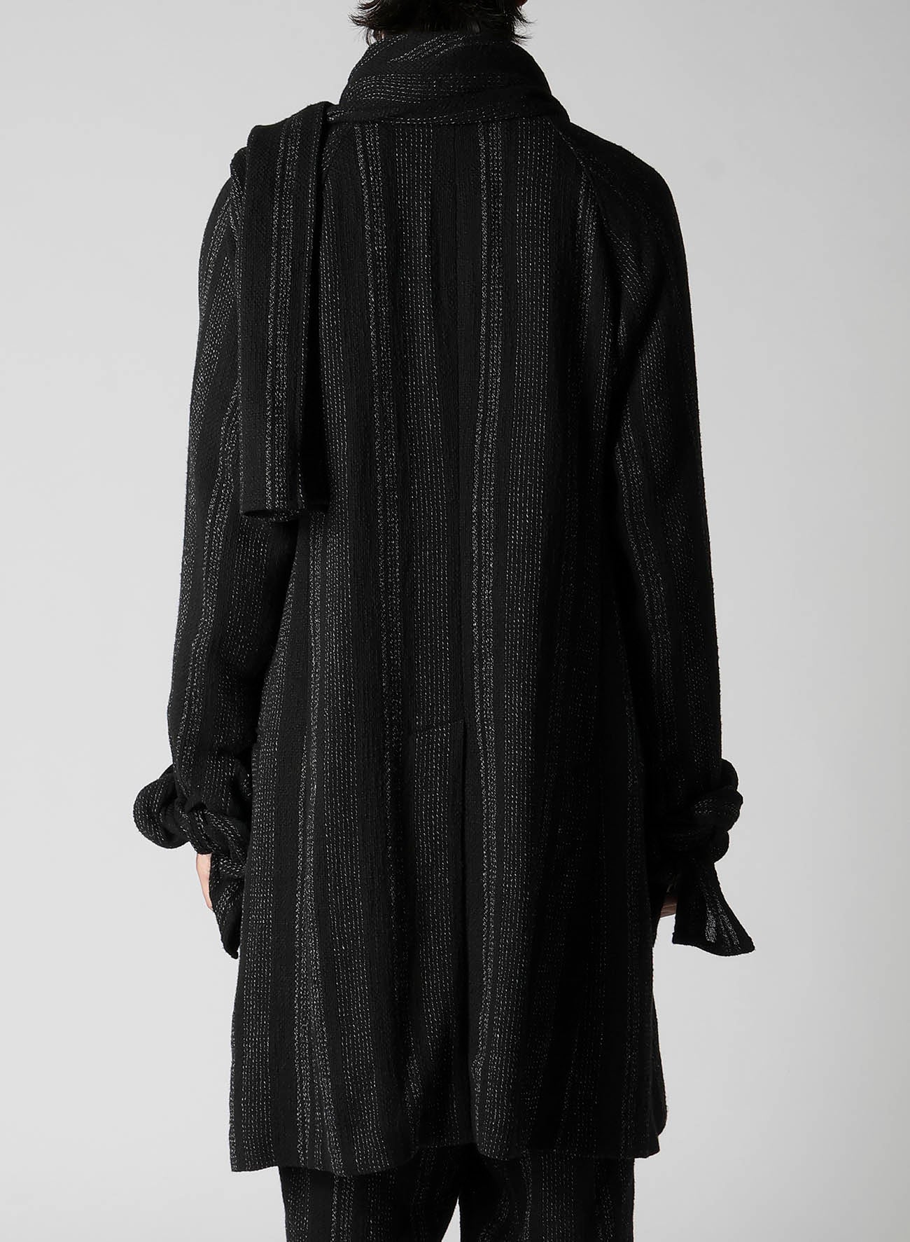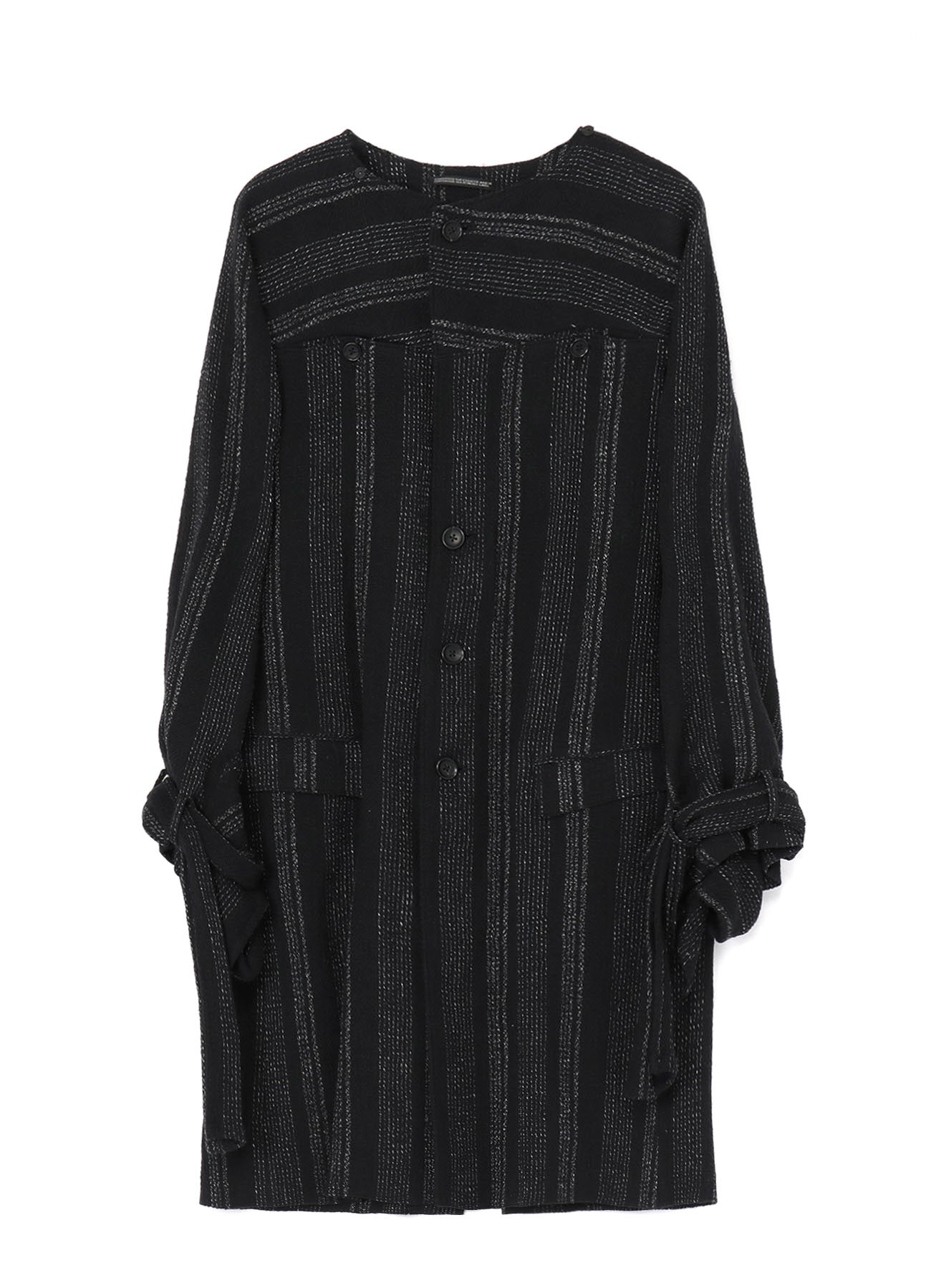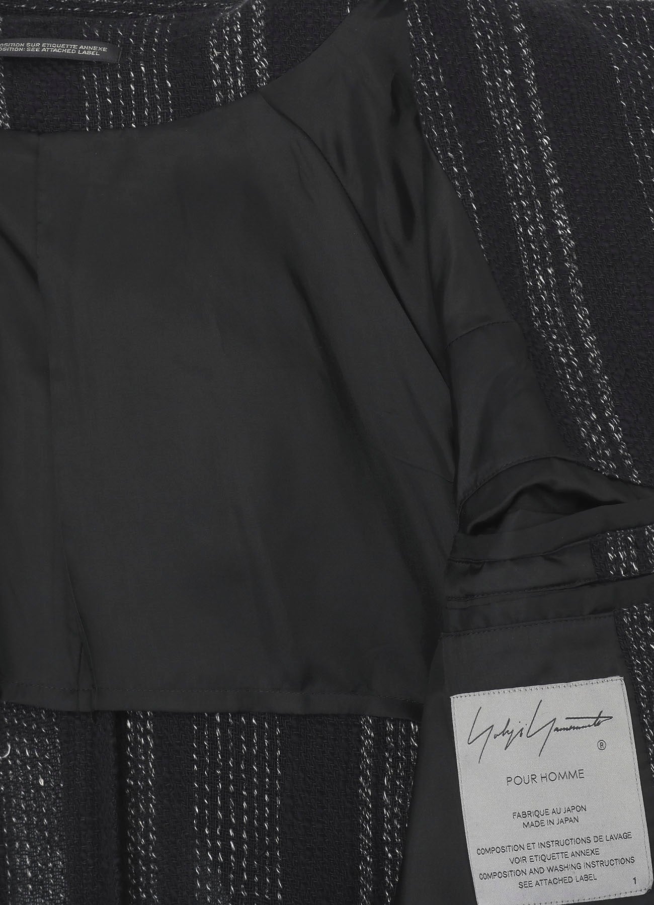 Esta chaqueta sin cuello de manga raglán y patrón a rayas de LOOK3 presenta una textura única, gracias al uso de hilo doble retorcido. El hilo, hecho de algodón grueso, resulta en irregularidades notables y variaciones de superficie distintas.